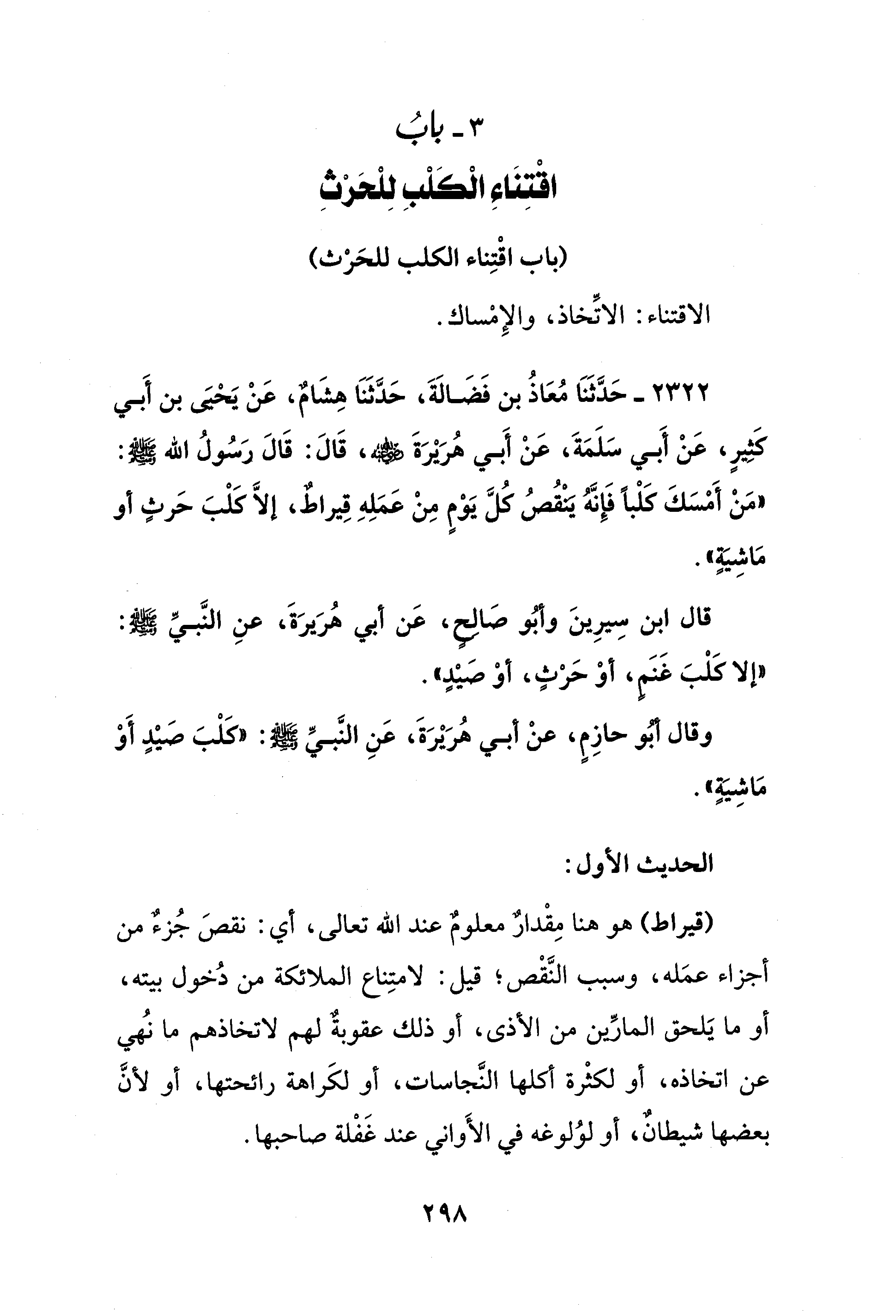 2322 - حَدَّثَنَا مُعَاذُ بن فَضَالَةَ، حَدَّثَنَا هِشَامٌ، عَنْ يَحْيَى بن أَبي كَثِيرٍ، عَنْ أَبي سَلَمَةَ، عَنْ أَبي هُرَيْرَةَ - رضي الله عنه -، قَالَ: قَالَ رَسُولُ الله - صلى الله عليه وسلم -: "مَنْ أَمْسَكَ كَلْبًا فَإِنَّهُ يَنْقُصُ كُلَّ يَوْمٍ مِنْ عَمَلِهِ قِيراطٌ، إلَّا كَلْبَ حَرثٍ أو مَاشِيَةٍ".