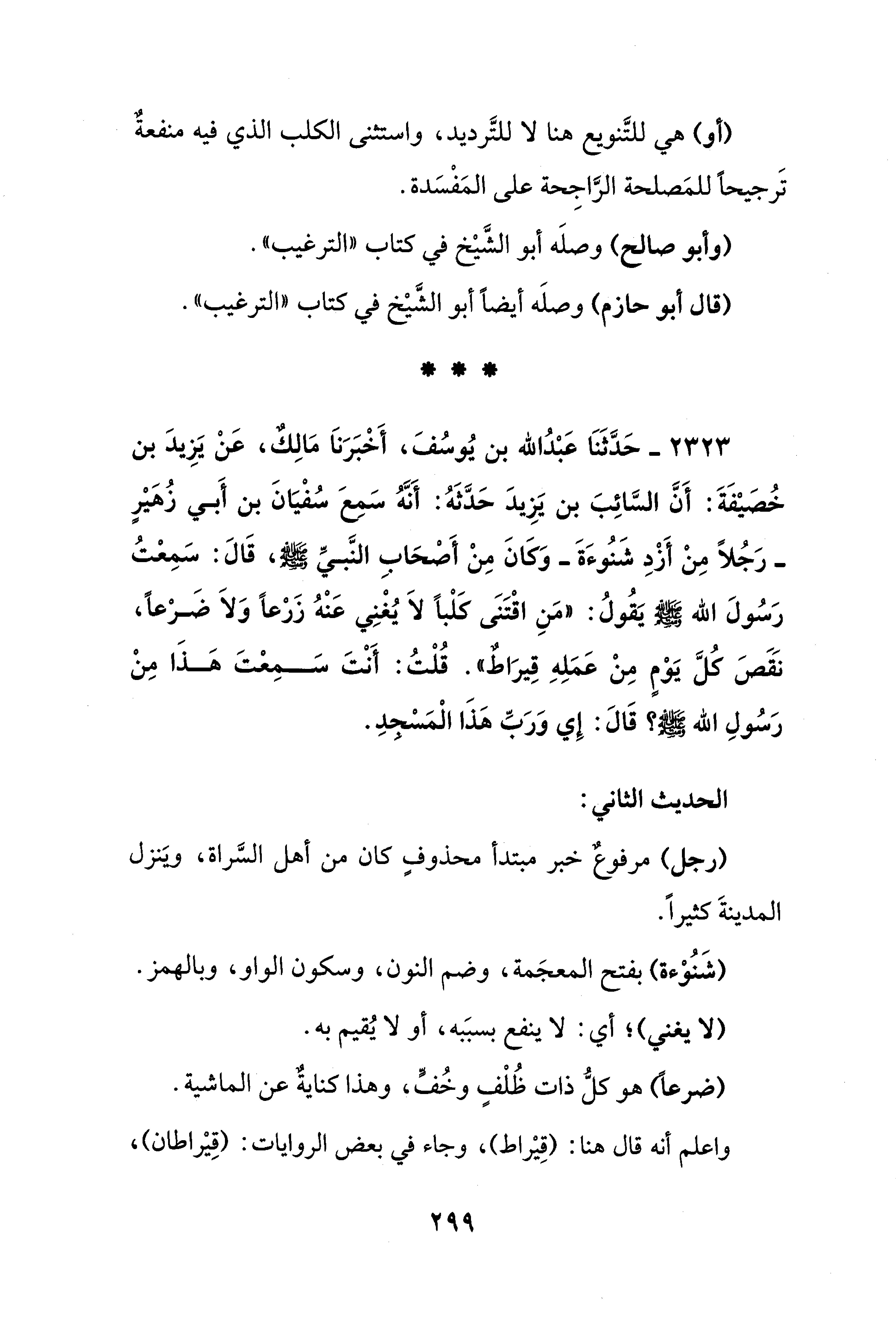 2323 - حَدَّثَنَا عَبْدُ الله بن يُوسُفَ، أَخْبَرَناَ مَالِكٌ، عَنْ يَزِيدَ بن خُصَيْفَةَ: أَنَّ السَّائِبَ بن يَزِيدَ حَدَّثَهُ: أَنَّهُ سَمِعَ سُفْيَانَ بن أَبي زُهَيْرٍ -رَجُلًا مِنْ أَزْدِ شَنُوءَةَ- وَكانَ مِنْ أَصْحَابِ النَّبيِّ - صلى الله عليه وسلم -، قَالَ: سَمِعْتُ رَسُولَ الله - صلى الله عليه وسلم - يَقُولُ: "مَنِ اقْتَنَى كلْبًا لاَ يُغْنِي عَنْهُ زَرْعًا وَلاَ ضَرْعًا، نَقَصَ كُلَّ يَوْمٍ مِنْ عَمَلِهِ قِيرَاطٌ". قُلْتُ: أَنْتَ سَمِعْتَ هَذَا مِنْ رَسُولِ الله - صلى الله عليه وسلم -؟ قَالَ: إِي وَرَبِّ هَذَا الْمَسْجدِ.