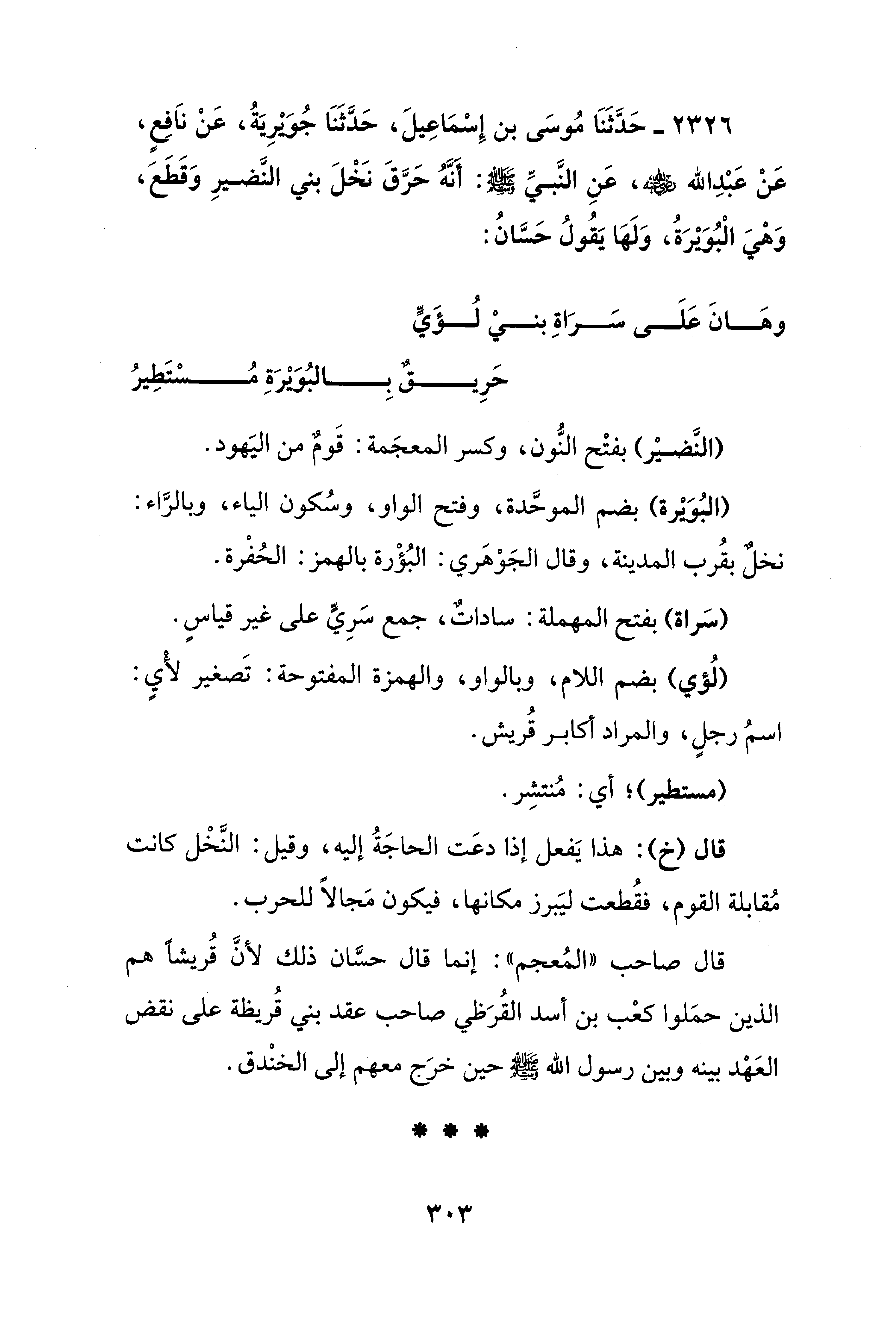 2326 - حَدَّثَنَا مُوسَى بن إِسْمَاعِيلَ، حَدَّثَنَا جُوَيْرِيَةُ، عَنْ ناَفِعٍ، عَنْ عَبْدِ الله - رضي الله عنه -، عَنِ النَّبيِّ - صلى الله عليه وسلم -: أَنَّهُ حَرَّقَ نَخْلَ بني النَّضيرِ وَقَطَعَ، وَهْيَ الْبُويْرَةُ، وَلَهَا يَقُولُ حَسَّانُ: