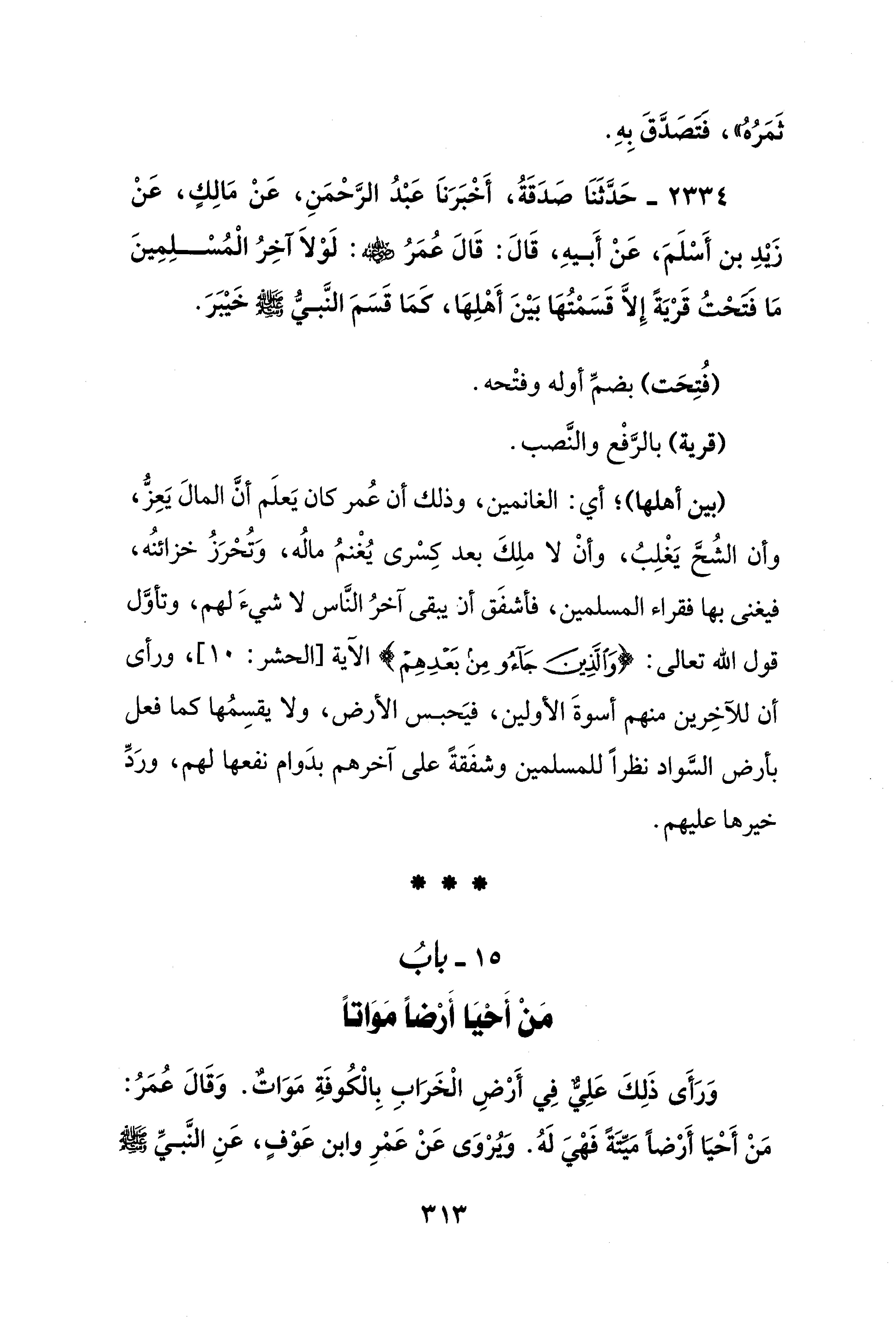 2334 - حَدَّثَنَا صَدَقَةُ، أَخْبَرَناَ عَبْدُ الرَّحْمَنِ، عَنْ مَالِكٍ، عَنْ زَيْدِ بن أَسْلَمَ، عَنْ أَبيهِ، قَالَ: قَالَ عُمَرُ - رضي الله عنه -: لَوْلاَ آخِرُ الْمُسْلِمِينَ مَا فتحْتُ قَرْيَةً إِلَّا قَسَمْتُهَا بَيْنَ أَهْلِهَا، كَمَا قَسَمَ النَّبيُّ - صلى الله عليه وسلم - خَيْبَرَ.