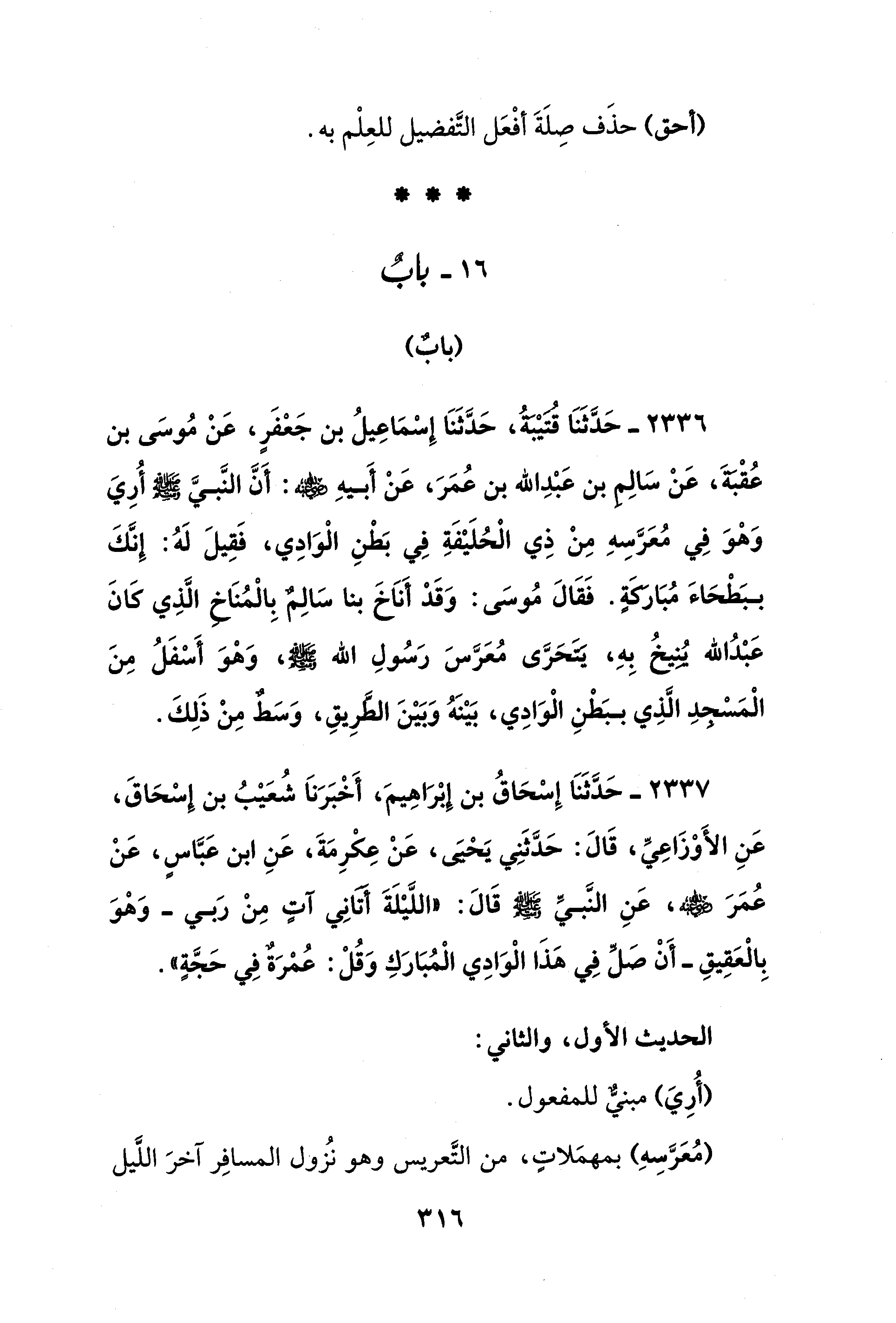 2336 - حَدَّثَنَا قُتَيْبَةُ، حَدَّثَنَا إِسْمَاعِيلُ بن جَعْفَرٍ، عَنْ مُوسَى بن عُقْبَةَ، عَنْ سَالِم بن عَبْدِ الله بن عُمَرَ، عَنْ أَبيهِ - رضي الله عنه -: أَنَّ النَّبيَّ - صلى الله عليه وسلم - أُرِيَ وَهْوَ فِي مُعَرَّسِهِ مِنْ ذِي الْحُلَيْفَةِ فِي بَطْنِ الْوَادِي، فَقِيلَ لَهُ: إِنَّكَ ببَطْحَاءَ مُبَاركَةٍ. فَقَالَ مُوسَى: وَقَدْ أَنَاخَ بنا سَالِمٌ بِالْمُنَاخ الَّذِي كَانَ عَبْدُ الله. يُنِيخُ بِهِ، يَتَحَرَّى مُعَرَّسَ رَسُولِ الله - صلى الله عليه وسلم -، وَهْوَ أَسْفَلُ مِنَ الْمَسْجدِ الَّذِي ببَطْنِ الْوَادِي، بَيْنَهُ وَبَيْنَ الطَّرِيقِ، وَسَطٌ مِنْ ذَلِكَ.
