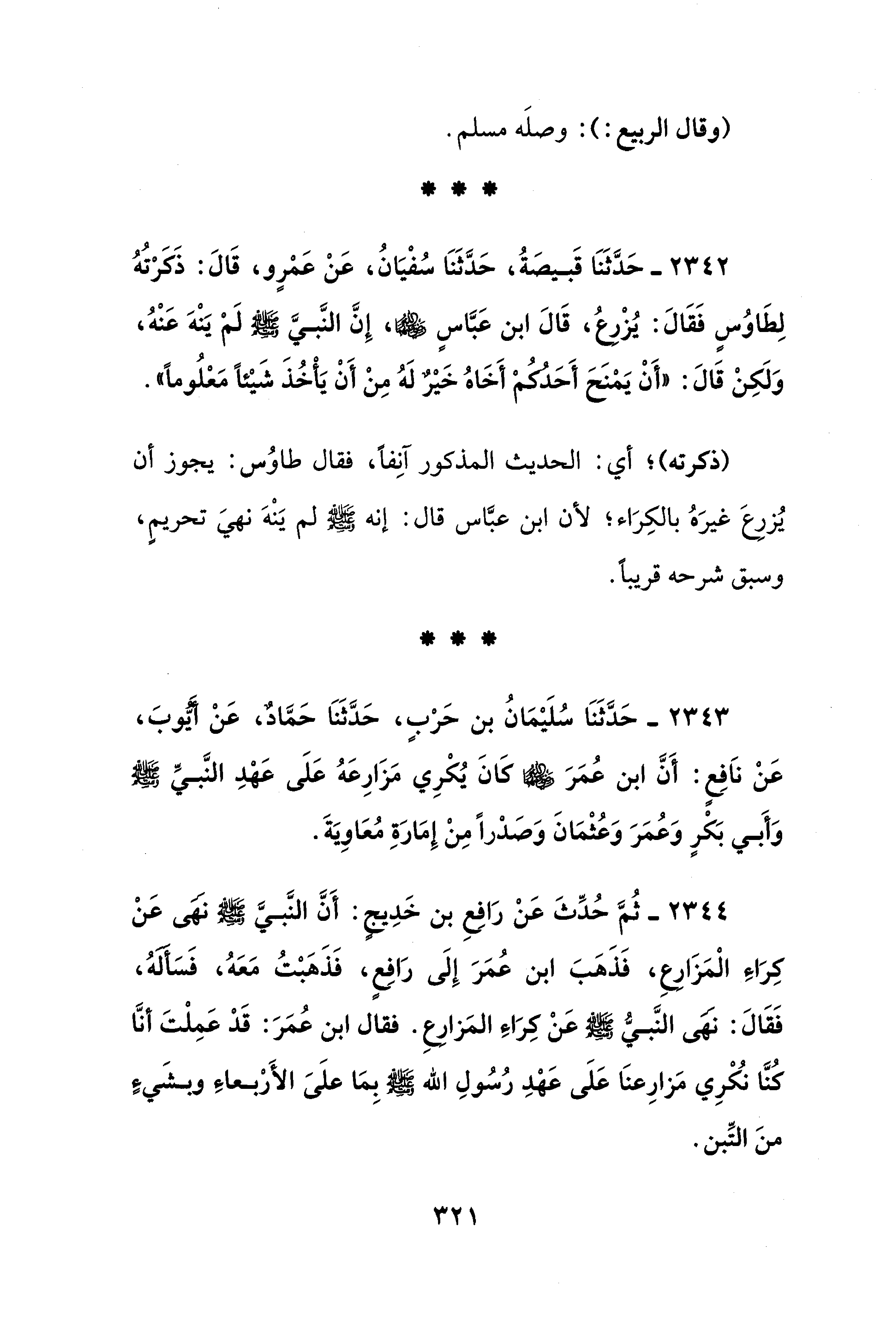 2344 - ثُمَّ حُدِّثَ عَنْ رَافِعِ بن خَدِيجٍ: أَنَّ النَّبيَّ - صلى الله عليه وسلم - نَهَى عَنْ كِرَاءِ الْمَزَارعِ، فَذَهَبَ ابن عُمَرَ إِلَى رَافِعٍ، فَذَهَبْتُ مَعَهُ، فَسَأَلَهُ، فَقَالَ: نَهَى النَّبيُّ - صلى الله عليه وسلم - عَنْ كِرَاءِ المَزارِعِ. فقال ابن عُمَرَ: قَدْ عَمِلْتَ أنَّا كُنَّا نُكْرِي مَزارِعنَا عَلَى عَهْدِ رُسُولِ الله - صلى الله عليه وسلم - بِمَا علَىَ الأَرْبعاءِ وبشَيءٍ منَ التِّبن.