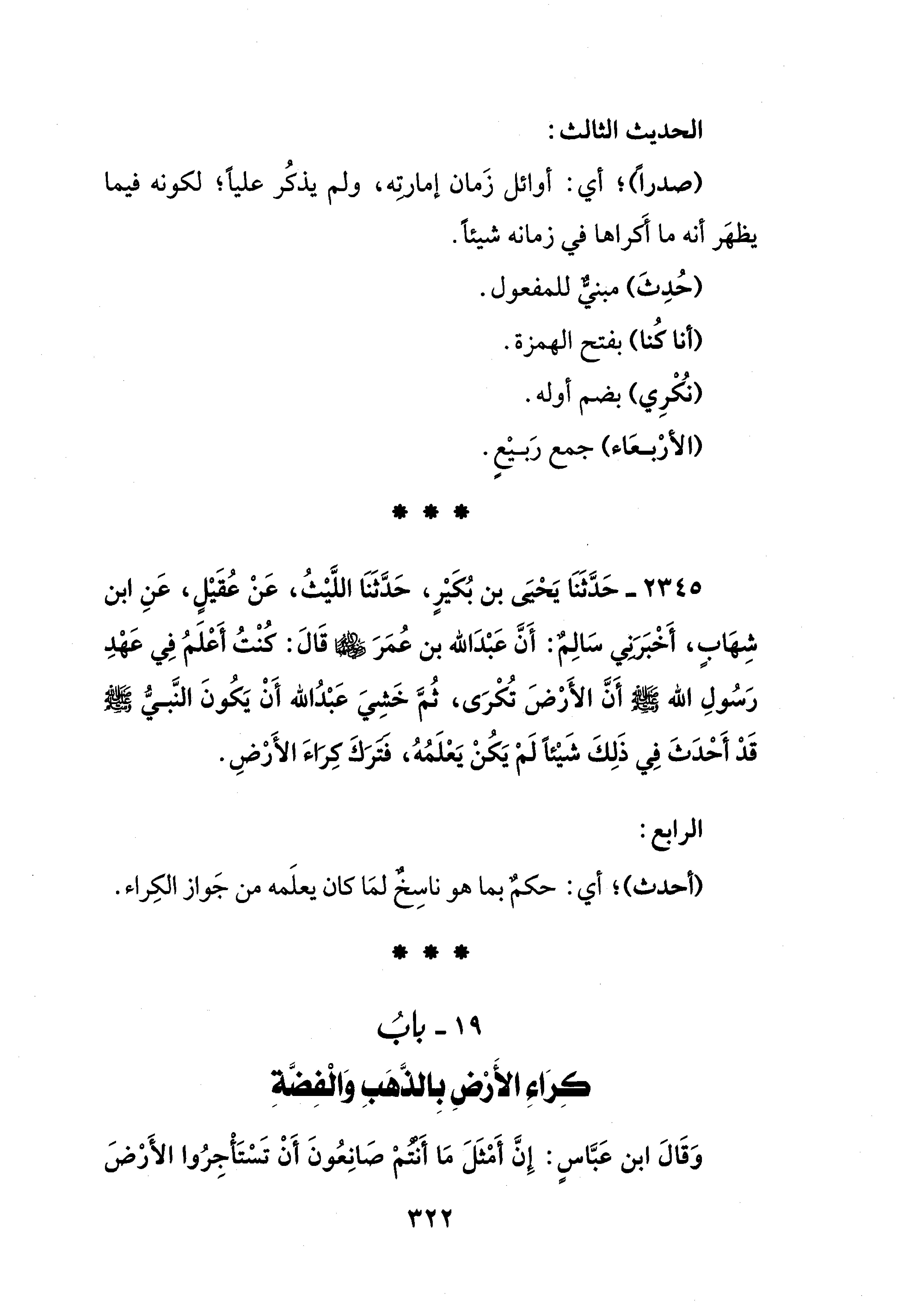 2345 - حَدَّثَنَا يَحْيَى بن بُكَيْرٍ، حَدَّثَنَا اللَّيْثُ، عَنْ عُقَيْل، عَنِ ابن شِهَابٍ، أَخْبَرَنِي سَالِمٌ: أَنَّ عَبْدَ الله بن عُمَرَ - رضي الله عنهما - قَالَ: كُنْتُ أَعْلَمُ فِي عَهْدِ رَسُولِ الله - صلى الله عليه وسلم - أَنَّ الأَرْضَ تُكْرَى، ثُمَّ خَشِيَ عَبْدُ الله أَنْ يَكُونَ النَّبيُّ - صلى الله عليه وسلم - قَدْ أَحْدَثَ فِي ذَلِكَ شَيْئًا لَمْ يَكُنْ يَعْلَمُهُ، فترَكَ كِرَاءَ الأَرْضِ.