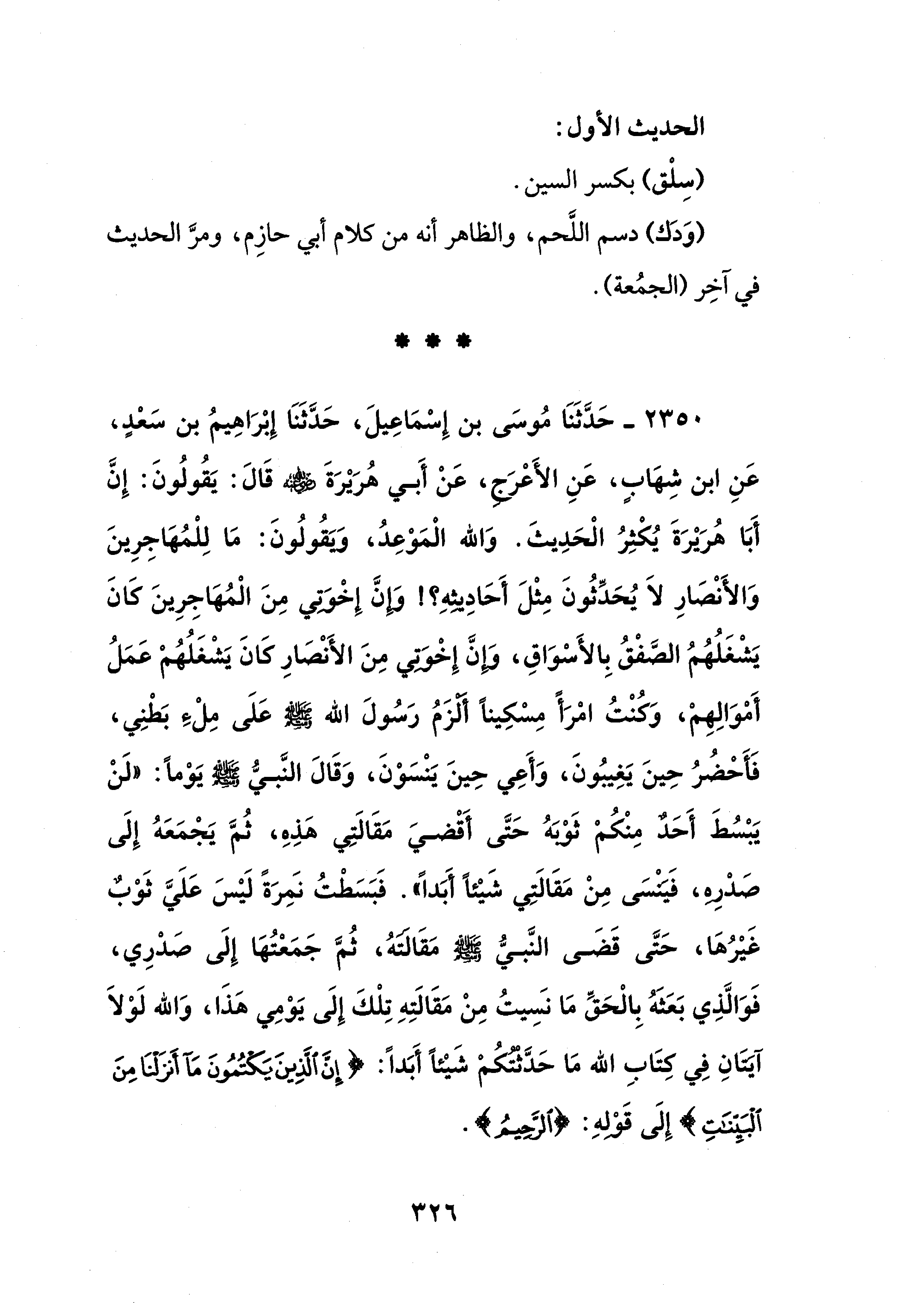 2350 - حَدَّثَنَا مُوسَى بن إِسْمَاعِيلَ، حَدَّثَنَا إِبْرَاهِيمُ بن سَعْدٍ، عَنِ ابن شِهَابٍ، عَنِ الأَعْرَجٍ، عَنْ أَبي هُرَيْرَةَ - رضي الله عنه - قَالَ: يَقُولُونَ: إِنَّ أَبَا هُرَيْرَةَ يُكْثِرُ الْحَدِيثَ. وَالله الْمَوْعِدُ، وَيَقُولُونَ: مَا لِلْمُهَاجِرِينَ وَالأَنْصَارِ لاَ يُحَدِّثُونَ مِثْلَ أَحَادِيثهِ؟! وَإِنَّ إِخْوَتِي مِنَ الْمُهَاجِرِينَ كَانَ يَشْغَلُهُمُ الصَّفْقُ بِالأَسْوَاقِ، وَإِنَّ إِخْوَتِي مِنَ الأَنْصَارِ كَانَ يَشْغَلُهُمْ عَمَلُ أَمْوَالِهِمْ، وَكنْتُ امْرَأً مِسْكِينًا أَلْزَمُ رَسُولَ الله - صلى الله عليه وسلم - عَلَى مِلْءِ بَطْنِي، فَأَحْضُرُ حِينَ يَغِيبُونَ، وَأَعِي حِينَ يَنْسَونَ، وَقَالَ النَّبيُّ - صلى الله عليه وسلم - يَوْمًا: "لَنْ يَبْسُطَ أَحَدٌ مِنْكُمْ ثَوْبَهُ حَتَّى أَقْضيَ مَقَالَتِي هَذِهِ، ثُمَّ يَجْمَعَهُ إِلَى صَدْرِهِ، فَيَنْسَى مِنْ مَقَالَتِي شَيْئًا أَبَدًا". فَبَسَطْتُ نَمِرَةً لَيْسَ عَلَيَّ ثَوْبٌ غَيْرُهَا، حَتَّى قَضَى النَّبيُّ - صلى الله عليه وسلم - مَقَالَتَهُ، ثُمَّ جَمَعْتُهَا إلَى صَدْرِي، فَوَالَّذِي بَعَثَهُ بِالْحَقِّ مَا نسِيتُ مِنْ مَقَالَتِهِ تِلْكَ إِلَى يَوْمِي هَذَا، وَالله لَوْلاَ آيَتَانِ فِي كتَابِ الله مَا حَدَّثْتُكُمْ شَيْئًا أَبَدًا: {إِنَّ الَّذِينَ يَكْتُمُونَ مَا أَنْزَلْنَا مِنَ الْبَيِّنَاتِ} إِلَى قَوْلهِ: {الرَّحِيمُ}.