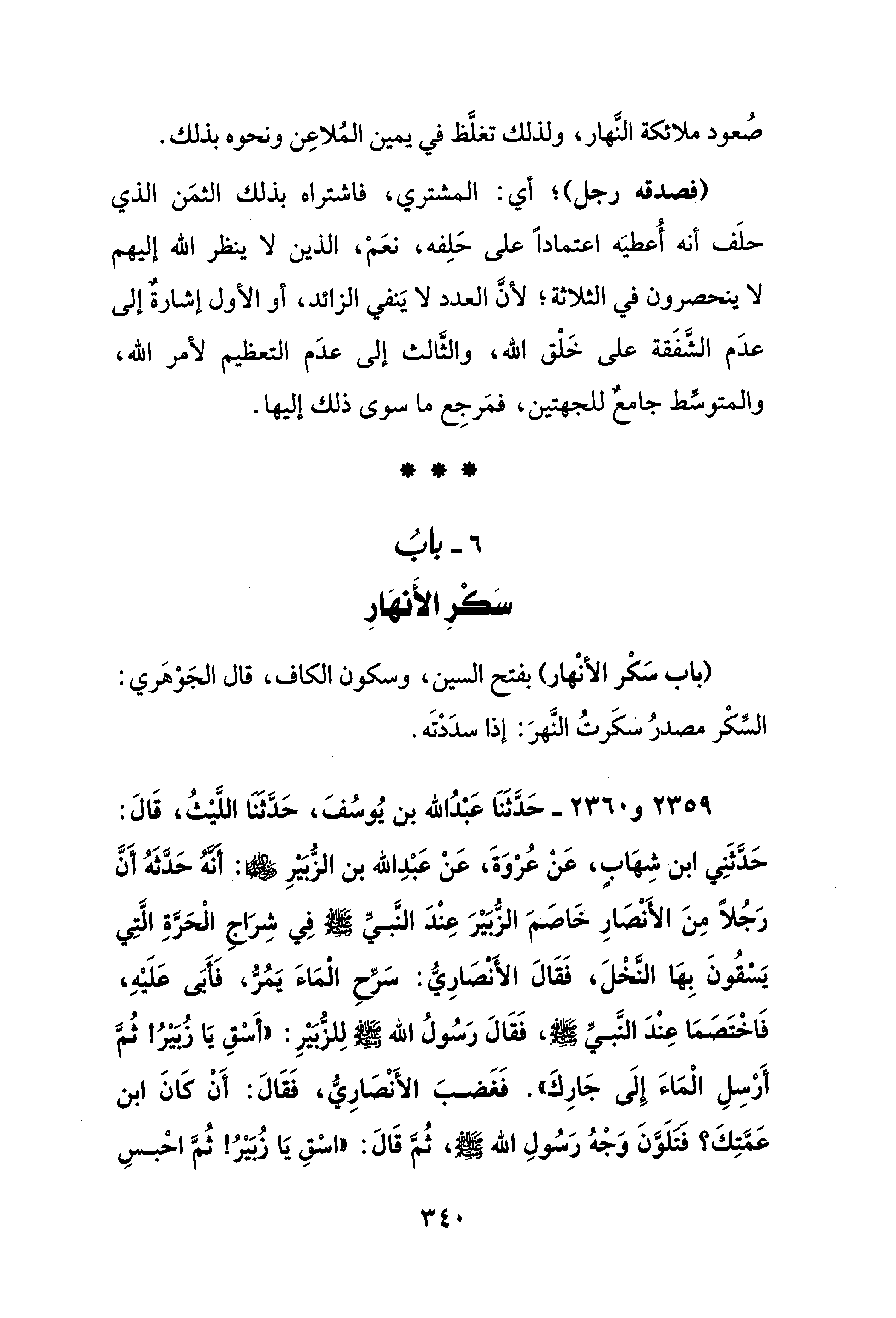 2359 - و 2360 - حَدَّثَنَا عَبْدُ الله بن يُوسُفَ، حَدَّثَنَا اللَّيْثُ، قَالَ: حَدَّثَنِي ابن شِهَابٍ، عَنْ عُرْوَةَ، عَنْ عَبْدِ الله بن الزُّبَيْرِ - رضي الله عنهما -: أنَّهُ حَدَّثَهُ أَنَّ رَجُلًا مِنَ الأَنْصَارِ خَاصَمَ الزُّبَيْرَ عِنْدَ النَّبيِّ - صلى الله عليه وسلم - فِي شِرَاجِ الْحَرَّةِ الَّتِي يَسْقُونَ بِهَا النَّخْلَ، فَقَالَ الأَنْصَارِيُّ: سَرِّحِ الْمَاءَ يَمُرُّ، فَأَبَى عَلَيْهِ، فَاخْتَصَمَا عِنْدَ النَّبيِّ - صلى الله عليه وسلم -، فَقَالَ رَسُولُ الله - صلى الله عليه وسلم - لِلزُّبَيْرِ: "أَسْقِ يَا زُبَيْرُ! ثُمَّ أَرْسِلِ الْمَاءَ إِلَى جَارِكَ". فَغَضبَ الأَنْصَارِيُّ، فَقَالَ: أَنْ كَانَ ابن عَمَّتِكَ؟ فتَلَوَّنَ وَجْهُ رَسُولِ الله - صلى الله عليه وسلم -، ثُمَّ قَالَ: "اسْقِ يَا زُبَيْرُ! ثُمَّ احْبسِ