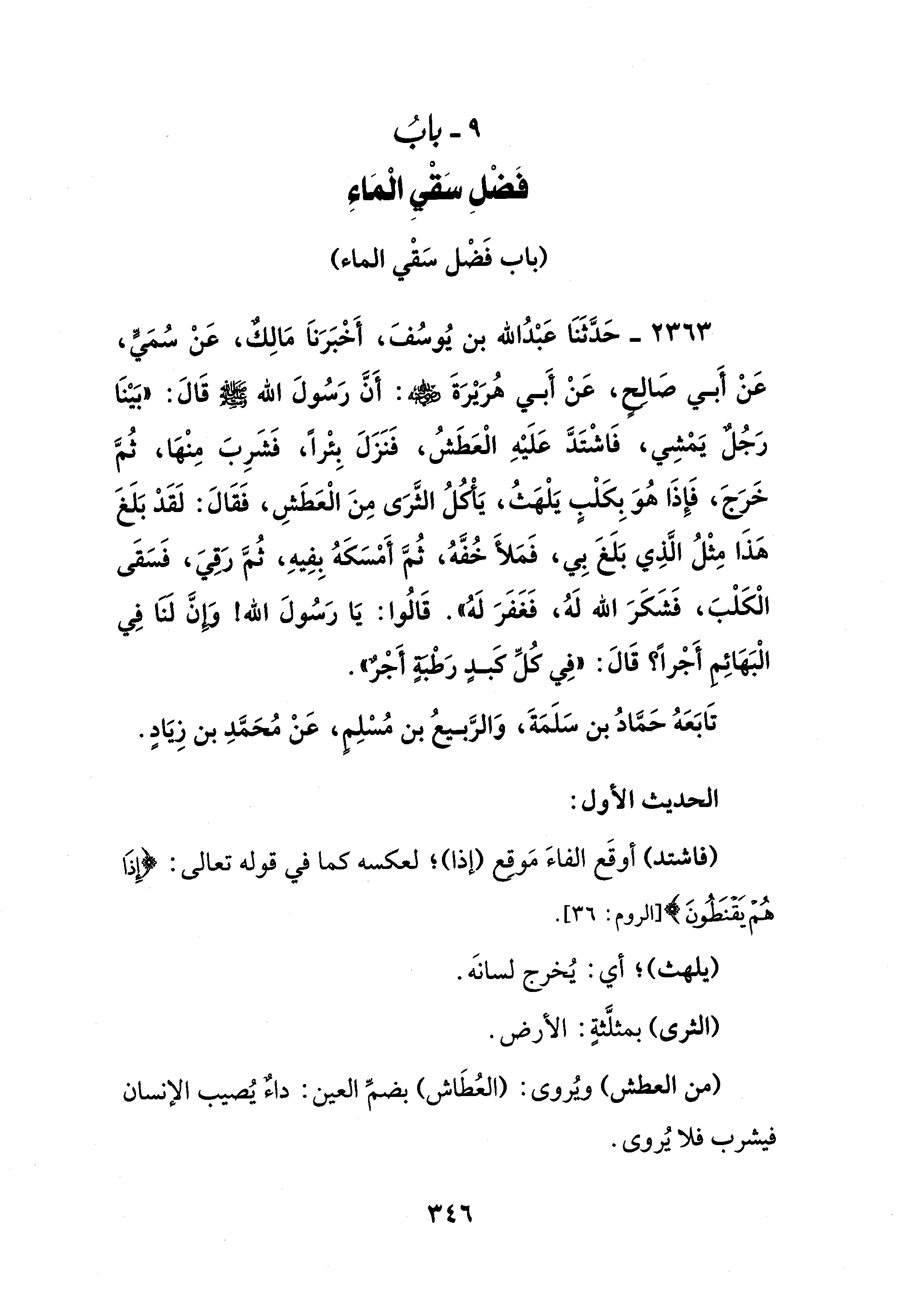 2363 - حَدَّثَنَا عَبْدُ الله بن يُوسُفَ، أَخْبَرَنَا مَالِكٌ، عَنْ سُمَيٍّ، عَنْ أَبي صَالِحٍ، عَنْ أَبي هُرَيرَةَ - رضي الله عنه -: أَنَّ رَسُولَ الله - صلى الله عليه وسلم - قَالَ: "بَيْنَا رَجُلٌ يَمْشِي، فَاشْتَدَّ عَلَيْهِ الْعَطَشُ، فَنَزَلَ بِئْرًا، فَشَرِبَ مِنْهَا، ثُمَّ خَرَجَ، فَإِذَا هُوَ بِكَلْبٍ يَلْهَثُ، يَأْكُلُ الثَّرَى مِنَ الْعَطَشِ، فَقَالَ: لَقَدْ بَلَغَ هَذَا مِثْلُ الَّذِي بَلَغَ بِي، فَمَلأَ خُفَّهُ، ثُمَّ أَمْسَكَهُ بِفِيهِ، ثُمَّ رَقِيَ، فَسَقَى الْكَلْبَ، فَشَكَرَ الله لَهُ، فَغَفَرَ لَهُ". قَالُوا: يَا رَسُولَ الله! وَإِنَّ لَنَا فِي الْبَهَائِم أَجْرًا؟ قَالَ: "فِي كُلِّ كَبدٍ رَطْبَةٍ أَجْرٌ".