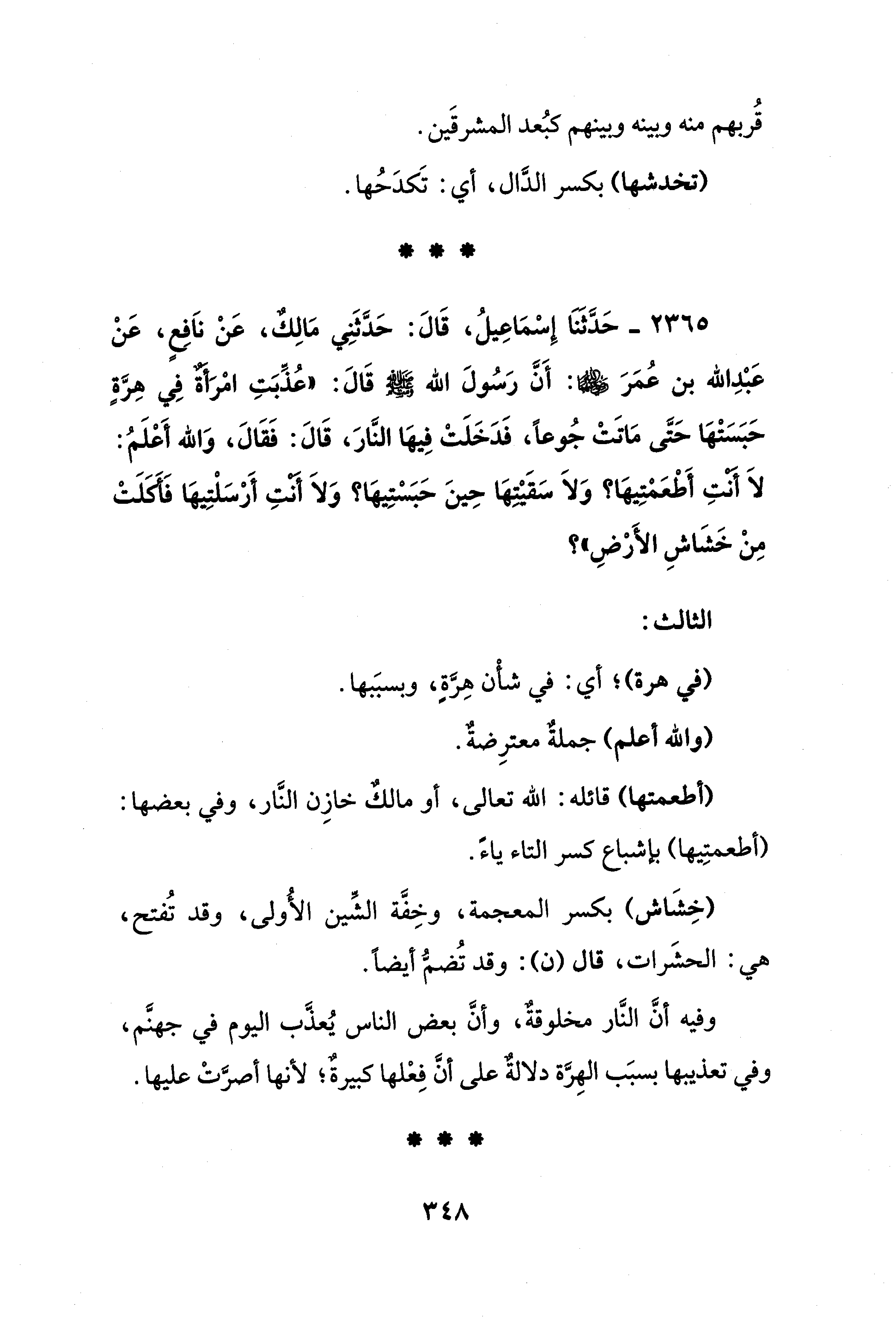 2365 - حَدَّثَنَا إِسْمَاعِيلُ، قَالَ: حَدَّثَنِي مَالِكٌ، عَنْ ناَفِعٍ، عَنْ عَبْدِ الله بن عُمَرَ - رضي الله عنهما -: أَنَّ رَسُولَ الله - صلى الله عليه وسلم - قَالَ: "عُذِّبَتِ أمْرَأَةٌ فِي هِرَّةٍ حَبَسَتْهَا حَتَّى مَاتَتْ جُوعًا، فَدَخَلَتْ فِيهَا النَّارَ، قَالَ: فَقَالَ، وَالله أَعْلَمُ: لاَ أنتِ أَطْعَمْتِيهَا؟ وَلاَ سَقَيْتِهَا حِينَ حَبَسْتِيهَا؟ وَلاَ أَنْتِ أَرْسَلْتِيهَا فَأَكلَتْ مِنْ خَشَاشِ الأَرْضِ"؟