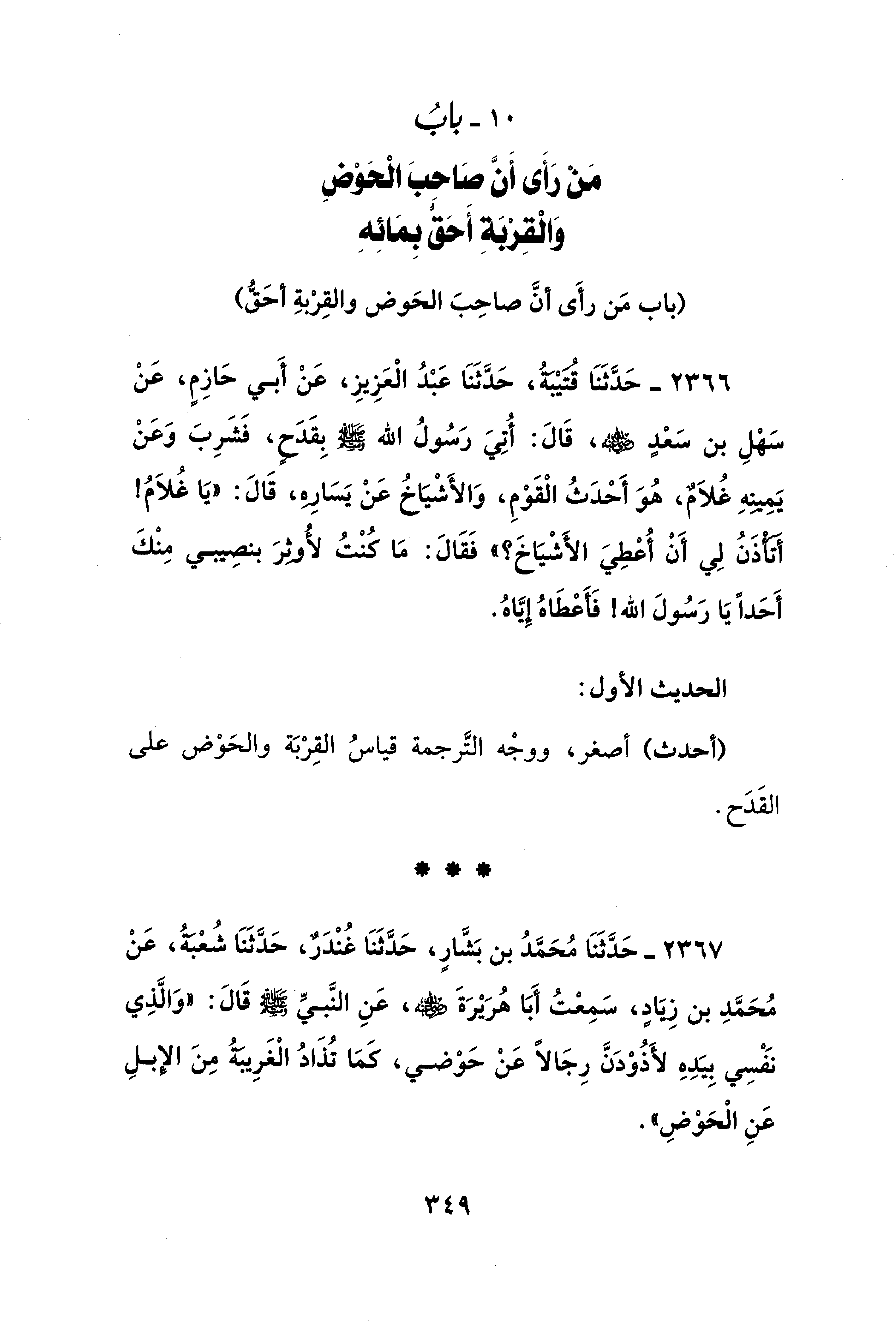 2366 - حَدَّثَنَا قُتَيْبةُ، حَدَّثَنَا عَبْدُ الْعَزِيزِ، عَنْ أَبي حَازِمٍ، عَنْ سَهْلِ بن سَعْدٍ - رضي الله عنه -، قَالَ: أُتِيَ رَسُولُ الله - صلى الله عليه وسلم - بِقَدَحٍ، فَشَرِبَ وَعَنْ يَمِينِهِ غُلاَمٌ، هُوَ أَحْدَثُ الْقَوْمِ، وَالأَشيَاخُ عَنْ يَسَارِهِ، قَالَ: "يَا غُلاَمُ! أَتَأْذَنُ لِي أَنْ أُعْطِيَ الأَشيَاخَ؟ " فَقَالَ: مَا كُنْتُ لأُوثِرَ بنصِيبي مِنْكَ أَحَدًا يَا رَسُولَ الله! فَأَعْطَاهُ إِيَّاهُ.