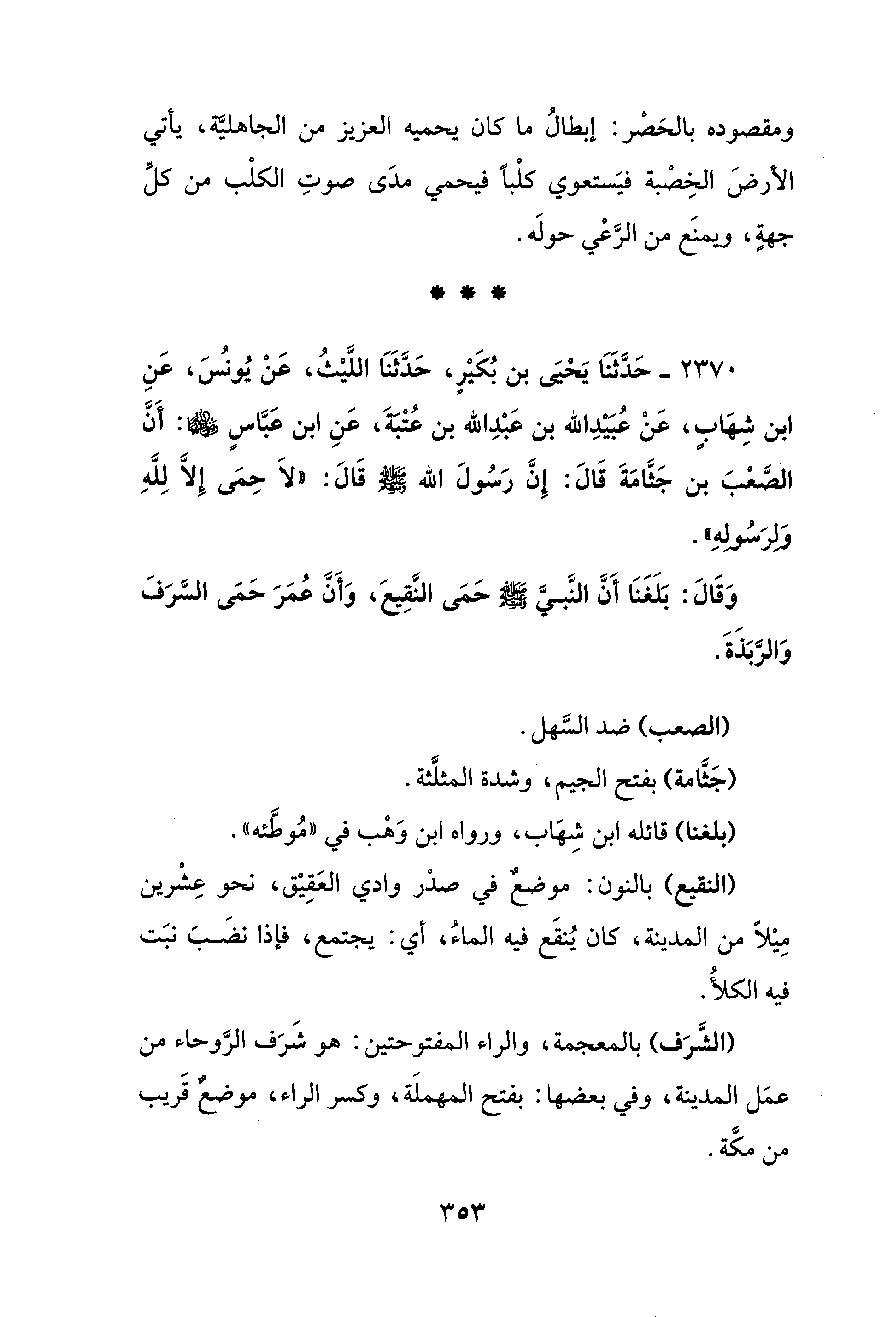 2370 - حَدَّثَنَا يَحْيَى بن بُكَيْرٍ، حَدَّثَنَا اللَّيْثُ، عَنْ يُونُسَ، عَنِ ابن شِهَابٍ، عَنْ عُبَيْدِ الله بن عَبْدِ الله بن عُتْبَةَ، عَنِ ابن عَبَّاسٍ - رضي الله عنهما -: أَنَّ الصَّعْبَ بن جَثَّامَةَ قَالَ: إِنَّ رَسُولَ الله - صلى الله عليه وسلم - قَالَ: "لاَ حِمَى إِلَّا لِلَّهِ وَلرَسُولِهِ".
