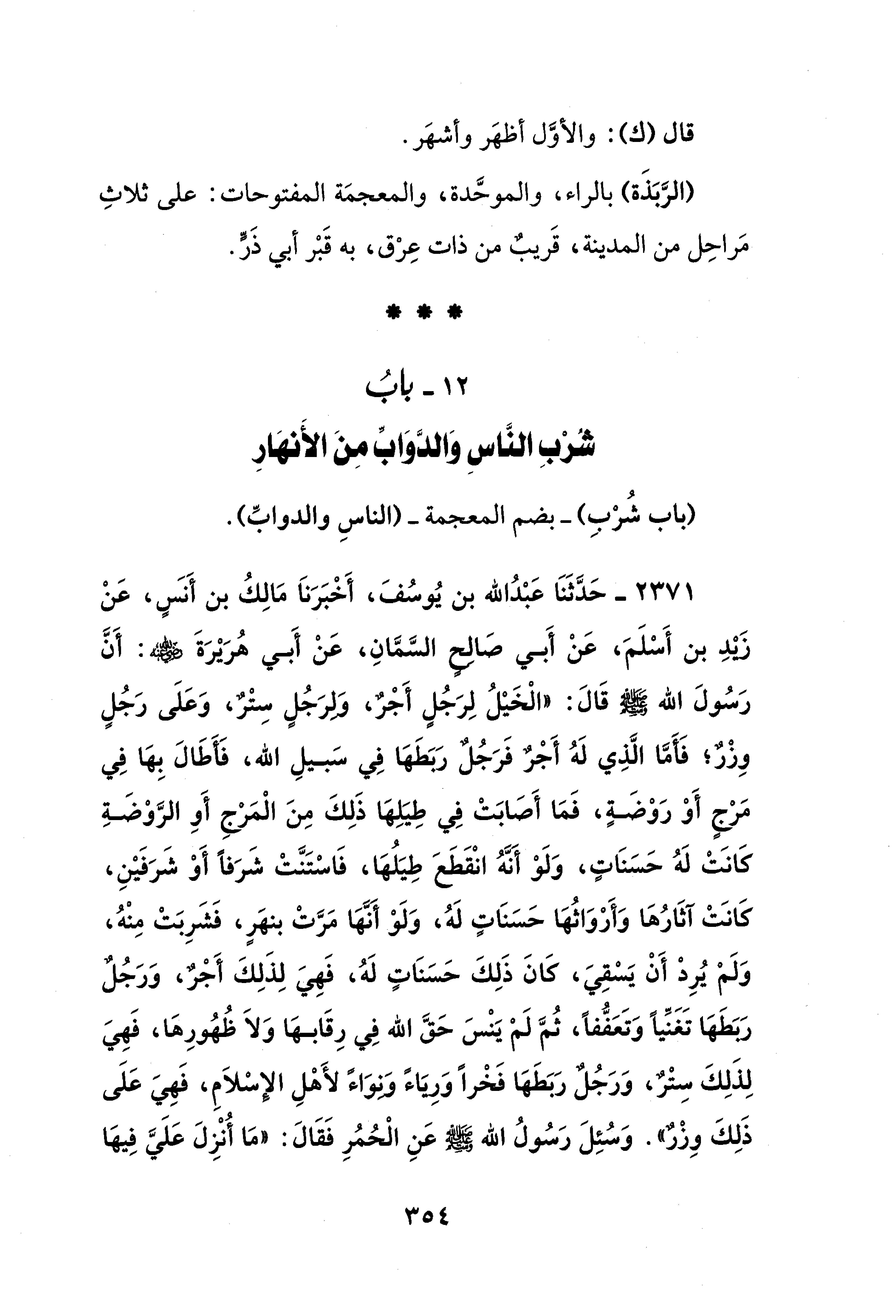 2371 - حَدَّثَنَا عَبْدُ الله بن يُوسُفَ، أَخْبَرَنَا مَالِكُ بن أَنسٍ، عَنْ زيدِ بن أَسْلَمَ، عَنْ أَبي صَالِحٍ السَّمَّانِ، عَنْ أَبي هُرَيْرَةَ - رضي الله عنه -: أَنَّ رَسُولَ الله - صلى الله عليه وسلم - قَالَ: "الْخَيْلُ لِرَجُلٍ أَجْرٌ، وَلِرَجُلٍ سِتْرٌ، وَعَلَى رَجُلٍ وِزْرٌ؛ فَأَمَّا الَّذِي لَهُ أَجْرٌ فَرَجُلٌ رَبَطَهَا فِي سَبيلِ الله، فَأَطَالَ بِهَا فِي مَرْجٍ أَوْ رَوْضَةٍ، فَمَا أَصَابَتْ فِي طِيَلِهَا ذَلِكَ مِنَ الْمَرْجِ أَوِ الرَّوْضَةِ كَانَتْ لَهُ حَسَنَاتٍ، وَلَوْ أَنَّهُ انْقَطَعَ طِيَلُهَا، فَاسْتَنَّتْ شَرَفًا أَوْ شَرَفَيْنِ، كَانَتْ آثَارُهَا وَأَرْوَاثُهَا حَسَنَاتٍ لَهُ، وَلَوْ أَنَّهَا مَرَّتْ بنهَرٍ، فَشَرِبَتْ مِنْهُ، وَلَمْ يُرِدْ أَنْ يَسْقِيَ، كَانَ ذَلِكَ حَسَنَاتٍ لَهُ، فَهِيَ لِذَلِكَ أَجْرٌ، وَرَجُلٌ رَبَطَهَا تَغَنِّيًا وَتَعَفُّفًا، ثُمَّ لَمْ يَنْسَ حَقَّ الله فِي رِقَابهَا وَلاَ ظُهُورِهَا، فَهِيَ لِذَلِكَ سِتْرٌ، وَرَجُلٌ رَبَطَهَا فَخْرًا وَرِيَاءً وَنِوَاءً لأَهْلِ الإِسْلاَمِ، فَهِيَ عَلَى ذَلِكَ وِزْرٌ". وَسُئِلَ رَسُولُ الله - صلى الله عليه وسلم - عَنِ الْحُمُرِ فَقَالَ: "مَا أُنْزِلَ عَلَيَّ فِيهَا