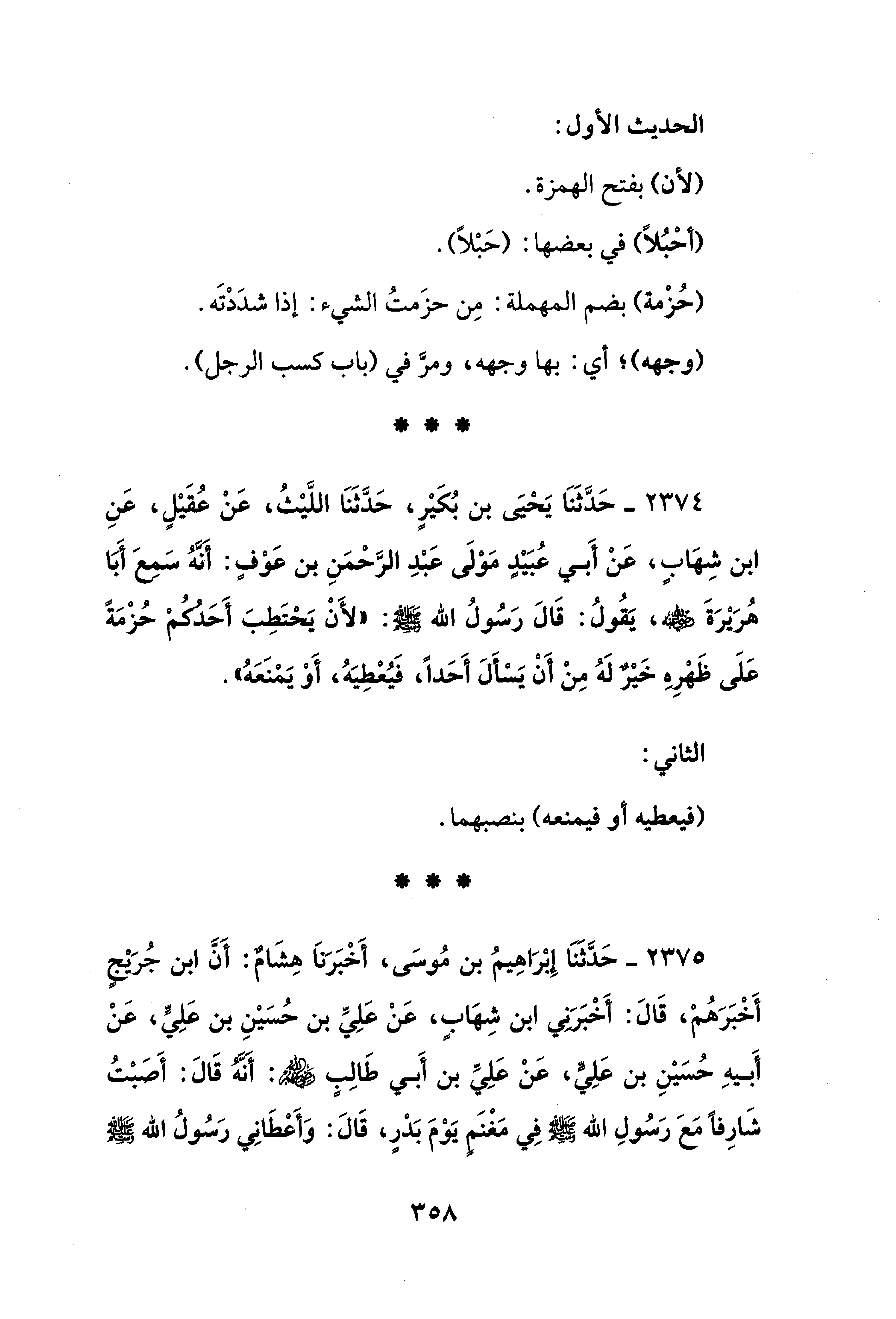 2374 - حَدَّثَنَا يَحْيَى بن بُكَيْرٍ، حَدَّثَنَا اللَّيْثُ، عَنْ عُقَيْلٍ، عَنِ ابن شِهَابٍ، عَنْ أَبي عُبَيْدٍ مَوْلَى عَبْدِ الرَّحْمَنِ بن عَوْفٍ: أَنَّهُ سَمِعَ أَبَا هُرَيْرَةَ - رضي الله عنه -، يَقُولُ: قَالَ رَسُولُ الله - صلى الله عليه وسلم -: "لأَنْ يَحْتَطِبَ أَحَدُكُمْ حُزْمَةً عَلَى ظَهْرِهِ خَيْرٌ لَهُ مِنْ أَنْ يَسْأَلَ أَحَدًا، فَيُعْطِيَهُ، أَوْ يَمْنَعَهُ".