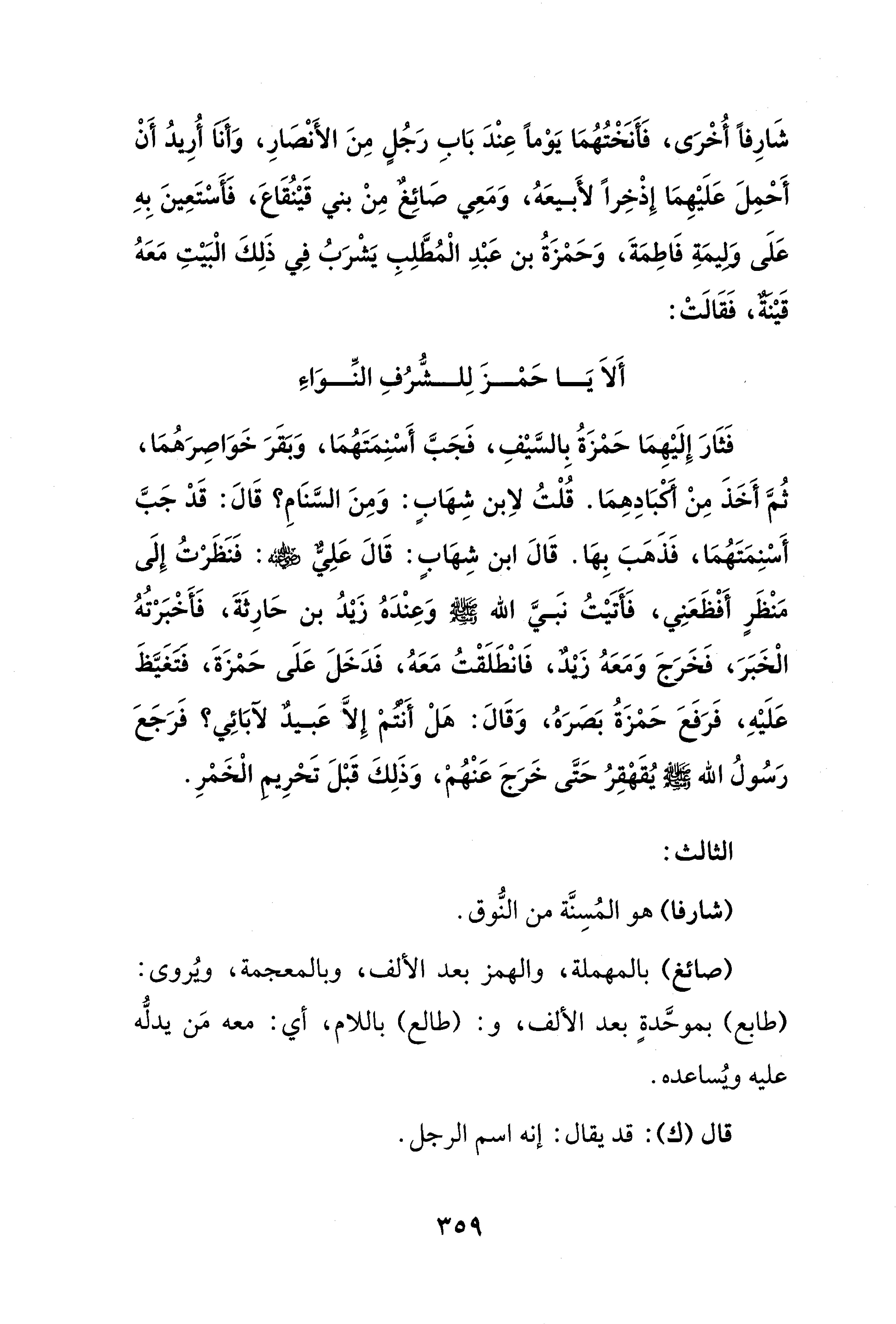 فَثَارَ إِلَيْهِمَا حَمْزَةُ بِالسَّيْفِ، فَجَبَّ أَسْنِمَتَهُمَا، وَبَقَرَ خَوَاصِرَهُمَا، ثُمَّ أَخَذَ مِنْ أَكْبَادِهِمَا. قُلْتُ لاِبن شِهَابٍ: وَمِنَ السَّنَامِ؟ قَالَ: قَدْ جَبَّ أَسْنِمَتَهُمَا، فَذَهَبَ بِهَا. قَالَ ابن شِهَابٍ: قَالَ عَلِيٌّ - رضي الله عنه -: فَنَظَرْتُ إِلَى مَنْظَرٍ أَفْظَعَنِي، فَأَتَيْتُ نبَيَّ الله - صلى الله عليه وسلم - وَعِنْدَهُ زيْدُ بن حَارِثَةَ، فَأَخْبَرْتُهُ الْخَبَرَ، فَخَرَجَ وَمَعَهُ زَيْدٌ، فَانْطَلَقْتُ مَعَهُ، فَدَخَلَ عَلَى حَمْزَةَ، فَتَغَيَّظَ عَلَيْهِ، فَرَفَعَ حَمْزَةُ بَصَرَهُ، وَقَالَ: هَلْ أَنْتُمْ إِلَّا عَبيدٌ لآَبَائِي؟ فَرَجَعَ رَسُولُ الله - صلى الله عليه وسلم - يُقَهْقِرُ حَتَّى خَرَجَ عَنْهُمْ، وَذَلِكَ قَبْلَ تَحْرِيم الْخَمْرِ.