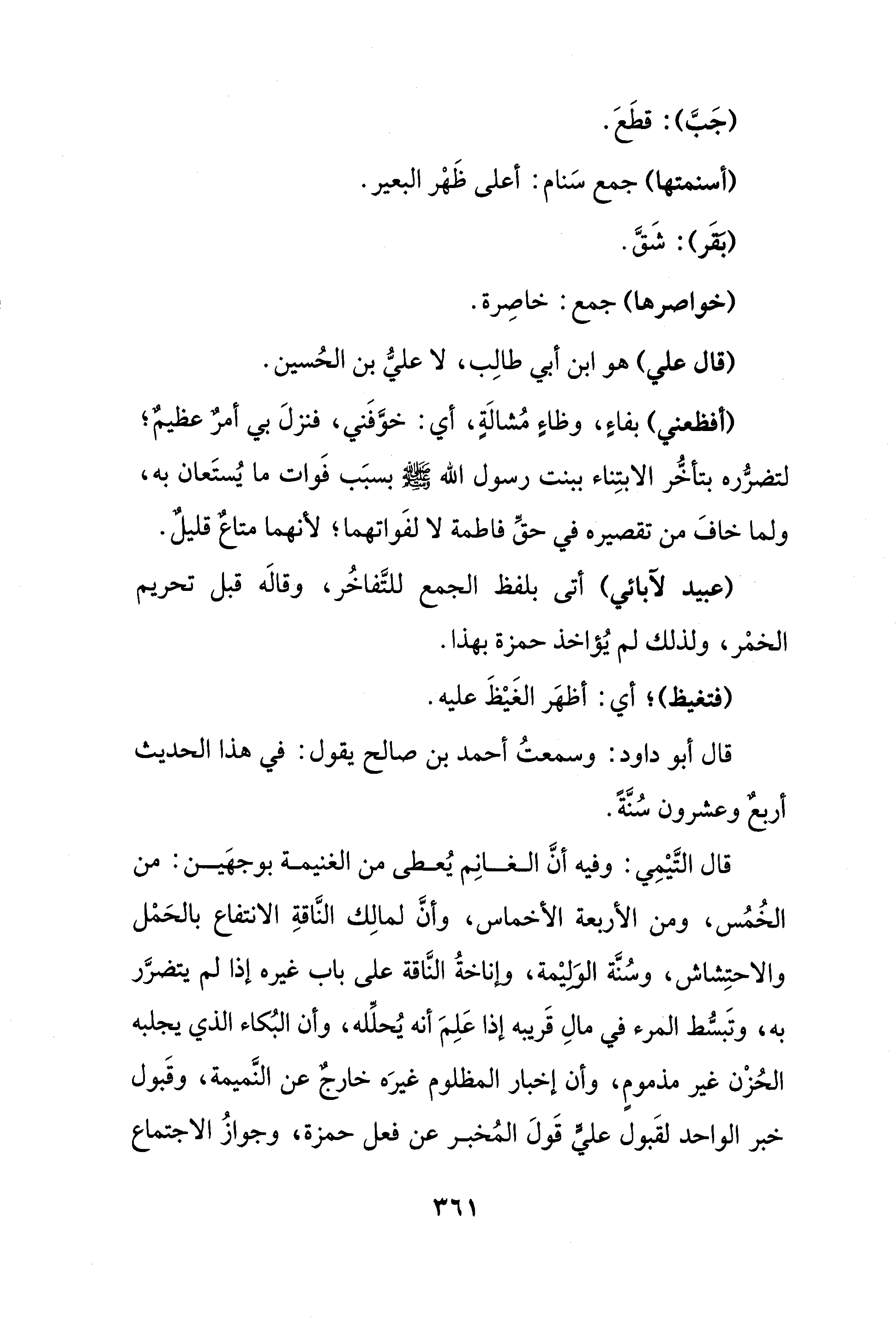 قال التَّيْمِي: وفيه أنَّ الغانِم يُعطى من الغنيمة بوجهَين: من الخُمُس، ومن الأربعة الأخماس، وأنَّ لمالِك النَّاقةِ الانتفاع بالحَمْل والاحتِشاش، وسُنَّة الوَلِيْمة، وإناخةُ النَّاقة على باب غيره إذا لم يتضرَّر به، وتَبسُّط المرء في مالِ قَريبه إذا عَلِمَ أنه يُحلِّله، وأن البُكاء الذي يجلبه الحُزْن غير مذمومٍ، وأن إخبار المظلوم غيرَه خارجٌ عن النَّميمة، وقَبول خبر الواحد لقَبول على قَولَ المُخبر عن فعل حمزة، وجوازُ الاجتماع