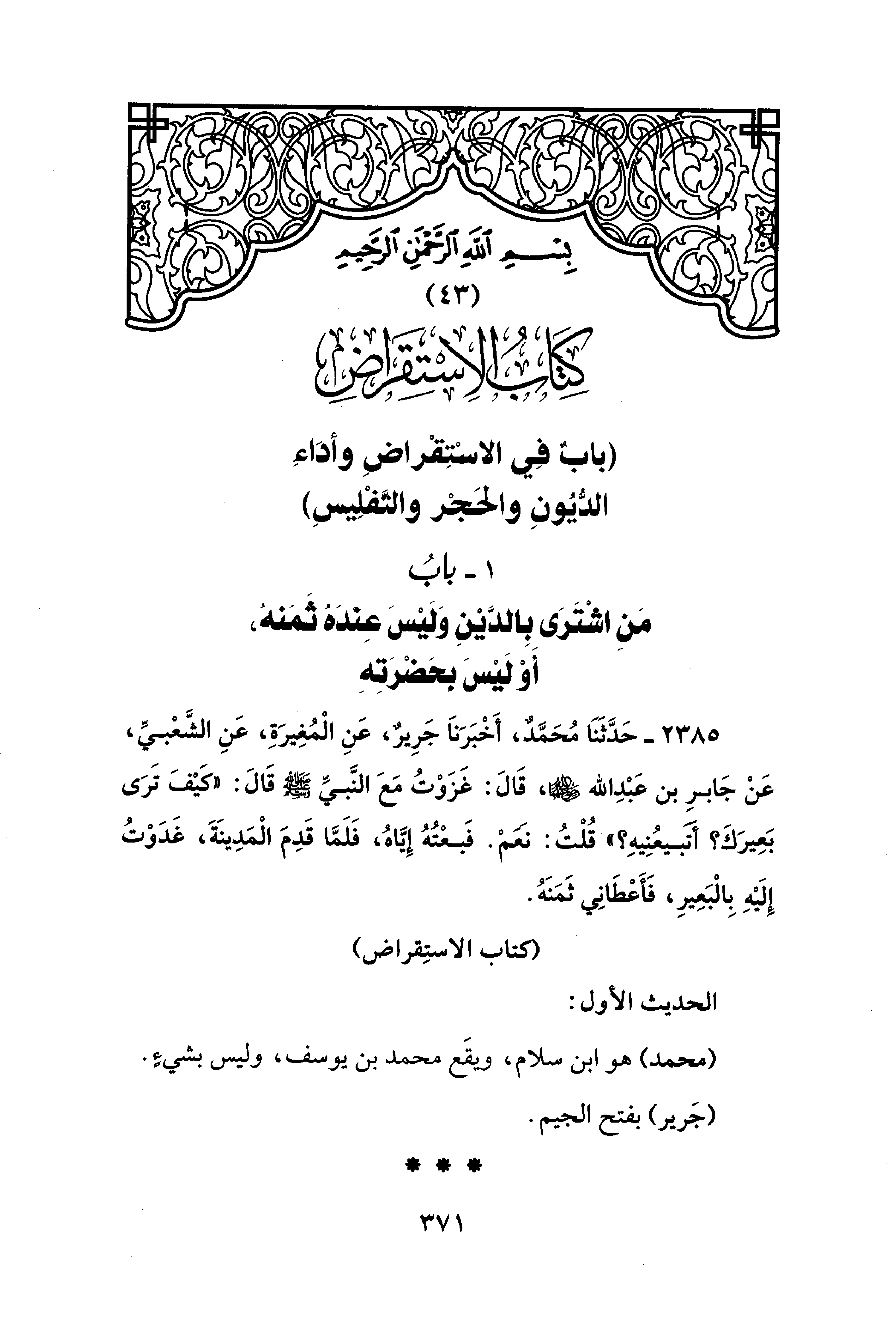2385 - حَدَّثَنَا مُحَمَّدٌ، أَخْبَرَنَا جَرِيرٌ، عَنِ الْمُغِيرَةِ، عَنِ الشَّعْبيِّ، عَنْ جَابرِ بن عَبْدِ الله - رضي الله عنهما -، قَالَ: غَزَوْتُ مَعَ النَّبيِّ - صلى الله عليه وسلم - قَالَ: "كَيْفَ تَرَى بَعِيرَكَ؟ أَتبيعُنِيهِ؟ " قُلْتُ: نَعَمْ. فَبعْتُهُ إِيَّاهُ، فَلَمَّا قَدِمَ الْمَدِينَةَ، غَدَوْتُ إلَيْهِ بِالْبَعِيرِ، فَأَعْطَانِي ثَمَنَهُ.