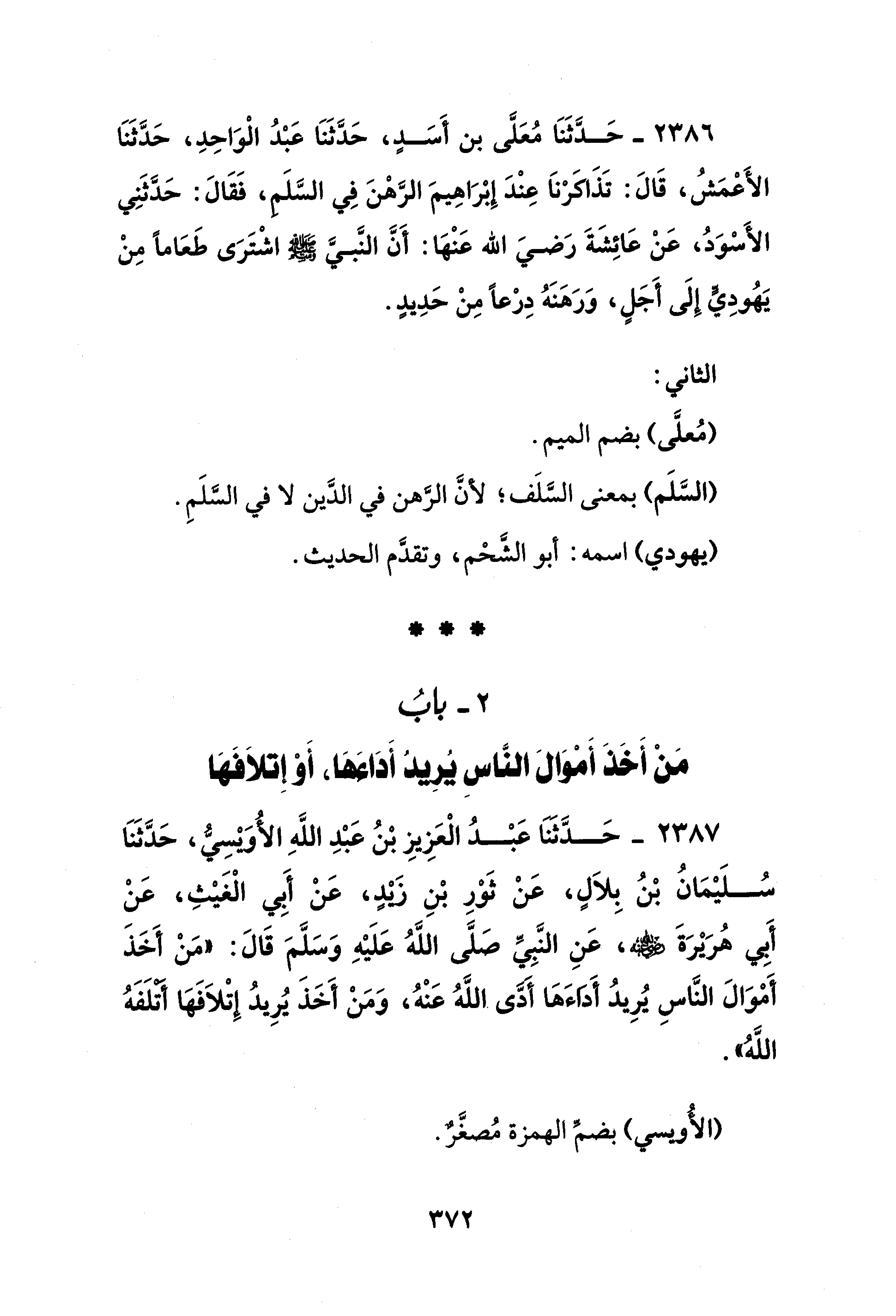 2387 - حَدَّثَنَا عَبْدُ الْعَزِيزِ بْنُ عَبْدِ اللهِ الأُوَيْسِيُّ، حَدَّثَنَا سُلَيْمَانُ بْنُ بِلاَلٍ، عَنْ ثَوْرِ بْنِ زَيْدٍ، عَنْ أَبِي الْغَيْثِ، عَنْ أَبي هُرَيْرَةَ - رضي الله عنه -، عَنِ النَّبِيِّ صَلَّى الله عَلَيْهِ وَسَلَّمَ قَالَ: "مَنْ أخَذَ أَمْوَالَ النَّاسِ يُرِيدُ أَدَاءَهَا أَدَّى اللهُ عَنْهُ، وَمَنْ أَخَذَ يُرِيدُ إِتْلاَفَهَا أتلَفَهُ اللهُ".