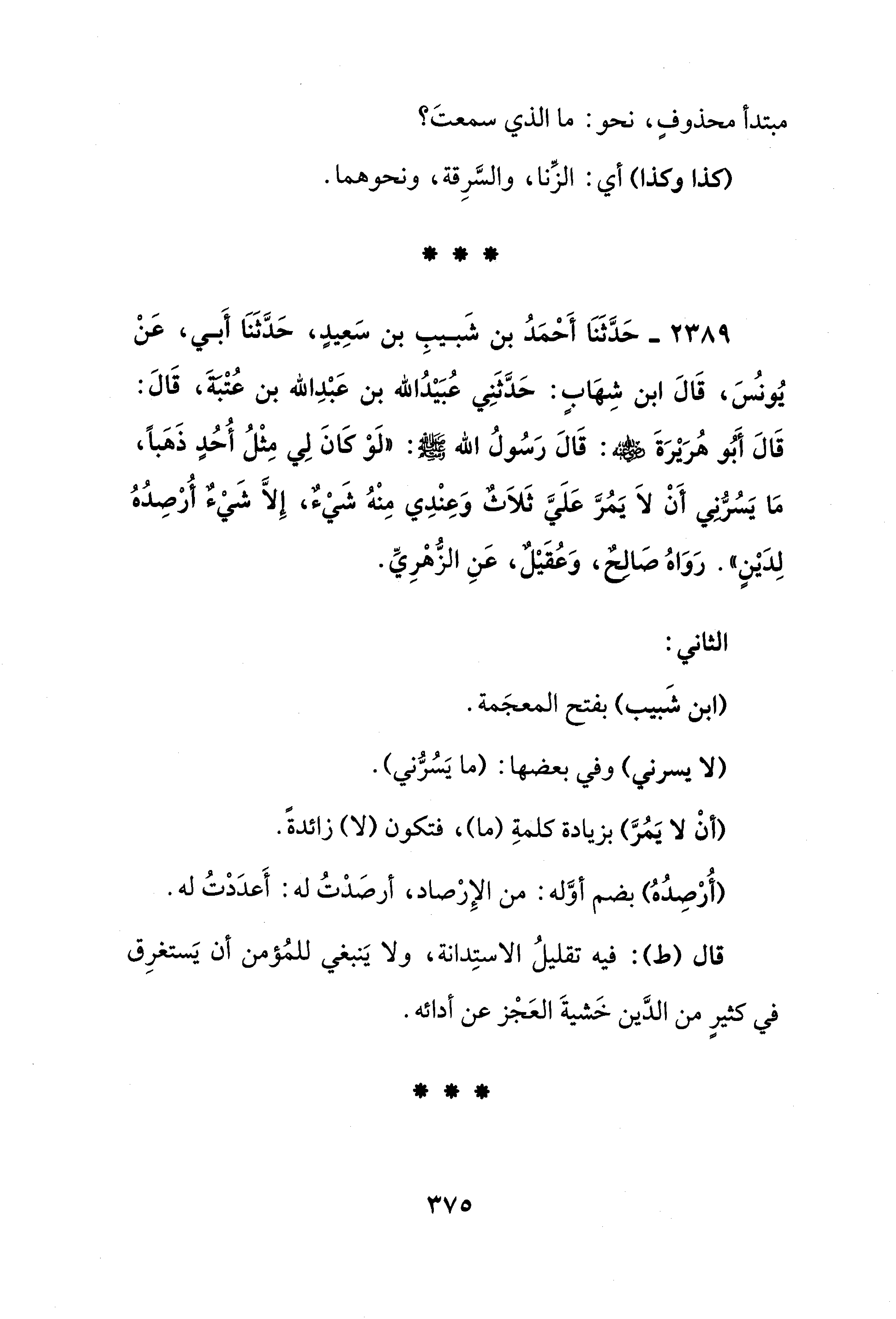 2389 - حَدَّثَنَا أَحْمَدُ بن شَبيبِ بن سَعِيدٍ، حَدَّثَنَا أَبي، عَنْ يُونُسَ، قَالَ ابن شِهَابٍ: حَدَّثَنِي عُبَيْدُ الله بن عَبْدِ الله بن عُتْبَةَ، قَالَ: قَالَ أَبُو هُرَيْرَةَ - رضي الله عنه -: قَالَ رَسُولُ الله - صلى الله عليه وسلم -: "لَوْ كَانَ لِي مِثْلُ أُحُدٍ ذَهَبًا، مَا يَسُرُّنِي أَنْ لاَ يَمُرَّ عَلَيَّ ثَلاَثٌ وَعِنْدِي مِنْهُ شَيْءٌ، إِلَّا شَيْءٌ أُرْصِدُهُ لِدَيْنٍ". رَوَاهُ صَالِحٌ، وَعُقَيْلٌ، عَنِ الزُّهْرِيِّ.