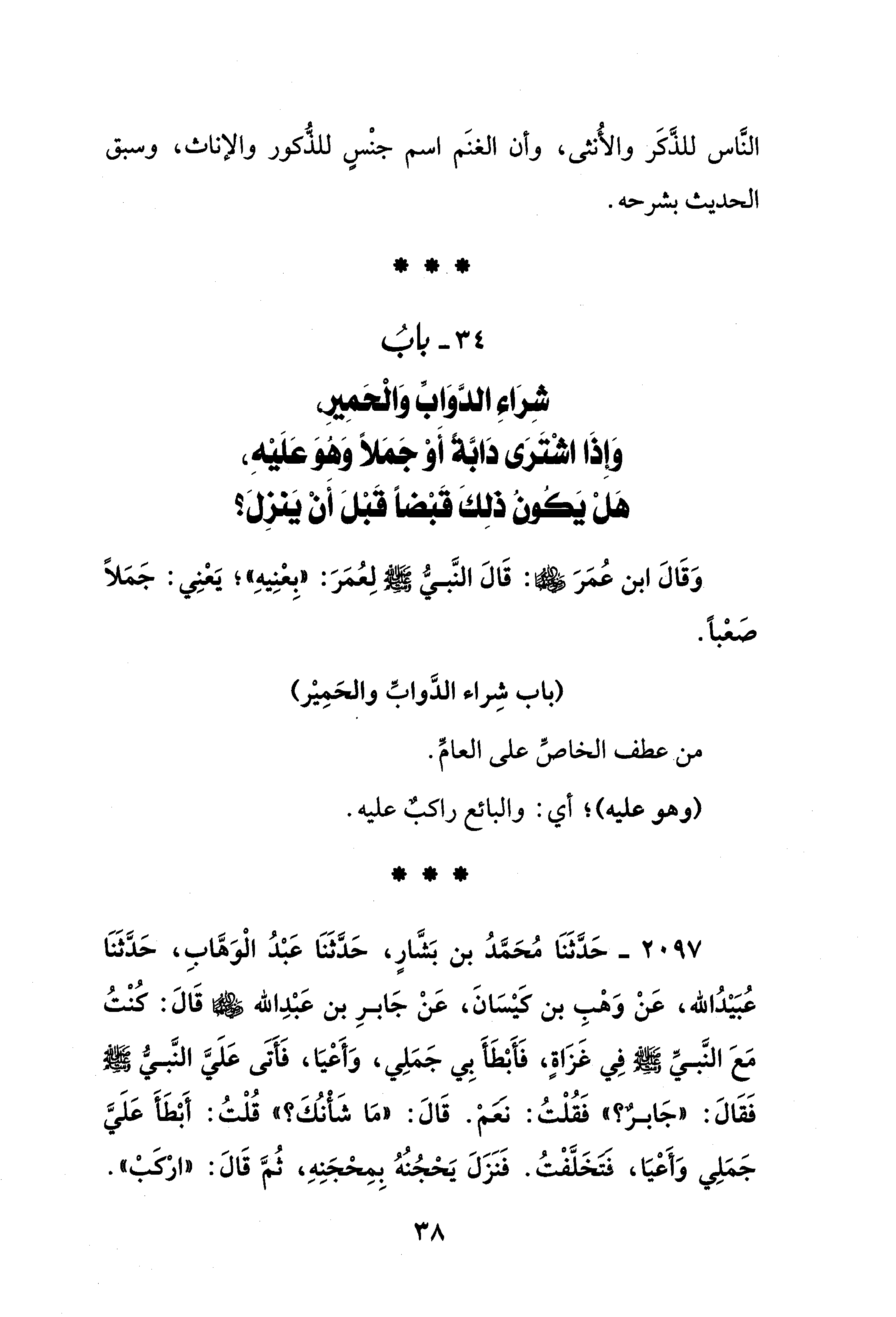 34 - بابُ شِرَاءِ الدَّوَابِّ وَالحَمِيرِ، وَإِذَا اشْتَرَكا دَابَّةً أَوْ جَمَلًا وَهُوَ عَلَيْهِ، هل يَكُونُ ذلِكَ قَبْضًا قَبْلَ أَنْ يَنزِلَ؟