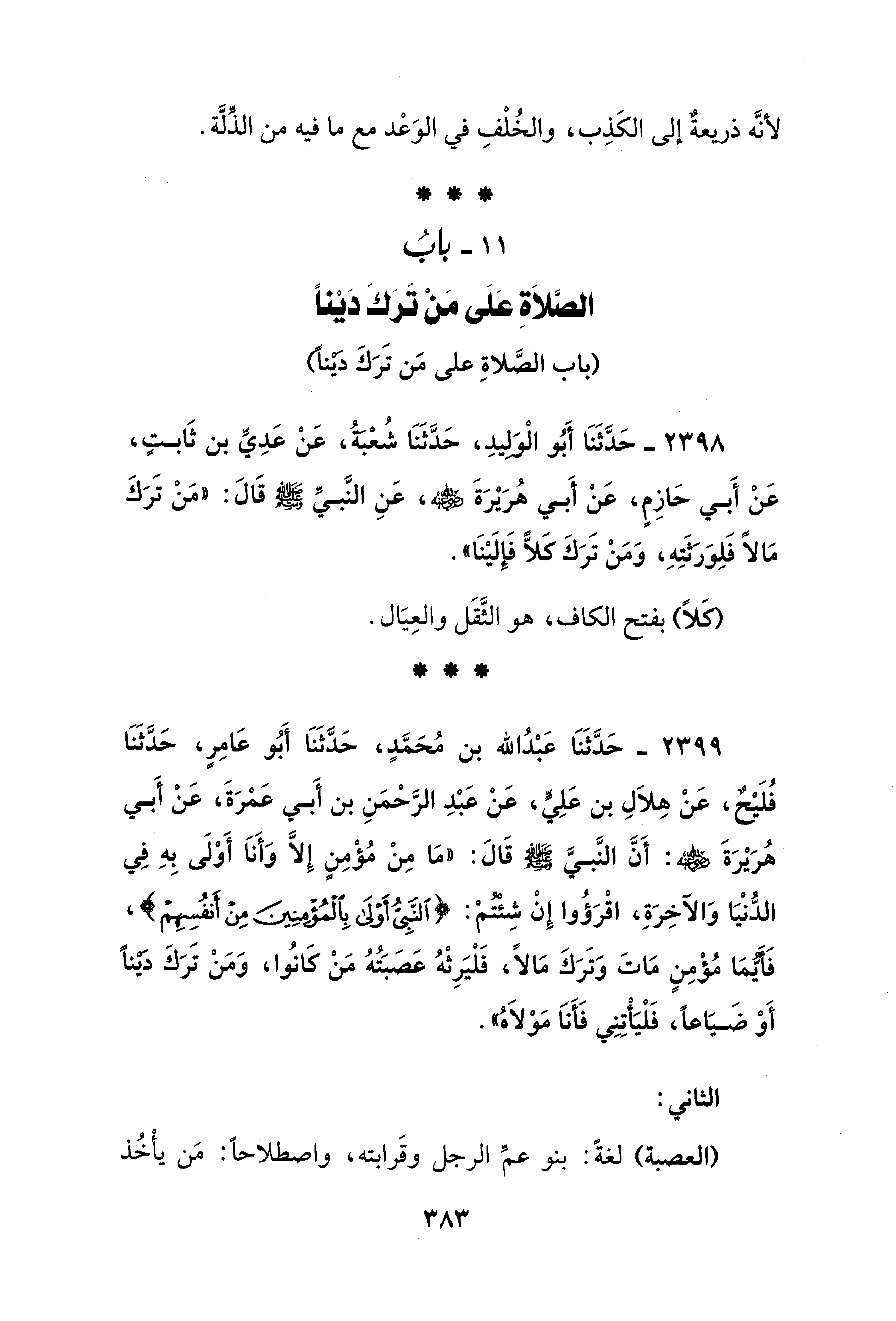 2398 - حَدَّثَنَا أَبُو الْوَلِيدِ، حَدَّثَنَا شُعْبَةُ، عَنْ عَدِيِّ بن ثَابتٍ، عَنْ أَبي حَازِمٍ، عَنْ أَبي هُرَيْرَةَ - رضي الله عنه -، عَنِ النَّبيِّ - صلى الله عليه وسلم - قَالَ: "مَنْ تَرَكَ مَالًا فَلِوَرَثَتِهِ، وَمَنْ تَرَكَ كَلًّا فَإِلَيْنَا".