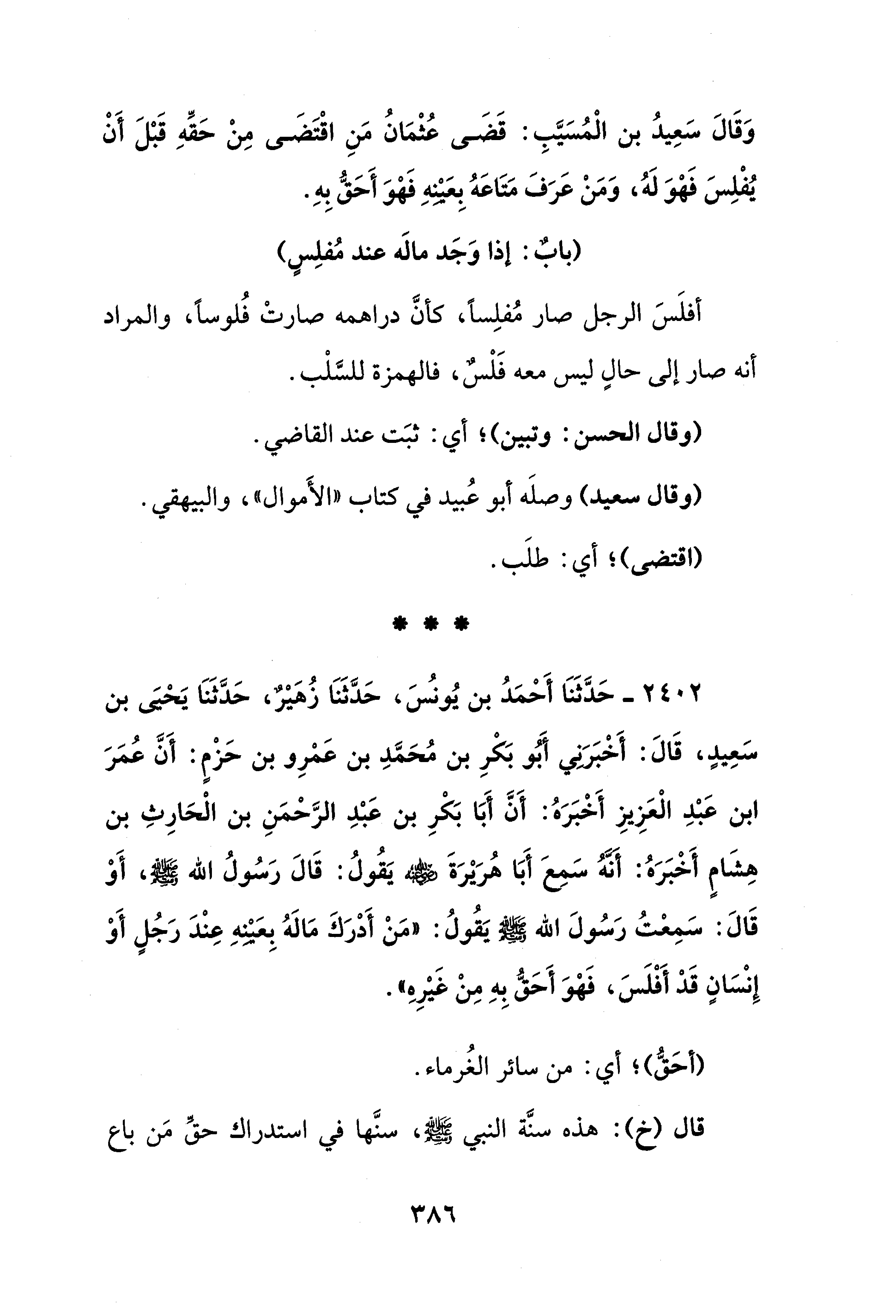 2402 - حَدَّثَنَا أَحْمَدُ بن يُونُسَ، حَدَّثَنَا زُهَيْرٌ، حَدَّثَنَا يَحْيَى بن سَعِيدٍ، قَالَ: أَخْبَرَنِي أَبُو بَكْرِ بن مُحَمَّدِ بن عَمْرِو بن حَزْمٍ: أَنَّ عُمَرَ ابن عَبْدِ الْعَزِيزِ أَخْبَرَهُ: أَنَّ أَبَا بَكْرِ بن عَبْدِ الرَّحْمَنِ بن الْحَارِثِ بن هِشَامٍ أَخْبَرَهُ: أَنَّهُ سَمِعَ أَبَا هُرَيْرَةَ - رضي الله عنه - يَقُولُ: قَالَ رَسُولُ الله - صلى الله عليه وسلم -، أَوْ قَالَ: سَمِعْتُ رَسُولَ الله - صلى الله عليه وسلم - يَقُولُ: "مَنْ أَدْرَكَ مَالَهُ بِعَيْنِهِ عِنْدَ رَجُلٍ أَوْ إِنْسَانٍ قَدْ أَفْلَسَ، فَهْوَ أَحَقُّ بِهِ مِنْ غَيْرِهِ".