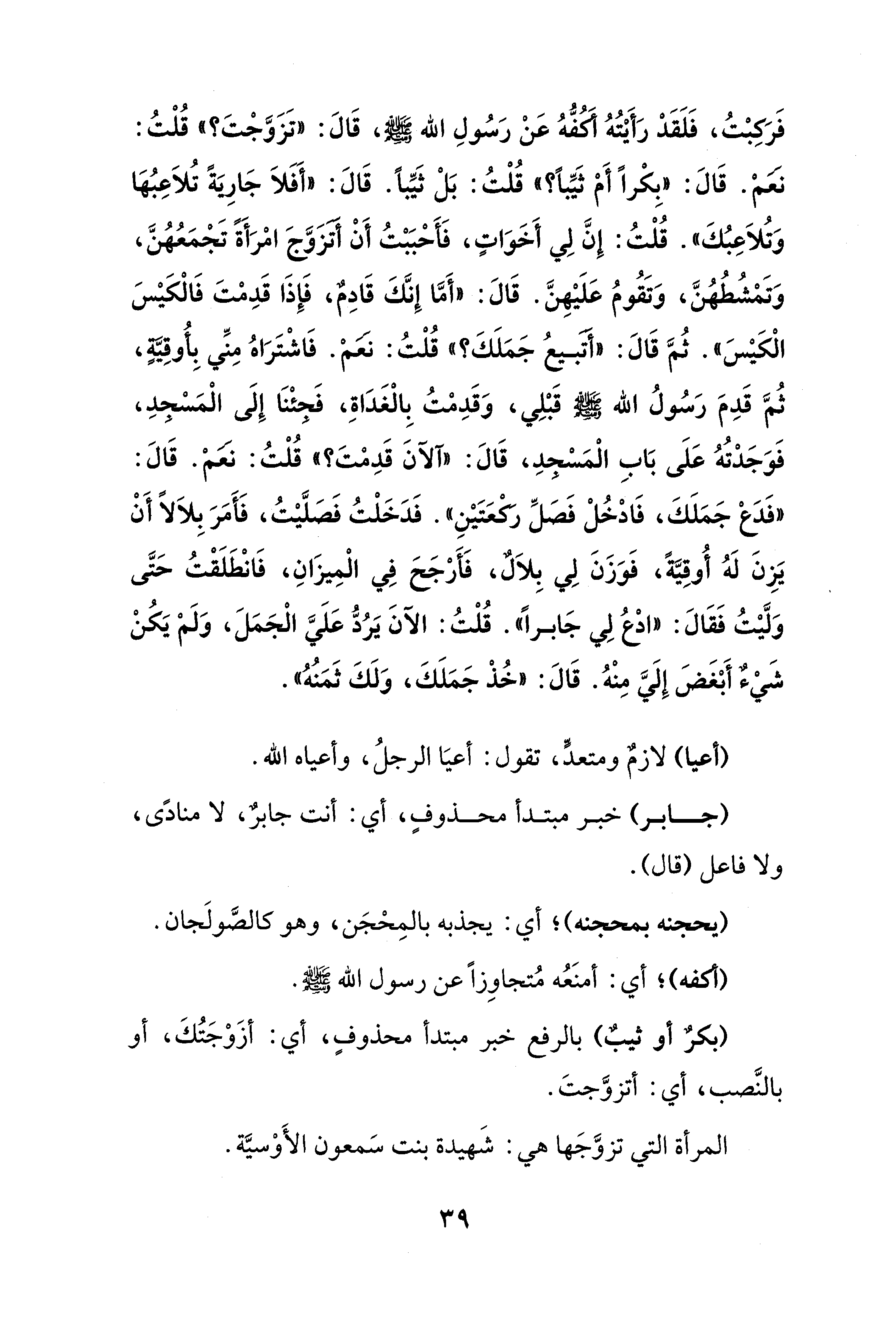 فَرَكِبْتُ، فَلَقَد رَأَيْتُهُ أكُفُّهُ عَنْ رَسُولِ الله - صلى الله عليه وسلم -، قَالَ: "تَزَوَّجْتَ؟ " قُلْتُ: نعم. قَالَ: "بِكْرًا أَم ثَيِّبًا؟ " قُلْتُ: بَلْ ثَيِّبًا. قَالَ: "أفلاَ جَارِيَةً تُلاَعِبُها وَتُلاَعِبُكَ". قُلْتُ: إِنَّ لِي أَخَوَاتٍ، فَأَحبَبْتُ أَنْ أتزَوَّجَ امرَأةُ تَجْمَعُهُنَّ، وَتَمشُطُهُنَّ، وَتَقُومُ عَلَيْهِنَّ. قَالَ: "أَمَّا إِنَّكَ قَادِمٌ، فَإِذَا قَدِمتَ فَالْكَيْسَ الْكَيْس". ثُمَّ قَالَ: "أتبيعُ جَمَلَكَ" قُلْتُ: نعم. فَاشْتَرَاهُ مِنِّي بِأُوقِيَّةٍ، ثُمَّ قَدِمَ رَسُولُ الله - صلى الله عليه وسلم - قَبْلِي، وَقَدِمْتُ بِالْغَدَاةِ، فَجئْنَا إِلَى الْمَسْجدِ، فَوَجَدتُهُ عَلَى بَابِ الْمَسْجدِ، قَالَ: "آلاَنَ قَدِمتَ؟ " قُلْتُ: نعم. قَالَ: "فدَع جَمَلَكَ، فَادخُلْ فَصَلِّ ركعَتَيْنِ". فَدَخَلْتُ فَصَلَّيْتُ، فَأَمَرَ بِلاَلًا أَنْ يَزِنَ لَهُ أُوقِيَّةً، فَوَزَنَ لِي بِلاَلٌ، فَأرجَحَ فِي الْمِيزَانِ، فَانْطَلَقْتُ حَتَّى وَلَّيْتُ فَقَالَ: "ادعُ لِي جَابرًا". قُلْتُ: الآَنَ يَرُدُّ عَلَيَّ الْجَمَلَ، وَلَم يَكُنْ شَيْءٌ أَبْغَضَ إِلَيَّ مِنْهُ. قَالَ: "خُذْ جَمَلَكَ، وَلَكَ ثَمَنُهُ".