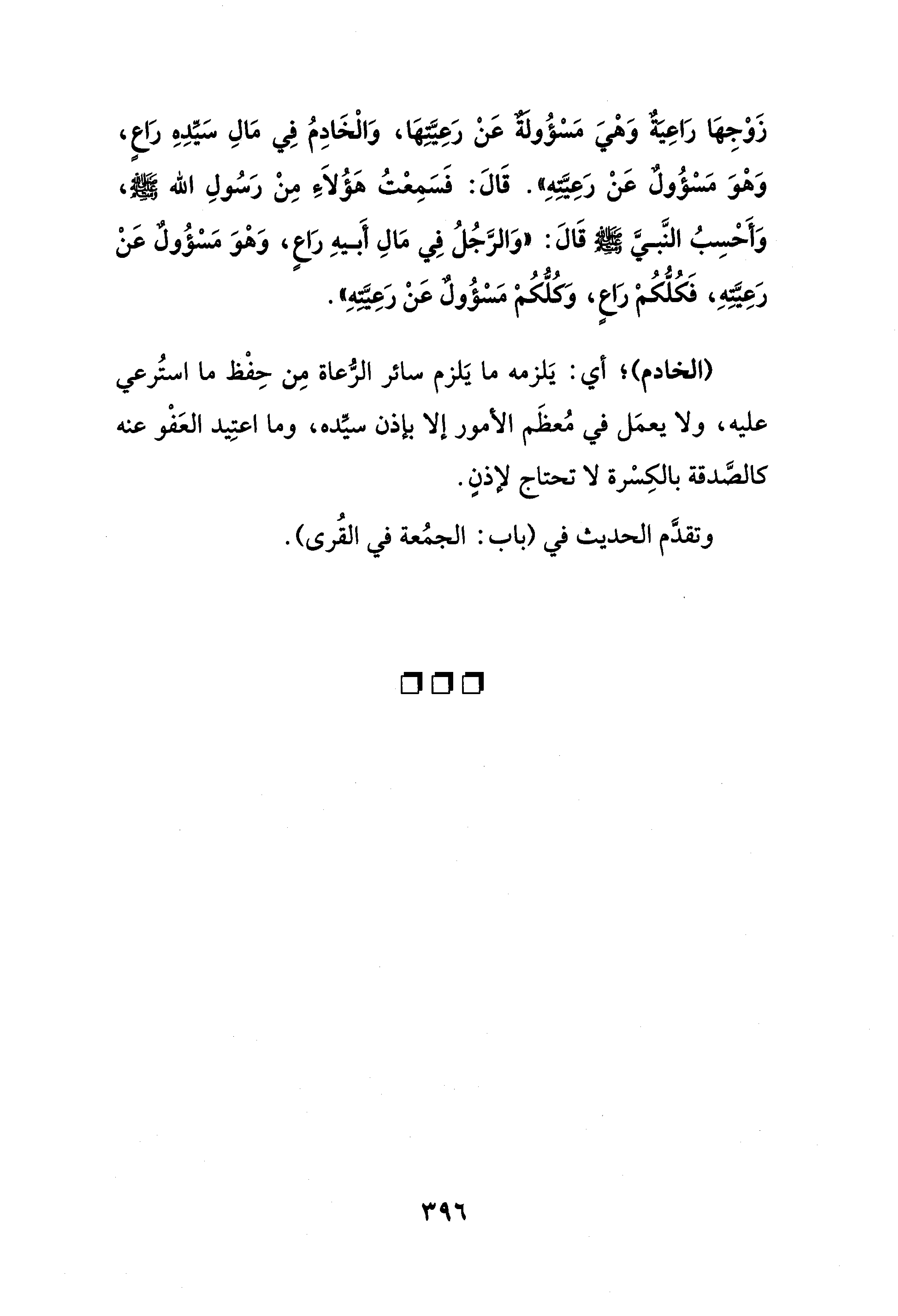 (الخادم)؛ أي: يَلزمه ما يَلزم سائر الرُّعاة مِن حِفْظ ما استُرعي عليه، ولا يعمَل في مُعظَم الأمور إلا بإذن سيِّده، وما اعتِيد العَفْو عنه كالصَّدقة بالكِسْرة لا تحتاج لإذنٍ.