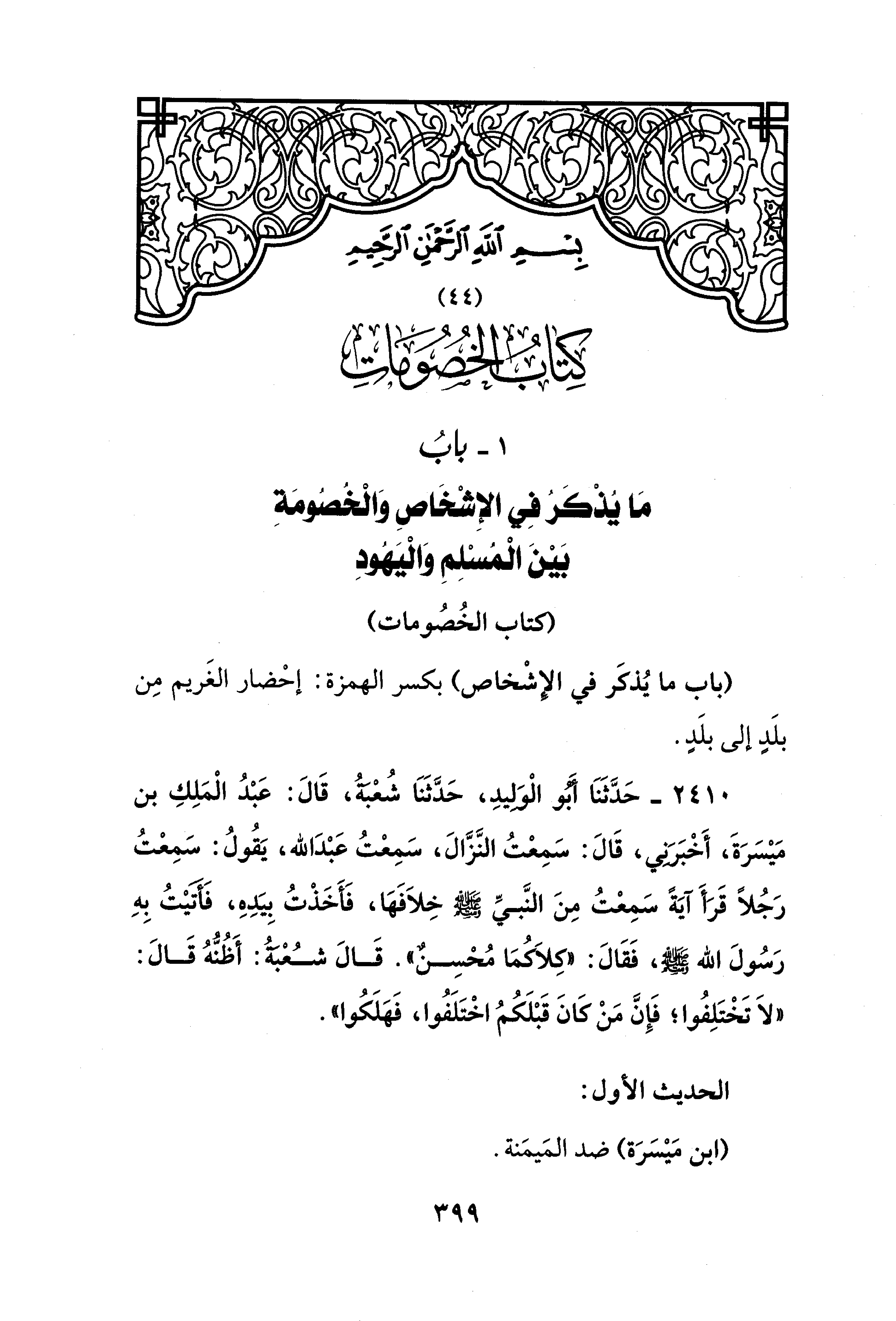 2410 - حَدَّثَنَا أَبُو الْوَلِيدِ، حَدَّثَنَا شُعْبَةُ، قَالَ: عَبْدُ الْمَلِكِ بن مَيْسَرَةَ، أَخْبَرَنِي، قَالَ: سَمِعْتُ النَّزَّالَ، سَمِعْتُ عَبْدَ الله، يَقُولُ: سَمِعْتُ رَجُلًا قَرَأَ آيَةً سَمِعْتُ مِنَ النَّبيِّ - صلى الله عليه وسلم - خِلاَفَهَا، فَأَخَذْتُ بِيَدِهِ، فَأَتَيْتُ بِهِ رَسُولَ الله - صلى الله عليه وسلم -، فَقَالَ: "كِلاَكُمَا مُحْسِنٌ". قَالَ شُعْبَةُ: أَظُنُّهُ قَالَ: "لاَ تَخْتَلِفُوا؛ فَإِنَّ مَنْ كَانَ قَبْلَكُمُ اخْتَلَفُوا، فَهَلَكُوا".