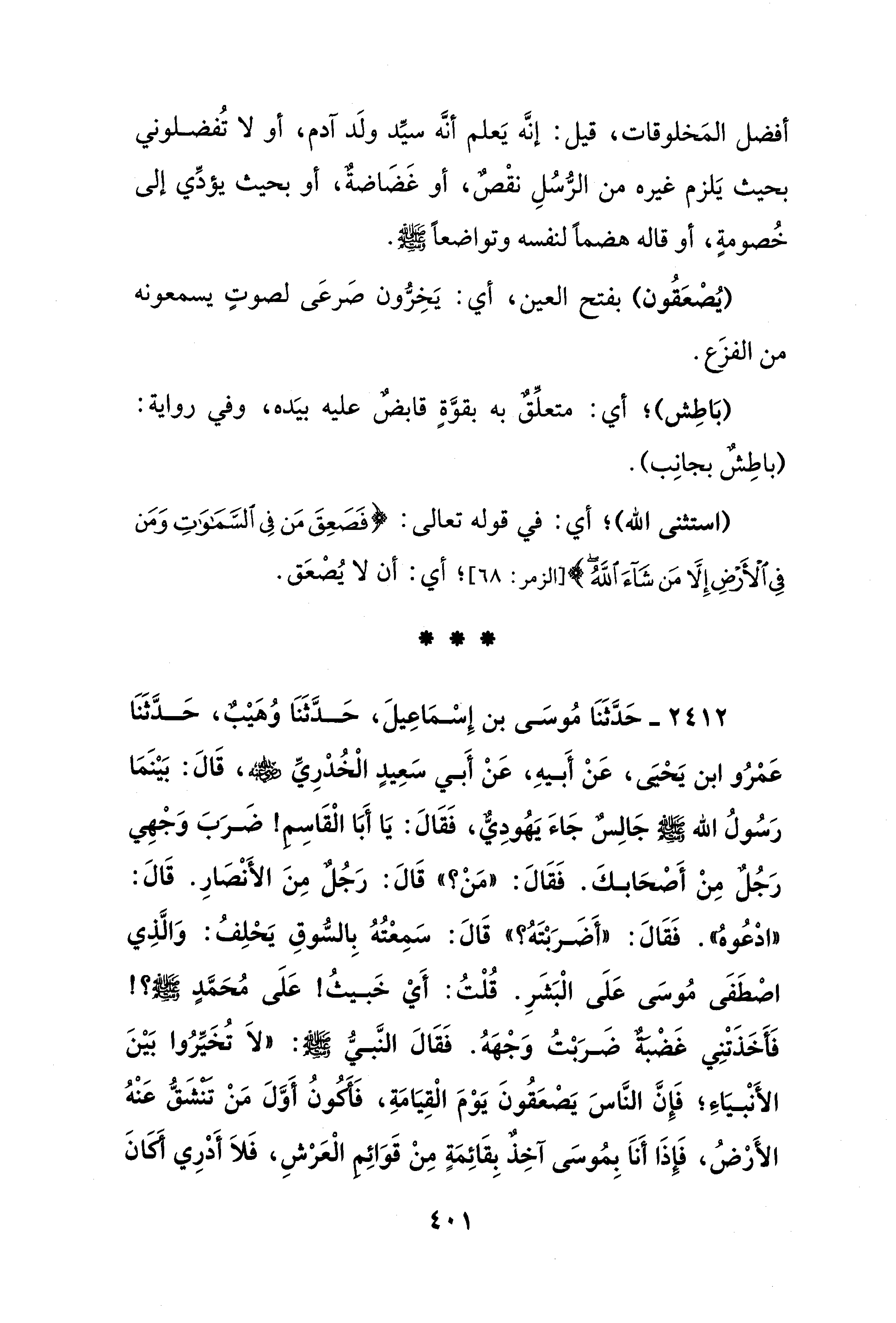 2412 - حَدَّثَنَا مُوسَى بن إِسْمَاعِيلَ، حَدَّثَنَا وُهَيْبٌ، حَدَّثَنَا عَمْرُو ابن يَحْيَى، عَنْ أَبيهِ، عَنْ أَبي سَعِيدٍ الْخُدْرِيِّ - رضي الله عنه -، قَالَ: بَيْنَمَا رَسُولُ الله - صلى الله عليه وسلم - جَالِسٌ جَاءَ يَهُودِيٌ، فَقَالَ: يَا أَبَا الْقَاسِمِ! ضَرَبَ وَجْهِي رَجُلٌ مِنْ أَصْحَابكَ. فَقَالَ: "مَنْ؟ " قَالَ: رَجُلٌ مِنَ الأَنْصَارِ. قَالَ: "ادْعُوهُ". فَقَالَ: "أَضَرَبْتَهُ؟ " قَالَ: سَمِعْتُهُ بِالسُّوقِ يَحْلِفُ: وَالَّذِي اصْطَفَى مُوسَى عَلَى الْبَشَرِ. قُلْتُ: أَيْ خَبيثُ! عَلَى مُحَمَّدٍ - صلى الله عليه وسلم -؟! فَأَخَذَتْنِي غَضْبَةٌ ضَرَبْتُ وَجْهَهُ. فَقَالَ النَّبيُّ - صلى الله عليه وسلم -: "لاَ تُخَيِّرُوا بَيْنَ الأَنْبيَاءِ؛ فَإِنَّ النَّاسَ يَصْعَقُونَ يَوْمَ الْقِيَامَةِ، فَأَكُونُ أَوَّلَ مَنْ تَنْشَقُّ عَنْهُ الأَرْضُ، فَإِذَا أَناَ بِمُوسَى آخِذٌ بِقَائِمَةٍ مِنْ قَوَائِمِ الْعَرْشِ، فَلاَ أَدْرِي أَكَانَ