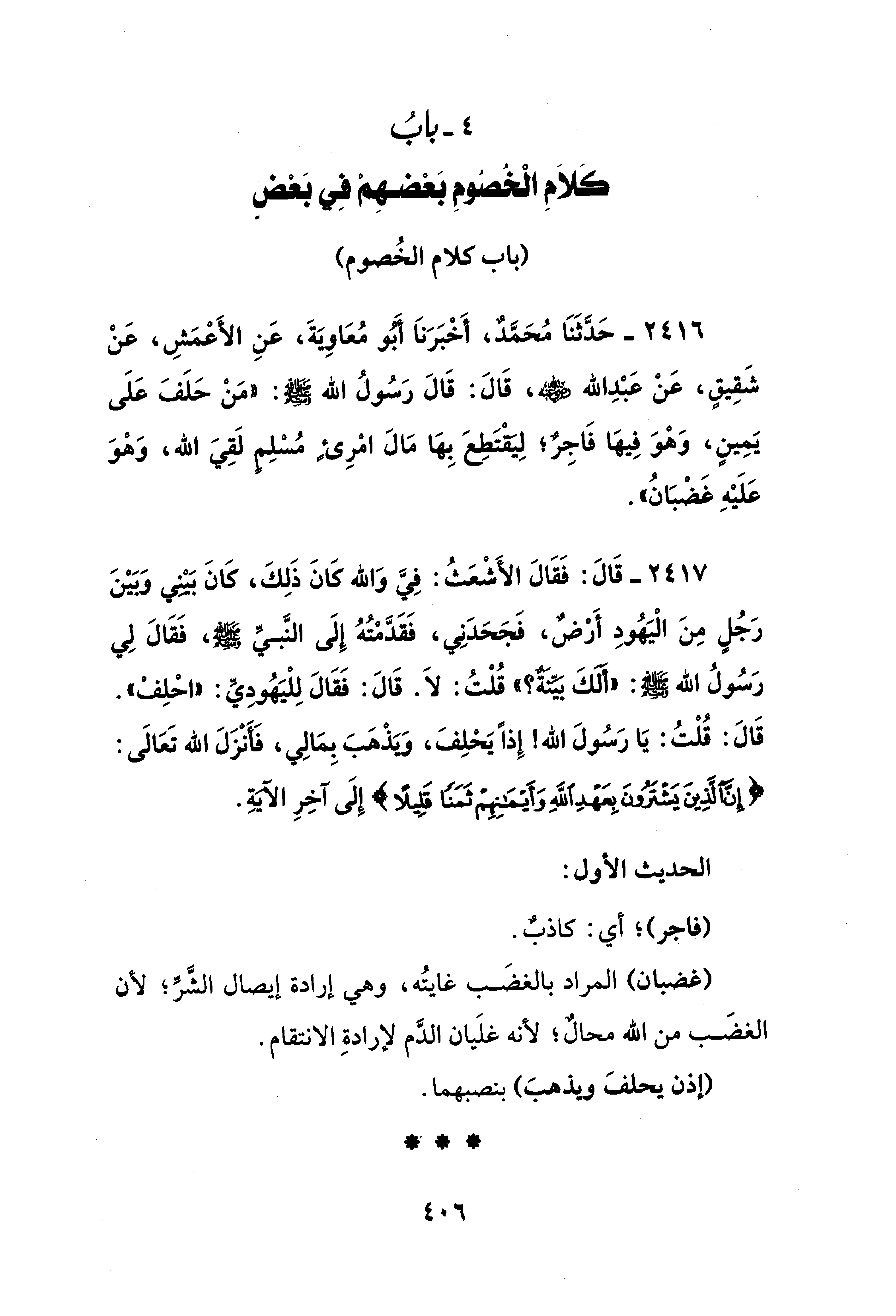 2417 - قَالَ: فَقَالَ الأَشْعَثُ: فِيَّ وَالله كَانَ ذَلِكَ، كَانَ بَيْنِي وَبَيْنَ رَجُلٍ مِنَ الْيَهُودِ أَرْضٌ، فَجَحَدَنِي، فَقَدَّمْتُهُ إِلَى النَّبيِّ - صلى الله عليه وسلم -، فَقَالَ لِي رَسُولُ الله - صلى الله عليه وسلم -: "أَلَكَ بَيِّنَةٌ؟ " قُلْتُ: لاَ. قَالَ: فَقَالَ لِلْيَهُودِيِّ: "احْلِفْ". قَالَ: قُلْتُ: يَا رَسُولَ الله! إِذًا يَحْلِفَ، وَيَذْهَبَ بِمَالِي، فَأَنْزَلَ الله تَعَالَى: {إِنَّ الَّذِينَ يَشْتَرُونَ بِعَهْدِ اللَّهِ وَأَيْمَانِهِمْ ثَمَنًا قَلِيلًا} إلى آخر الآية.