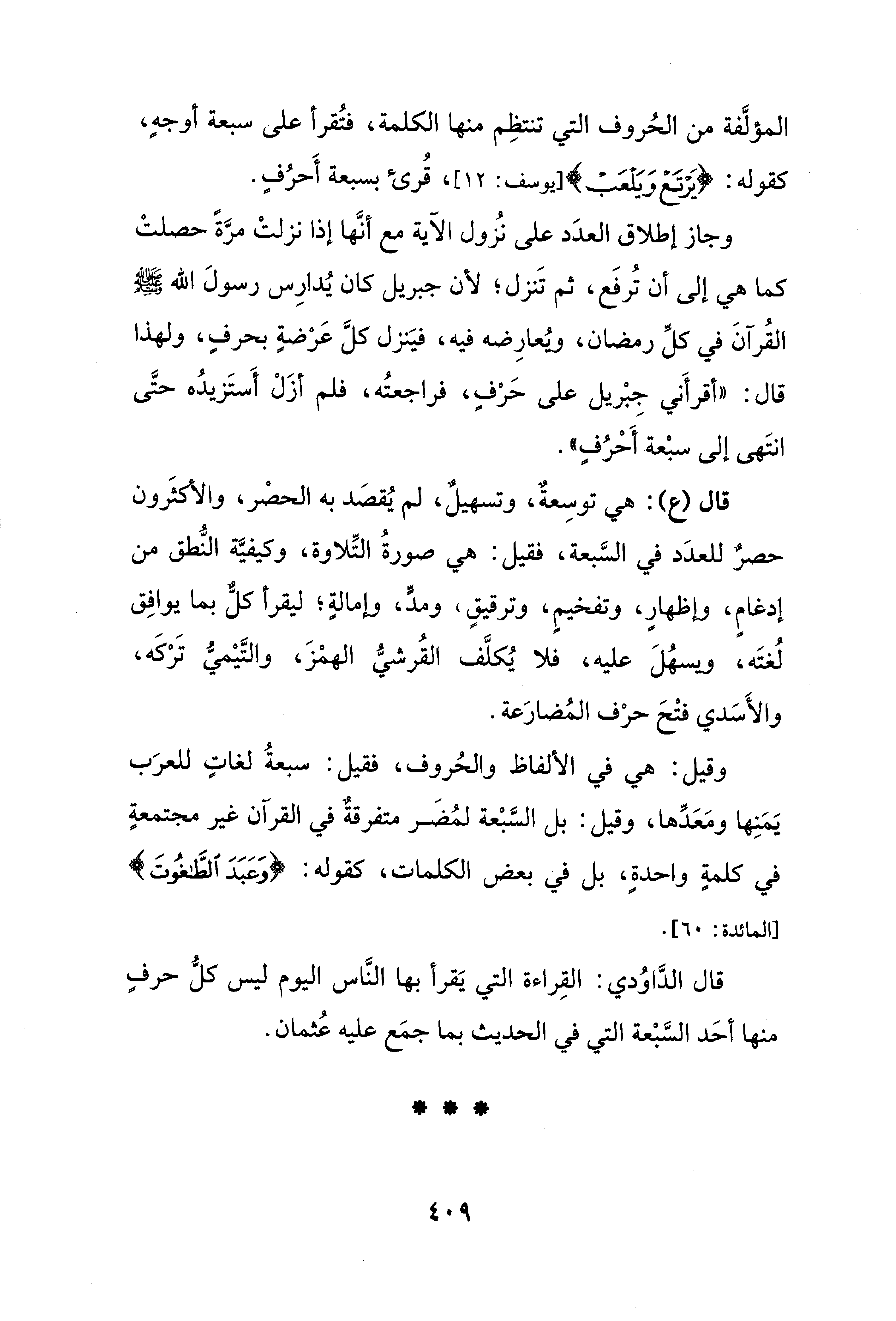 قال (ع): هي توسِعةٌ، وتسهيلٌ، لم يُقصَد به الحصْر، والأكثَرون حصرٌ للعدَد في السَّبعة، فقيل: هي صورةُ التِّلاوة، وكيفيَّة النُّطق من إدغامٍ، وإظهارٍ، وتفخيمٍ، وترقيقٍ، ومدٍّ، وإمالةٍ؛ ليقرأ كلٌّ بما يوافِق لُغتَه، ويسهُلَ عليه، فلا يُكلَّف القُرشيُّ الهمْزَ، والتَّيْميُّ تَرْكَه، والأَسَدي فتْحَ حرْف المُضارَعة.