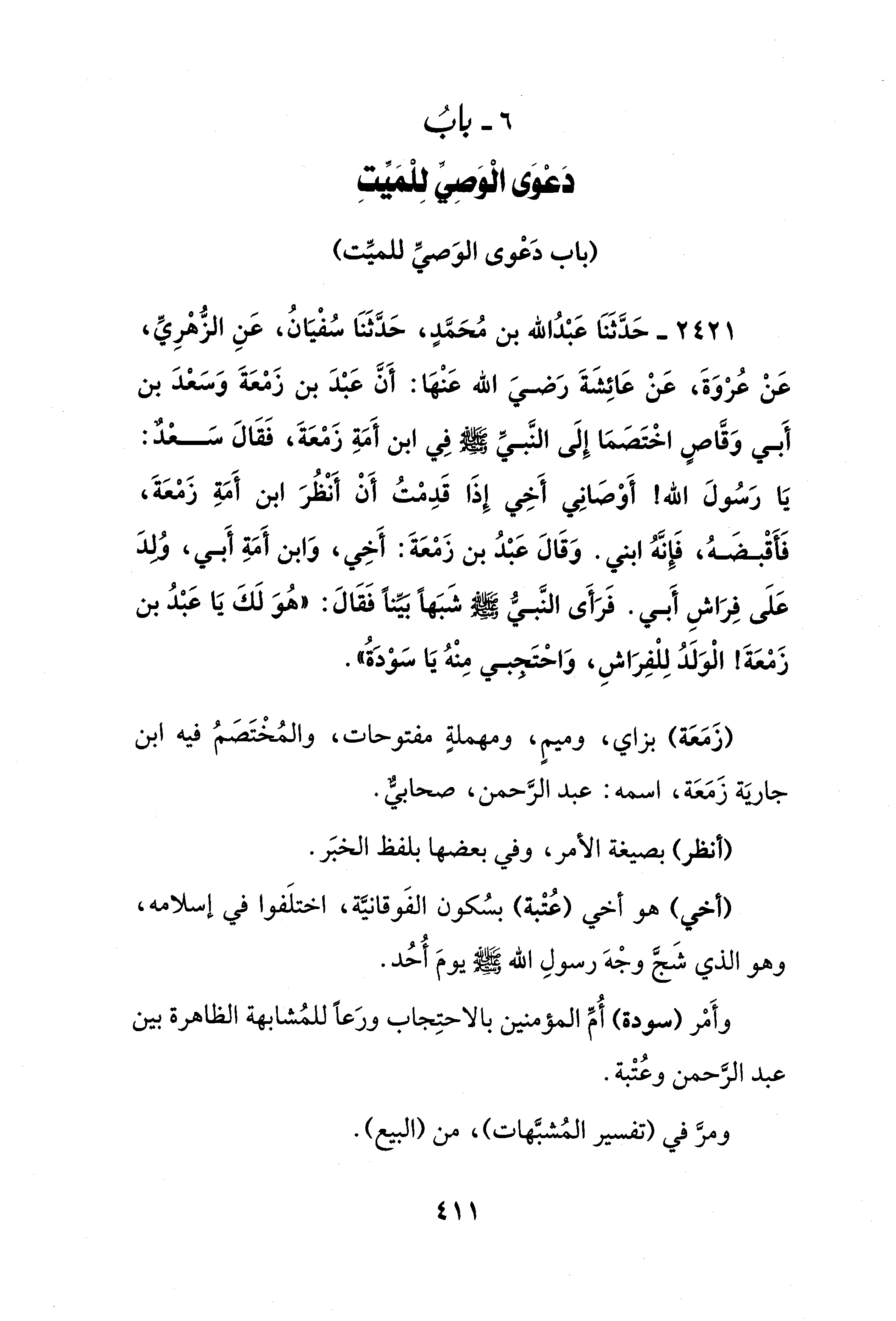 2421 - حَدَّثَنَا عَبْدُ الله بن مُحَمَّدٍ، حَدَّثَنَا سُفْيَانُ، عَنِ الزُّهْرِيِّ، عَنْ عُرْوَةَ، عَنْ عَائِشَةَ رَضيَ الله عَنْهَا: أَنَّ عَبْدَ بن زَمْعَةَ وَسَعْدَ بن أَبي وَقَّاصٍ اخْتَصَمَا إِلَى النَّبيِّ - صلى الله عليه وسلم - فِي ابن أَمَةِ زَمْعَةَ، فَقَالَ سَعْدٌ: يَا رَسُولَ الله! أَوْصَانِي أَخِي إِذَا قَدِمْتُ أَنْ أَنْظُرَ ابن أَمَةِ زَمْعَةَ، فَأَقْبضَهُ، فَإِنَّهُ ابني. وَقَالَ عَبْدُ بن زَمْعَةَ: أَخِي، وَابن أَمَةِ أَبي، وُلِدَ عَلَى فِرَاشِ أَبي. فَرَأَى النَّبيُّ - صلى الله عليه وسلم - شَبَهًا بَيِّنًا فَقَالَ: "هُوَ لَكَ يَا عَبْدُ بن زَمْعَةَ! الْوَلَدُ لِلْفِرَاشِ، وَاحْتَجِبي مِنْهُ يَا سَوْدَةُ".