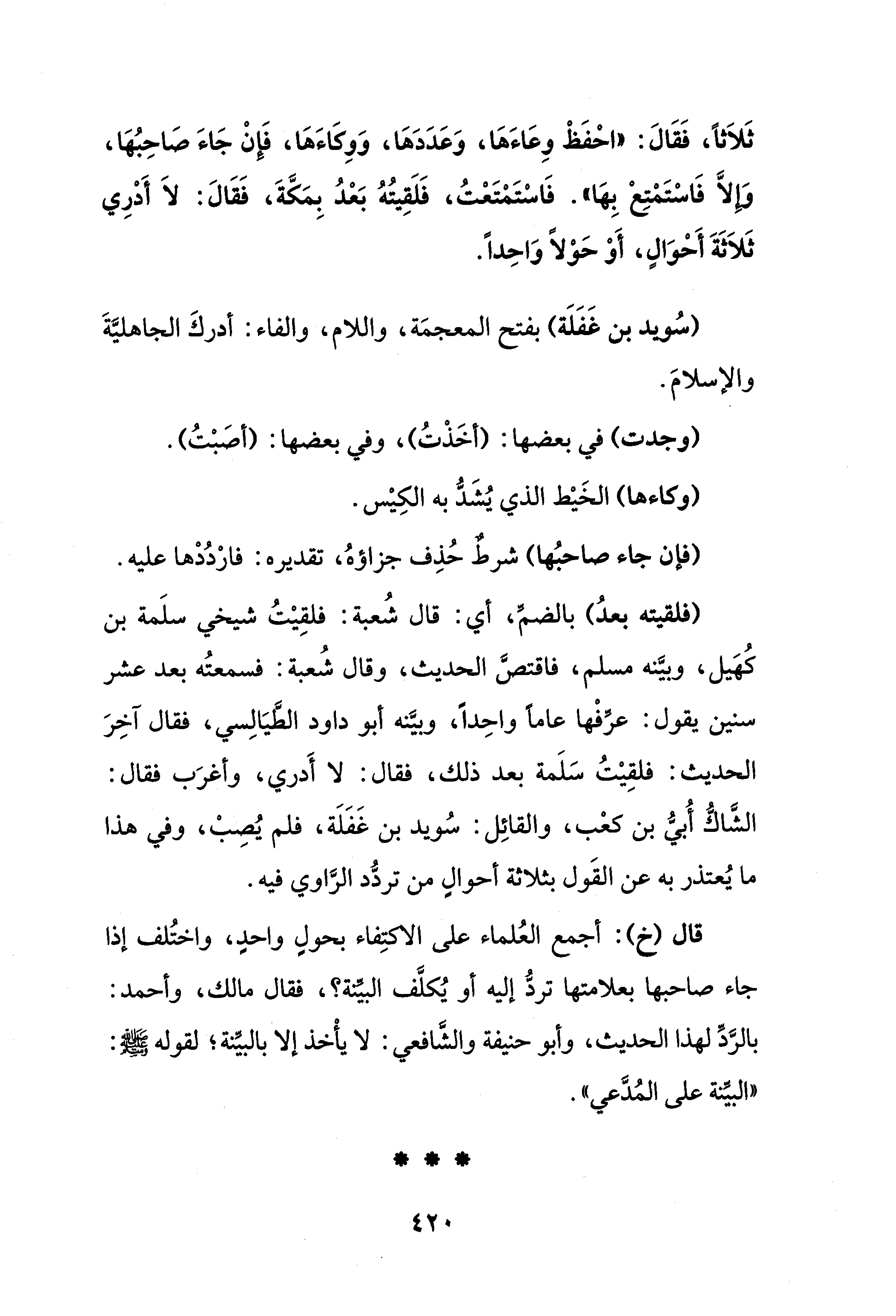 (فلقيته بعدُ) بالضمِّ، أي: قال شُعبة: فلقِيْتُ شيخي سلَمة بن كُهَيل، وبيَّنه مسلم، فاقتصَّ الحديث، وقال شُعبة: فسمعتُه بعد عشر سنين يقول: عرِّفْها عامًا واحِدًا، وبيَّنه أبو داود الطَّيَالِسي، فقال آخِرَ الحديث: فلقِيْتُ سَلَمة بعد ذلك، فقال: لا أَدري، وأغرَب فقال: الشَّاكُّ أُبيُّ بن كعْب، والقائِل: سُويد بن غَفَلَة، فلم يُصِبْ، وفي هذا ما يُعتذر به عن القَول بثلاثة أحوالٍ من تردُّد الرَّاوي فيه.