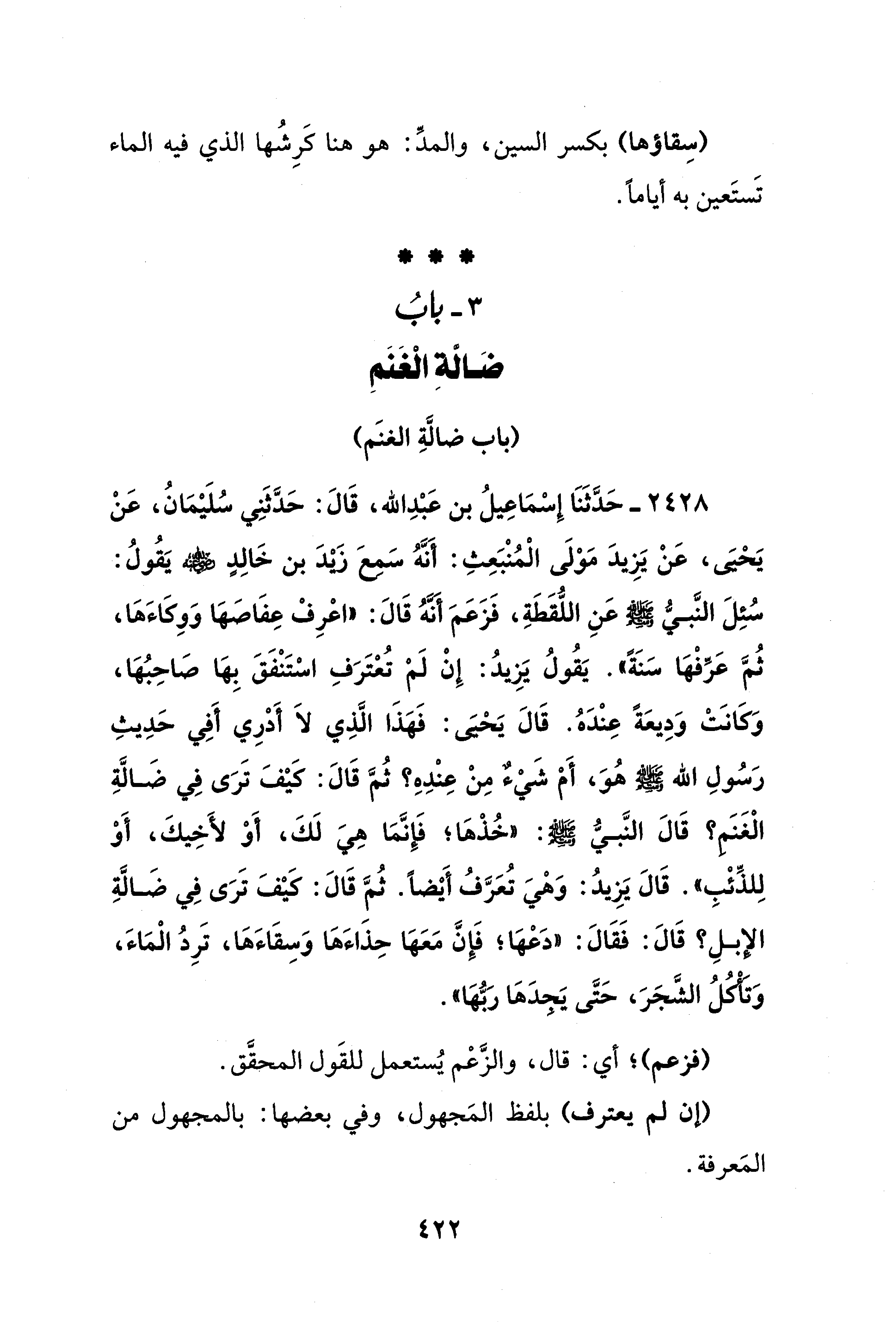 2428 - حَدَّثَنَا إِسْمَاعِيلُ بن عَبْدِ الله، قَالَ: حَدَّثَنِي سُلَيْمَانُ، عَنْ يَحْيَى، عَنْ يَزِيدَ مَوْلَى الْمُنْبَعِثِ: أَنَّهُ سَمِعَ زَيْدَ بن خَالِدٍ - رضي الله عنه - يَقُولُ: سُئِلَ النَّبيُّ - صلى الله عليه وسلم - عَنِ اللُّقَطَةِ، فَزَعَمَ أَنَّهُ قَالَ: "اعْرِفْ عِفَاصَهَا وَوِكَاءَهَا، ثُمَّ عَرِّفْهَا سَنَةً". يَقُولُ يَزِيدُ: إنْ لَمْ تُعْتَرَفِ اسْتَنْفَقَ بِهَا صَاحِبُهَا، وَكَانَتْ وَدِيعَةً عِنْدَهُ. قَالَ يَحْيَى: فَهَذَا الَّذِي لاَ أَدْرِي أَفِي حَدِيثِ رَسُولِ الله - صلى الله عليه وسلم - هُوَ، أَمْ شَيْءٌ مِنْ عِنْدِهِ؟ ثُمَّ قَالَ: كَيْفَ تَرَى فِي ضَالَّةِ الْغَنَمِ؟ قَالَ النَّبيُّ - صلى الله عليه وسلم -: "خُذْهَا؛ فَإِنَّمَا هِيَ لَكَ، أَوْ لأَخِيكَ، أَوْ لِلذِّئْبِ". قَالَ يَزِيدُ: وَهْيَ تُعَرَّفُ أَيْضًا. ثُمَّ قَالَ: كَيْفَ تَرَى فِي ضَالَّةِ الإِبلِ؟ قَالَ: فَقَالَ: "دَعْهَا؛ فَإِنَّ مَعَهَا حِذَاءَهَا وَسقَاءَهَا، تَرِدُ الْمَاءَ، وَتَأْكلُ الشَّجَرَ، حَتَّى يَجِدَهَا رَبُّهَا".