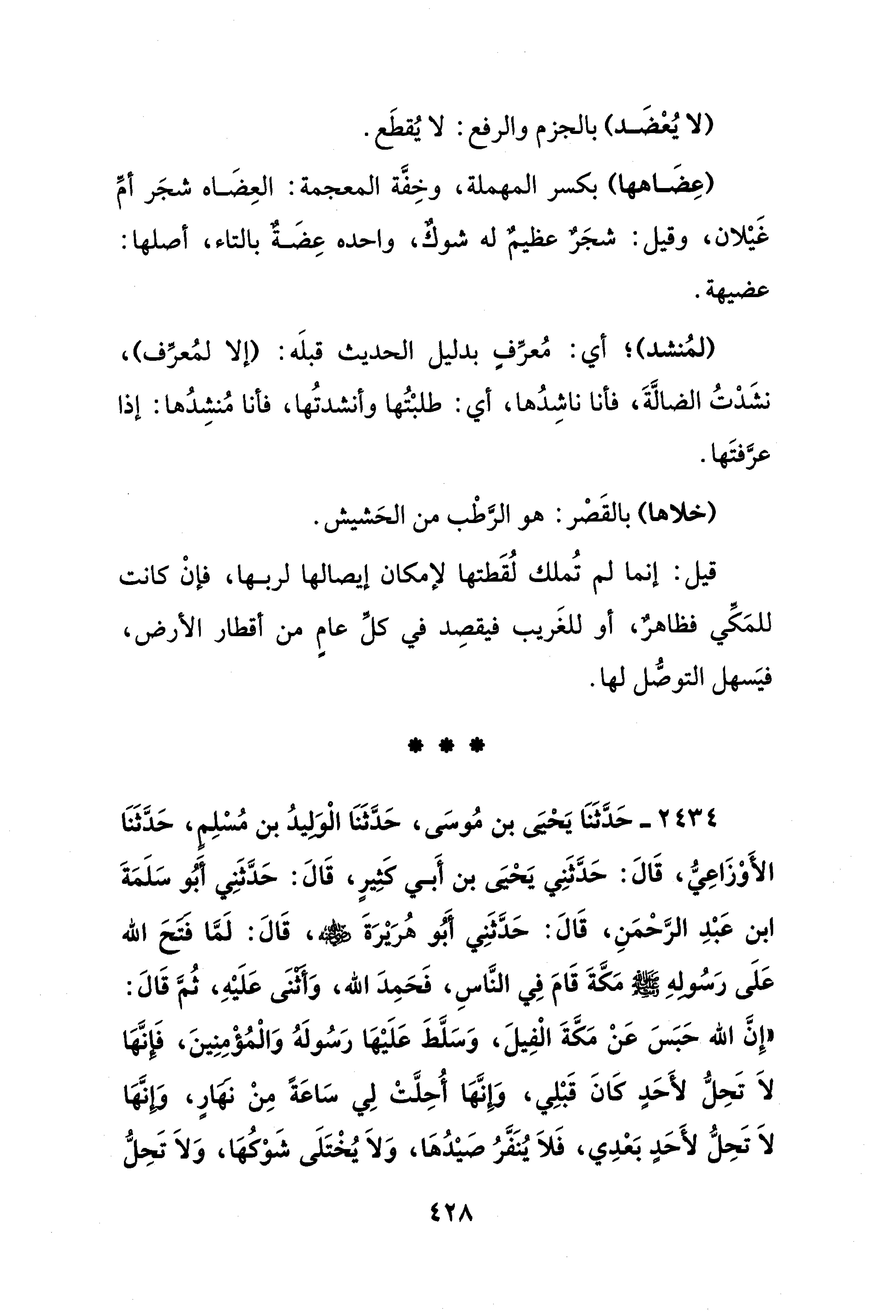 2434 - حَدَّثَنَا يَحْيَى بن مُوسَى، حَدَّثَنَا الْوَلِيدُ بن مُسْلِمٍ، حَدَّثَنَا الأَوْزَاعِيُّ، قَالَ: حَدَّثَنِي يَحْيَى بن أَبي كَثِيرٍ، قَالَ: حَدَّثَنِي أَبُو سَلَمَةَ ابن عَبْدِ الرَّحْمَنِ، قَالَ: حَدَّثَنِي أَبُو هُرَيْرَةَ - رضي الله عنه -، قَالَ: لَمَّا فتحَ الله عَلَى رَسُولِهِ - صلى الله عليه وسلم - مَكَّةَ قَامَ فِي النَّاسِ، فَحَمِدَ الله، وَأثْنَى عَلَيْهِ، ثُمَّ قَالَ: "إِنَّ الله حَبَسَ عَنْ مَكَّةَ الْفِيلَ، وَسَلَّطَ عَلَيْهَا رَسُولَهُ وَالْمُؤْمِنِينَ، فَإنَّهَا لاَ تَحِلُّ لأَحَدٍ كَانَ قَبْلِي، وَإِنَّهَا أُحِلَّتْ لِي سَاعَةً مِنْ نَهَارٍ، وَإِنَّهَا لاَ تَحِلُّ لأَحَدٍ بَعْدِي، فَلاَ يُنَفَّرُ صَيْدُهَا، وَلاَ يُخْتَلَى شَوْكُهَا، وَلاَ تَحِلُّ