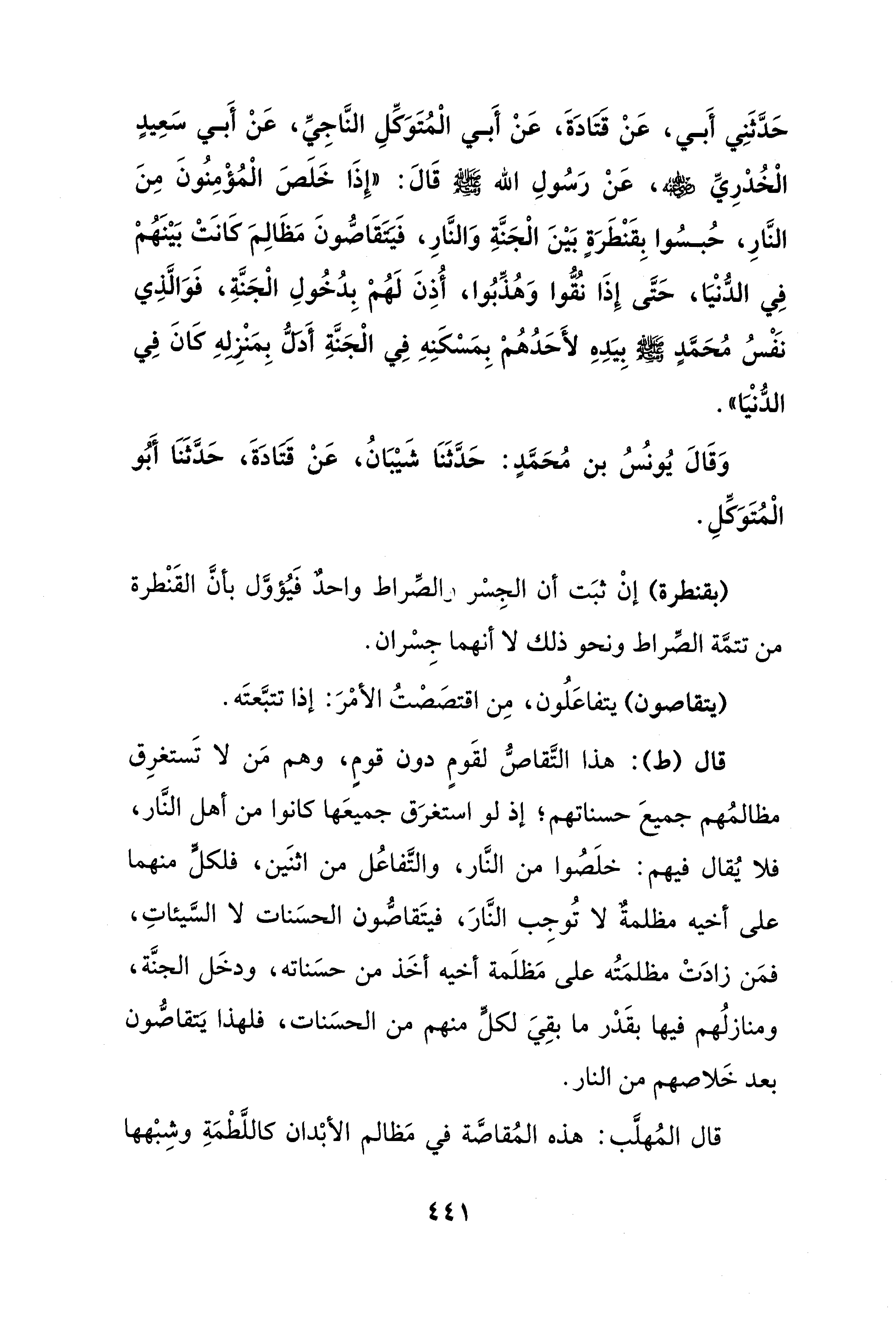 حَدَّثَنِي أَبي، عَنْ قَتَادَةَ، عَنْ أَبي الْمُتَوَكِّلِ النَّاجِيِّ، عَنْ أَبي سَعِيدٍ الْخُدْرِيِّ - رضي الله عنه -، عَنْ رَسُولِ الله - صلى الله عليه وسلم - قَالَ: "إِذَا خَلَصَ الْمُؤْمِنُونَ مِنَ النَّارِ، حُبسُوا بِقَنْطَرَةٍ بَيْنَ الْجَنَّةِ وَالنَّارِ، فَيَتَقَاضُّونَ مَظَالِمَ كَانَتْ بَيْنَهُمْ فِي الدُّنْيَا، حَتَّى إِذَا نُقُّوا وَهُذِّبُوا، أُذِنَ لَهُمْ بِدُخُولِ الْجَنَّةِ، فَوَالَّذِي نَفْسُ مُحَمَّدٍ - صلى الله عليه وسلم - بِيَدِهِ لأَحَدُهُمْ بِمَسْكَنِهِ فِي الْجَنَّةِ أَدَلُّ بِمَنْزِلهِ كَانَ فِي الدُّنْيَا".