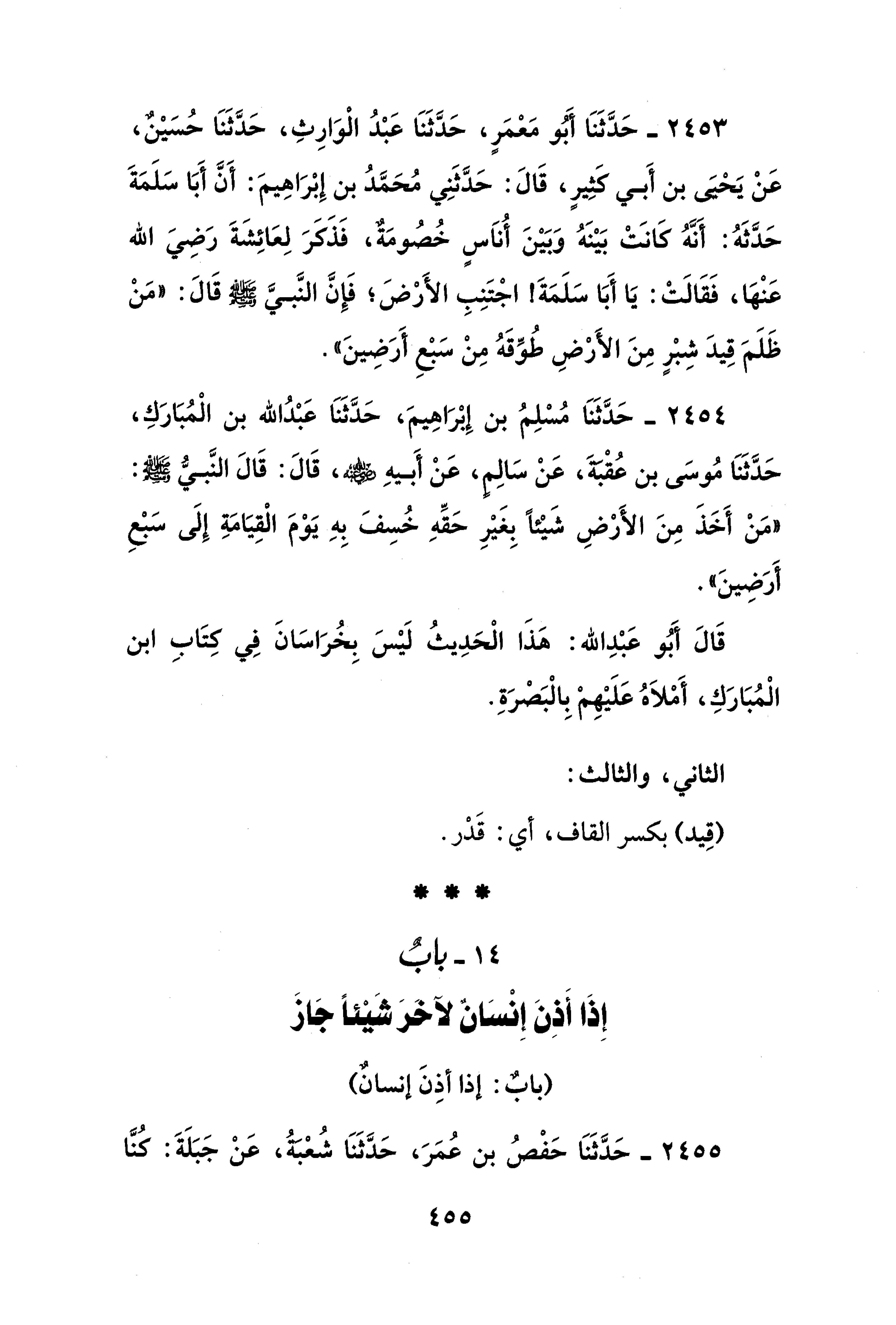 2453 - حَدَّثَنَا أَبُو مَعْمَرٍ، حَدَّثَنَا عَبْدُ الْوَارِثِ، حَدَّثَنَا حُسَيْنٌ، عَنْ يَحْيَى بن أَبي كَثِيرٍ، قَالَ: حَدَّثَنِي مُحَمَّدُ بن إِبْرَاهِيمَ: أَنَّ أَبَا سَلَمَةَ حَدَّثَهُ: أَنَّهُ كَانَتْ بَيْنَهُ وَبَيْنَ أُنَاسٍ خُصُومَةٌ، فَذَكَرَ لِعَائِشَةَ رَضِيَ الله عَنْهَا، فَقَالَتْ: يَا أَبَا سَلَمَةَ! اجْتَنِبِ الأَرْضَ؛ فَإِنَّ النَّبيَّ - صلى الله عليه وسلم - قَالَ: "مَنْ ظَلَمَ قِيدَ شِبْرٍ مِنَ الأَرْضِ طُوِّقَهُ مِنْ سَبْعِ أَرَضِينَ".