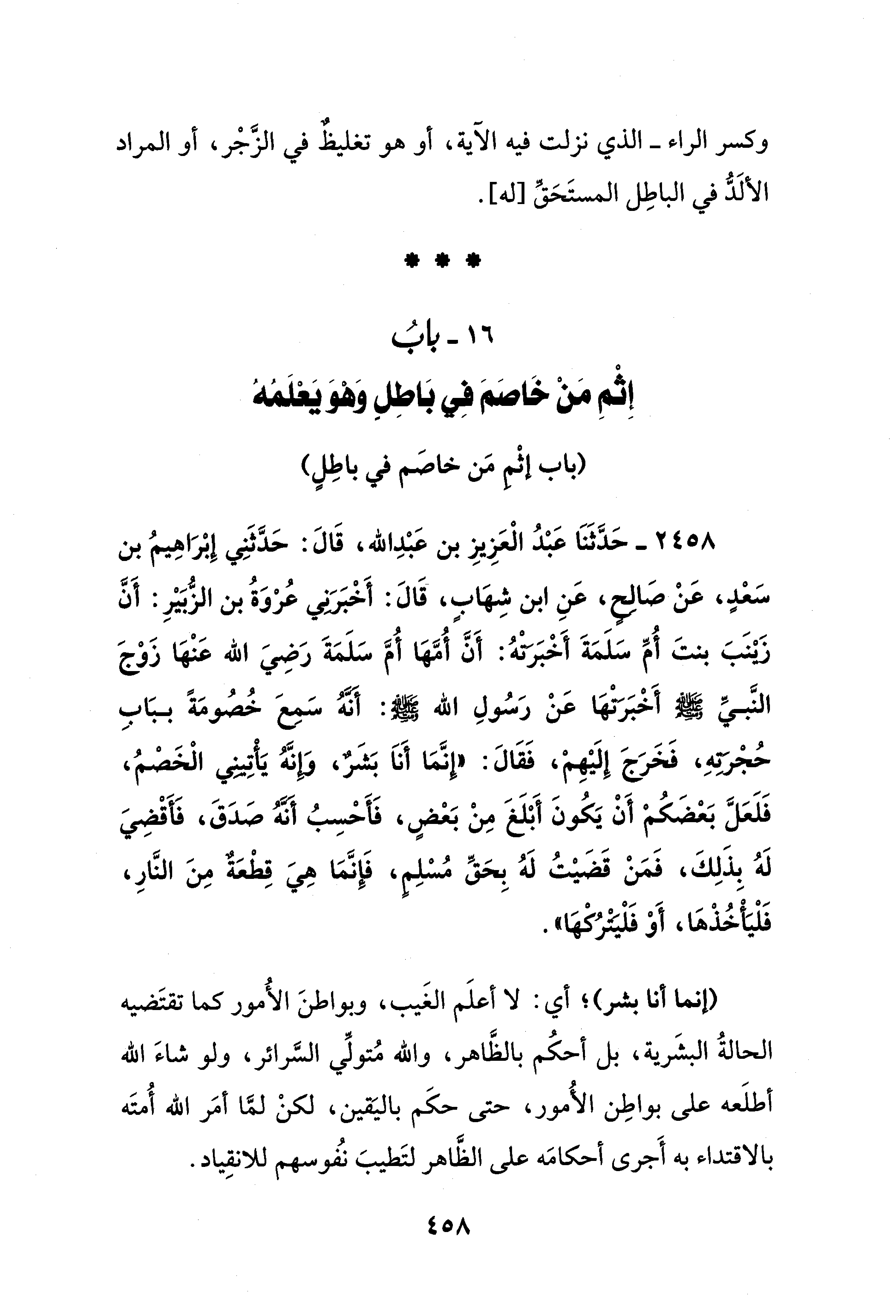 2458 - حَدَّثَنَا عَبْدُ الْعَزِيزِ بن عَبْدِ الله، قَالَ: حَدَّثَنِي إِبْرَاهِيمُ بن سَعْدٍ، عَنْ صَالح، عَنِ ابن شِهَابٍ، قَالَ: أَخْبَرني عُرْوَةُ بن الزُّبَيْرِ: أَنَّ زينَبَ بنتَ أُمِّ سَلمَةَ أَخْبَرتهُ: أَنَّ أُمَّهَا أُمَّ سَلَمَةَ رَضِيَ الله عَنْهَا زَوْجَ النَّبيِّ - صلى الله عليه وسلم - أَخْبَرتْهَا عَنْ رَسُولِ الله - صلى الله عليه وسلم -: أَنَّهُ سَمِعَ خُصُومَةً ببَابِ حُجْرَتهِ، فَخَرَجَ إِلَيْهِمْ، فَقَالَ: "إِنَّمَا أَناَ بَشَرٌ، وَإِنَّهُ يَأتِيني الْخَصْمُ، فَلَعَلَّ بَعْضَكُمْ أَنْ يَكُونَ أَبْلَغَ مِنْ بَعْضٍ، فَأحْسِبُ أَنَّهُ صَدَقَ، فَأقْضِيَ لَهُ بِذَلِكَ، فَمَنْ قَضَيْتُ لَهُ بِحَقِّ مُسْلِمٍ، فَإنَّمَا هِيَ قِطْعَة مِنَ النَّارِ، فَلْيَأْخُذْهَا، أَوْ فَلْيتركْهَا".