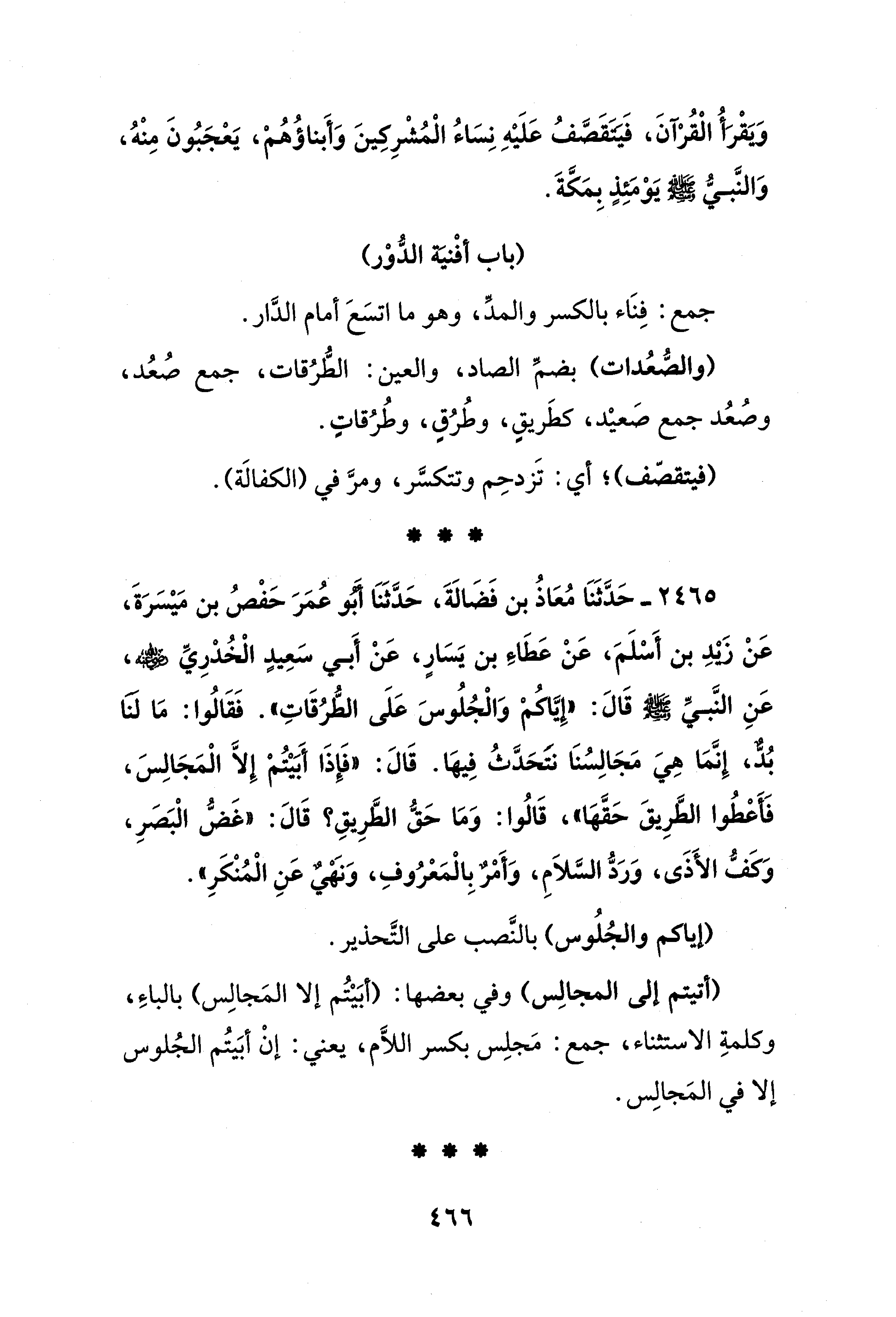 2465 - حَدَّثَنَا مُعَاذُ بن فَضَالَةَ، حَدَّثَنَا أبو عُمَرَ حَفْصُ بن مَيْسَرَةَ، عَنْ زيدِ بن أَسْلَمَ، عَنْ عَطَاءِ بن يَسَارٍ، عَنْ أَبي سَعِيدٍ الْخُدْرِيِّ - رضي الله عنه -، عَنِ النَّبيِّ - صلى الله عليه وسلم - قَالَ: "إياكُمْ وَالْجُلُوسَ عَلَى الطُّرُقَاتِ". فَقَالُوا: مَا لنا بُد، إِنَّمَا هِيَ مَجَالِسُنَا نتَحَدَّثُ فِيهَا. قَالَ: "فَإِذَا أَبَيْتُمْ إِلَّا الْمَجَالِسَ، فَأعْطُوا الطَّرِيقَ حَقَّهَا"، قَالُوا: وَمَا حَقُّ الطَّرِيقِ؟ قَالَ: "غَضُّ الْبَصَرِ، وَكَفُّ الأَذَى، وَرَدُّ السَّلاَمِ، وَأَمْرٌ بِالْمَعْرُوفِ، وَنَهْيٌ عَنِ الْمُنْكَرِ".
