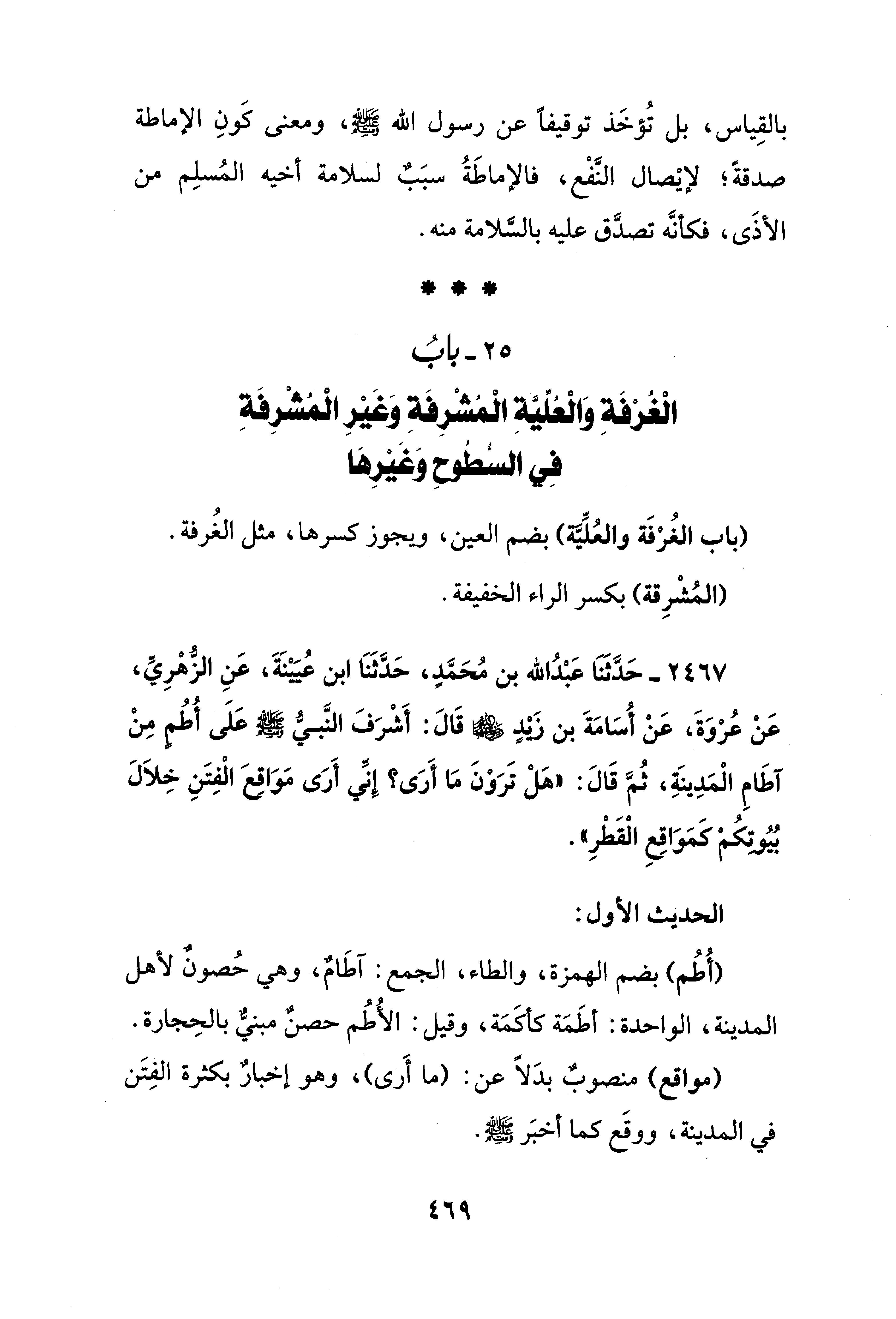 2467 - حَدَّثَنَا عَبْدُ الله بن مُحَمَّد، حَدَّثَنَا ابن عُيَيْنَةَ، عَنِ الزُّهْرِيِّ، عَنْ عُرْوَةَ، عَنْ أُسَامَةَ بن زيدٍ - رضي الله عنهما - قَالَ: أَشْرَف النَّبيُّ - صلى الله عليه وسلم - عَلَى أُطُمٍ مِنْ آطَامِ الْمَدِينَةِ، ثُمَّ قَالَ: "هَلْ تَرَوْنَ مَا أَرَى؟ إِنِّي أَرَى مَوَاقع الْفِتَنِ خِلاَلَ بُيُوتكُمْ كَمَوَاقِعِ الْقَطْرِ".