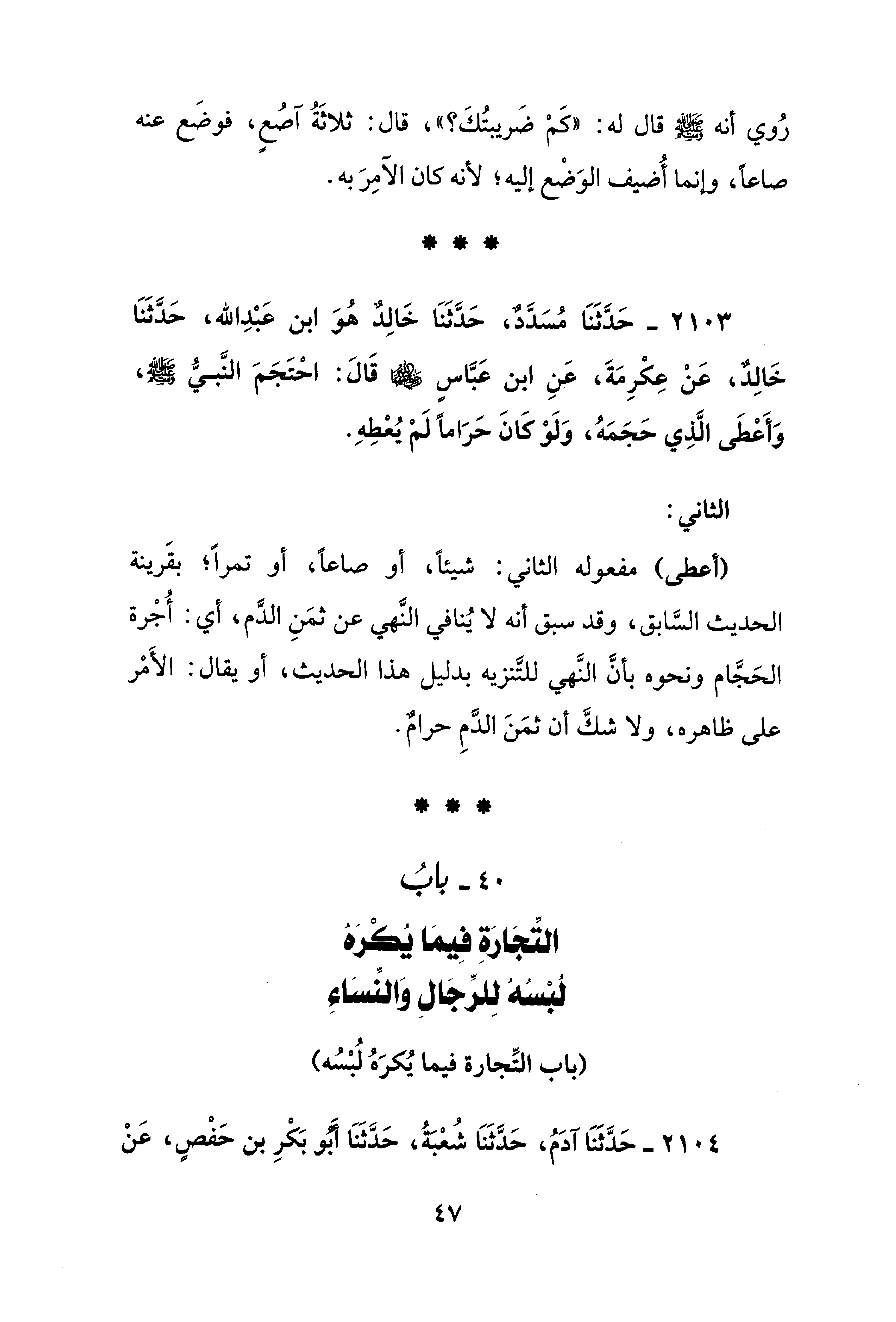 2103 - حَدَّثَنَا مُسَدَّدٌ، حَدَّثَنَا خَالِدٌ هُوَ ابن عَبْدِ الله، حَدَّثَنَا خَالدٌ، عَنْ عِكْرِمَةَ، عَنِ ابن عَبَّاسٍ - رضي الله عنها - قَالَ: احْتَجَمَ النَّبيُّ - صلى الله عليه وسلم -، وَأَعْطَى الَّذِي حَجَمَهُ، وَلَوْ كَانَ حَرَامًا لَم يُعطِهِ.
