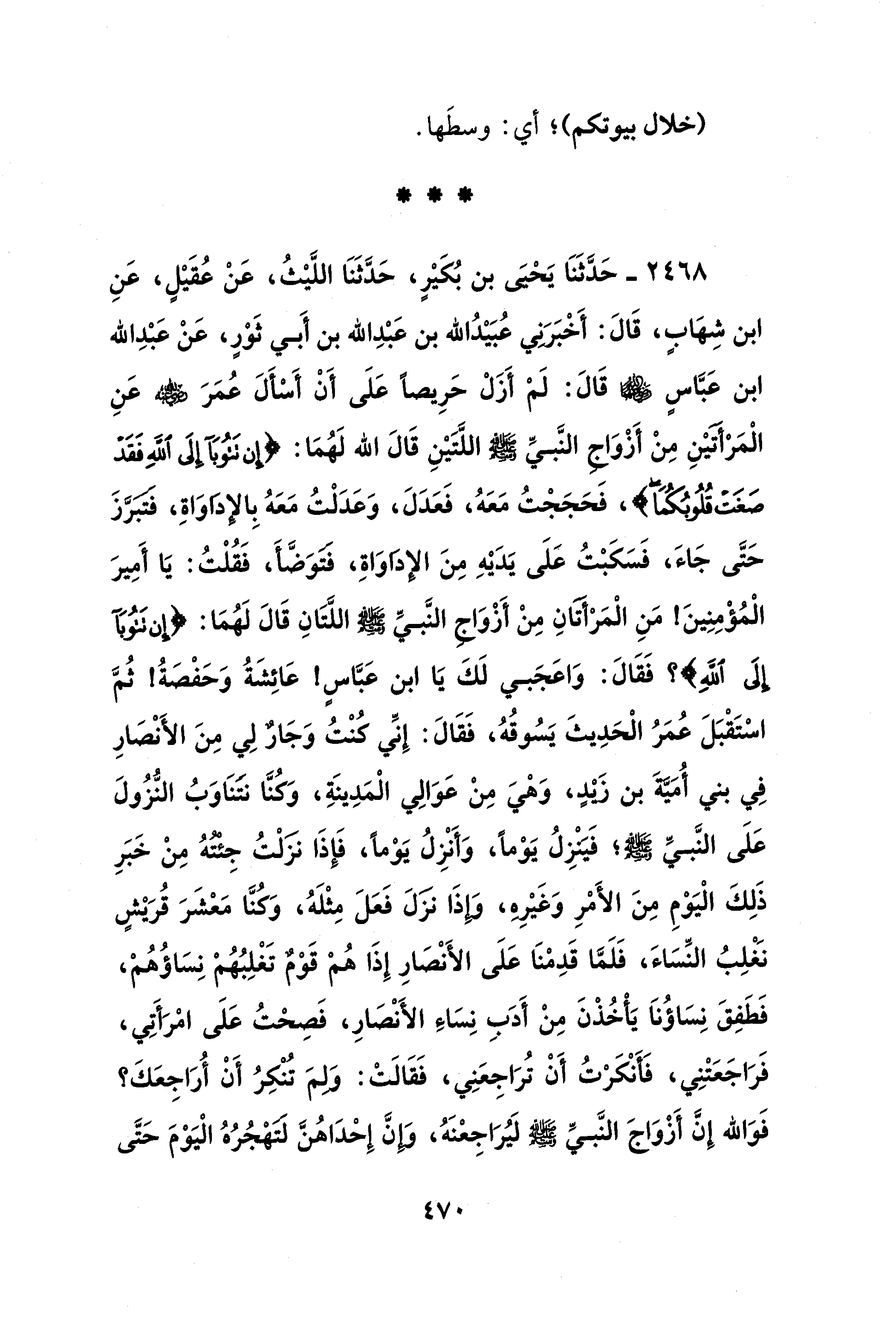 2468 - حَدَّثَنَا يَحْيَى بن بُكَيْرٍ، حَدَّثَنَا اللَّيْثُ، عَنْ عُقَيْلٍ، عَنِ ابن شِهَابٍ، قَالَ: أَخْبَرَني عُبَيْدُ الله بن عَبْدِ الله بن أَبي ثَوْرٍ، عَنْ عَبْدِ الله ابن عَبَّاسٍ قَالَ: لَمْ أَزَلْ حَرِيصًا عَلَى أَنْ أَسْأَلَ عُمَرَ - رضي الله عنه - عَنِ الْمَرأتيْنِ مِنْ أَزْوَاجِ النَّبيِّ - صلى الله عليه وسلم - اللَّتَيْنِ قَالَ الله لَهُمَا: {إِنْ تَتُوبَا إِلَى اللَّهِ فَقَدْ صَغَتْ قُلُوبُكُمَا}، فَحَجَجْتُ مَعَهُ، فَعَدَلَ، وَعَدَلْتُ مَعَهُ بِالإداوَاةِ، فتبرَّزَ حَتَّى جَاءَ، فَسَكَبْتُ عَلَى يَدَيْهِ مِنَ الإداوَاةِ، فتوَضَّأ، فَقُلْتُ: يَا أَمِيرَ الْمُؤْمِنِينَ! مَنِ الْمَرْأتانِ مِنْ أَزْوَاجِ النَّبيِّ - صلى الله عليه وسلم - اللَّتَانِ قَالَ لَهُمَا: {إِنْ تَتُوبَا إِلَى اللَّهِ}؟ فَقَالَ: وَاعَجَبي لَكَ يَا ابن عَبَّاسٍ عَائِشَةُ وَحَفْصَةُ ثُمَّ اسْتَقْبَلَ عُمَرُ الْحَدِيثَ يَسُوقُهُ، فَقَالَ: إِنِّي كُنْتُ وَجَارٌ لِي مِنَ الأَنْصَارِ فِي بني أُمَيَّةَ بن زيدٍ، وَهْيَ مِنْ عَوَالِي الْمَدِينَةِ، وَكنَّا نتَنَاوَبُ النُّزُولَ عَلَى النَّبيِّ - صلى الله عليه وسلم -؛ فَيَنْزِلُ يَومًا، وَأَنْزِلُ يَومًا، فَإِذَا نزلْتُ جِئتهُ مِنْ خَبَرِ ذَلِكَ الْيَوْمِ مِنَ الأَمْرِ وَغيْرِهِ، وإذَا نزلَ فَعَلَ مِثْلَهُ، وَكنَّا مَعْشَرَ قُرَيْشٍ نَغْلِبُ النِّسَاءَ، فَلَمَّا قَدِمْنَا عَلَى الأَنْصَارِ إِذَا هُمْ قَوْمٌ تَغْلِبُهُمْ نِسَاؤُهُمْ، فَطَفِقَ نِسَاؤُناَ يَأخُذْنَ مِنْ أَدَبِ نِسَاء الأَنْصَارِ، فَصِحْتُ عَلَى امْرَأَتِي، فَرَاجَعَتْنِي، فَأَنْكَرْتُ أَنْ تُرَاجِعَنِي، فَقَالَتْ: وَلم تُنْكِرُ أَنْ أُرَاجِعَكَ؟ فَوَالله إِنَّ أَزْوَاجَ النَّبيِّ - صلى الله عليه وسلم - لَيُرَاجِعْنَهُ، وإنَّ إحْدَاهُنَّ لتهْجُرُهُ الْيَوْمَ حَتَّى