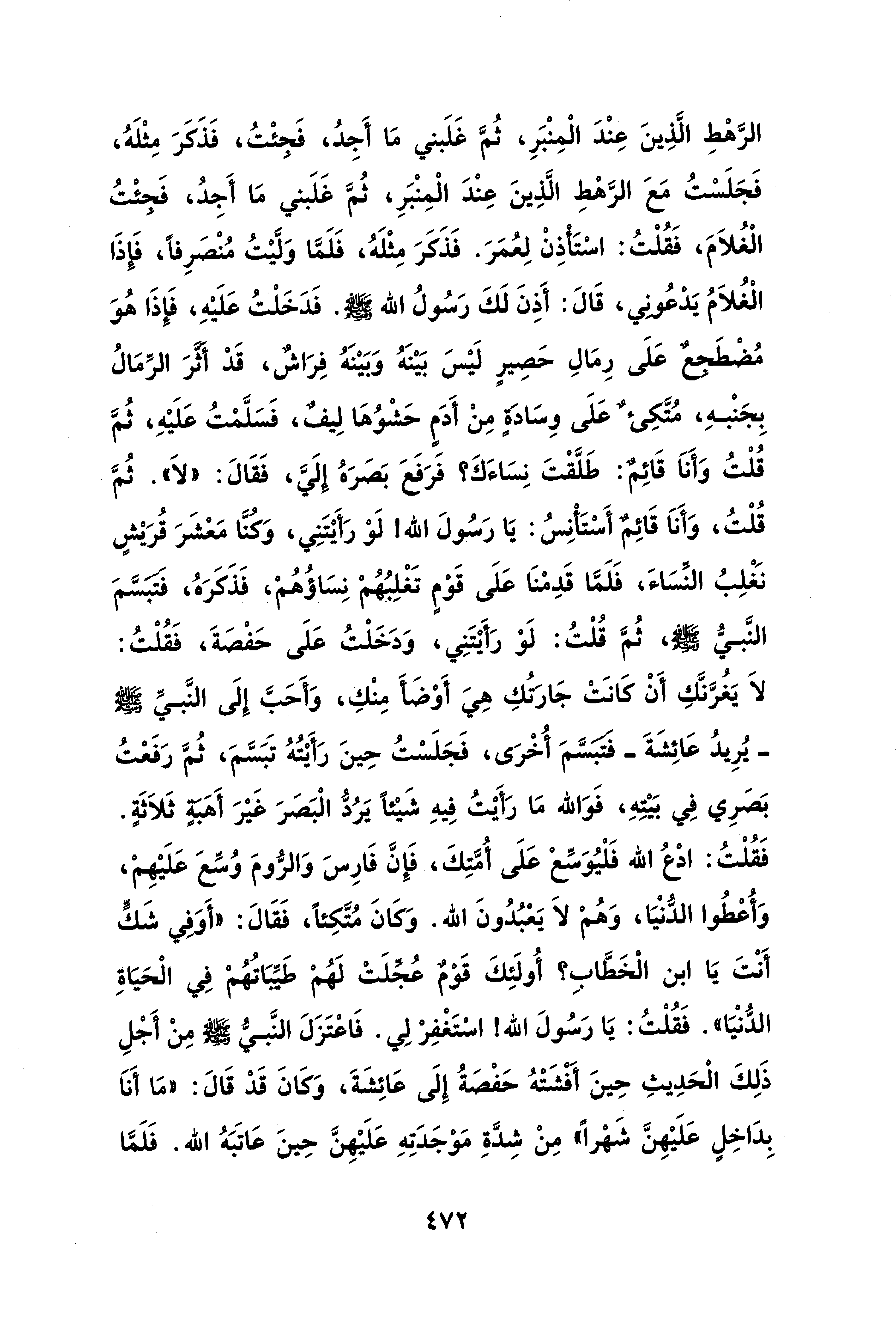 الرَّهْطِ الَّذِينَ عِنْدَ الْمِنْبَرِ، ثُمَّ غَلَبني مَا أَجِدُ، فَجئْتُ، فَذَكَرَ مِثْلَهُ، فَجَلَسْتُ مَعَ الرَّهْطِ الَّذِينَ عِنْدَ الْمِنْبَرِ، ثُمَّ غَلَبني مَا أَجِدُ، فَجئْتُ الْغُلاَمَ، فَقُلْتُ: اسْتَأذِنْ لِعُمَرَ. فَذَكَرَ مِثْلَهُ، فَلَمَّا وَلَّيْتُ مُنْصَرِفًا، فَإِذَا الْغُلاَمُ يَدْعُوني، قَالَ: أَذِنَ لَكَ رَسُولُ الله - صلى الله عليه وسلم -. فَدَخَلْتُ عَلَيْهِ، فَإِذَا هُوَ مُضْطَجِعٌ عَلَى رِمَالِ حَصِيرٍ لَيْسَ بَيْنَهُ وَبَيْنَهُ فِرَاشٌ، قَدْ أثرَ الرِّمَالُ بِجَنْبهِ، مُتَّكِئٌ عَلَى وِسَادَةٍ مِنْ أَدَمٍ حَشْوُهَا لِيفٌ، فَسَلَّمْتُ عَلَيْهِ، ثُمَّ قُلْتُ وَأَناَ قَائِمٌ: طَلَّقْتَ نِسَاءَكَ؟ فرَفَعَ بَصَرَهُ إِلَيَّ، فَقَالَ: "لاَ". ثُمَّ قُلْتُ، وَأَناَ قَائِمٌ أَسْتَأنِسُ: يَا رَسُولَ الله! لَوْ رَأَيْتَنِي، وَكنَّا مَعْشَرَ قُرَيْش نَغْلِبُ النِّسَاءَ، فَلَمَّا قَدِمْنَا عَلَى قَوْمٍ تَغْلِبُهُمْ نِسَاؤُهُمْ، فَذَكَرَهُ، فتَبَسَّمَ النَّبيُّ - صلى الله عليه وسلم -، ثُمَّ قُلْتُ: لَوْ رَأَيْتَنِي، وَدَخَلْتُ عَلَى حَفْصَةَ، فَقُلْتُ: لاَ يَغرَّنَّكِ أَنْ كَانَتْ جَارَتُكِ هِيَ أَوْضَأ مِنْكِ، وَأَحَبَّ إِلَى النَّبيِّ - صلى الله عليه وسلم - -يُرِيدُ عَائِشَةَ- فتبسَّمَ أُخْرَى، فَجَلَسْتُ حِينَ رَأَيْتُهُ تَبَسَّمَ، ثُمَّ رَفَعْتُ بَصَرِي فِي بَيْتِهِ، فَوَالله مَا رَأَيْتُ فِيهِ شَيْئًا يَرُدُّ الْبَصَرَ غَيْرَ أَهَبةٍ ثَلاَثَةٍ. فَقُلْتُ: ادْعُ الله فَلْيُوَسِّعْ عَلَى أُمَّتِكَ، فَإنَّ فَارِسَ وَالرُّومَ وُسِّعَ عَلَيْهِمْ، وَأُعْطُوا الدُّنْيَا، وَهُمْ لاَ يَعْبُدُونَ الله. وَكَانَ مُتَّكِئًا، فَقَالَ: "أَوَفِي شَكٍّ أَنْتَ يَا ابن الْخَطَّابِ؟ أُولَئِكَ قَوْم عُجِّلَتْ لَهُمْ طَيِّبَاتُهُمْ فِي الْحَيَاةِ الدُّنْيَا". فَقُلْتُ: يَا رَسُولَ الله اسْتَغْفِر لِي. فَاعْتَزَلَ النَّبي - صلى الله عليه وسلم - مِنْ أَجْلِ ذَلِكَ الْحَدِيثِ حِينَ أَفْشَتْهُ حَفْصَةُ إلَى عَائِشَةَ، وَكَانَ قَدْ قَالَ: "مَا أَناَ بِدَاخِلٍ عَلَيْهِنَّ شَهْرًا" مِنْ شِدَّةِ مَوْجَدَتِهِ عَلَيْهِنَّ حِينَ عَاتَبَهُ الله. فَلَمَّا