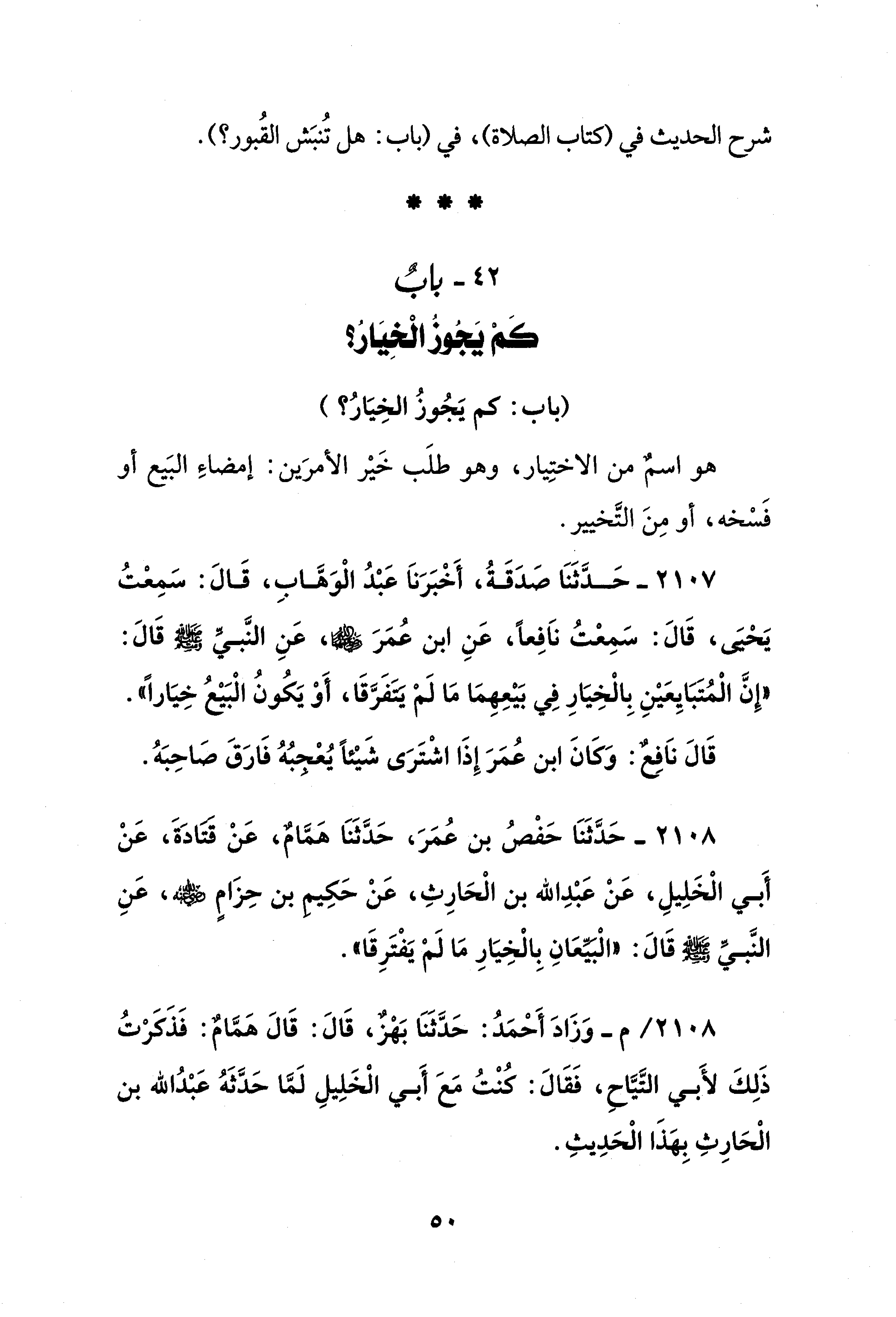 2108 - حَدَّثَنَا حَفْصُ بن عُمَرَ، حَدَّثَنَا همَّامٌ، عَنْ قتَادة، عَنْ أَبي الْخَلِيلِ، عَنْ عَبْدِ الله بن الْحَارِثِ، عَنْ حَكِيم بن حِزَامٍ - رضي الله عنه -، عَنِ النَّبيِّ - صلى الله عليه وسلم - قَالَ: "الْبَيِّعَانِ بِالْخِيَارِ مَا لَم يَفْتَرِقَا".