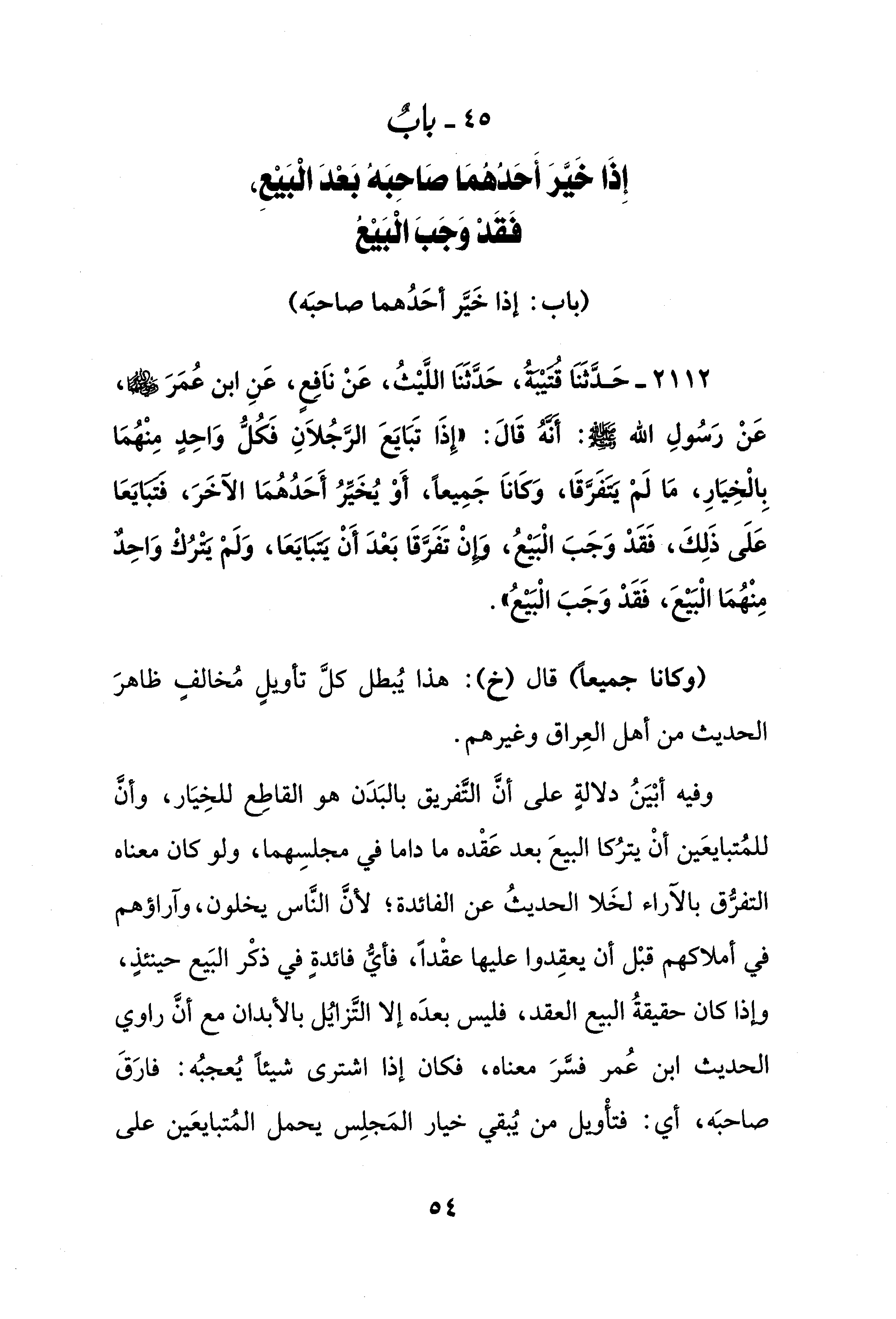 2112 - حَدَّثَنَا قتيْبةُ، حَدَّثَنَا اللَّيْثُ، عَنْ ناَفِعٍ، عَنِ ابن عُمَر - رضي الله عنهما - عَنْ رَسُولِ الله - صلى الله عليه وسلم -: أنَّهُ قَالَ: "إِذَا تَبَايَعَ الرَّجُلاَنِ فَكُلُّ وَاحِدٍ مِنْهُمَا بِالْخِيَارِ، مَا لَم يتَفَرَّقَا، وَكَاناَ جَمِيعًا، أَوْ يُخَيِّرُ أَحَدُهُمَا الآخَرَ، فتبايَعَا عَلَى ذَلِكَ، فَقدْ وَجَبَ الْبَيْعُ، وَإِنْ تَفَرَّقَا بَعْدَ أَنْ يتبَايَعَا، وَلَمْ يتْرُكْ وَاحدٌ مِنْهُمَا الْبَيع، فَقد وَجَبَ الْبَيع".