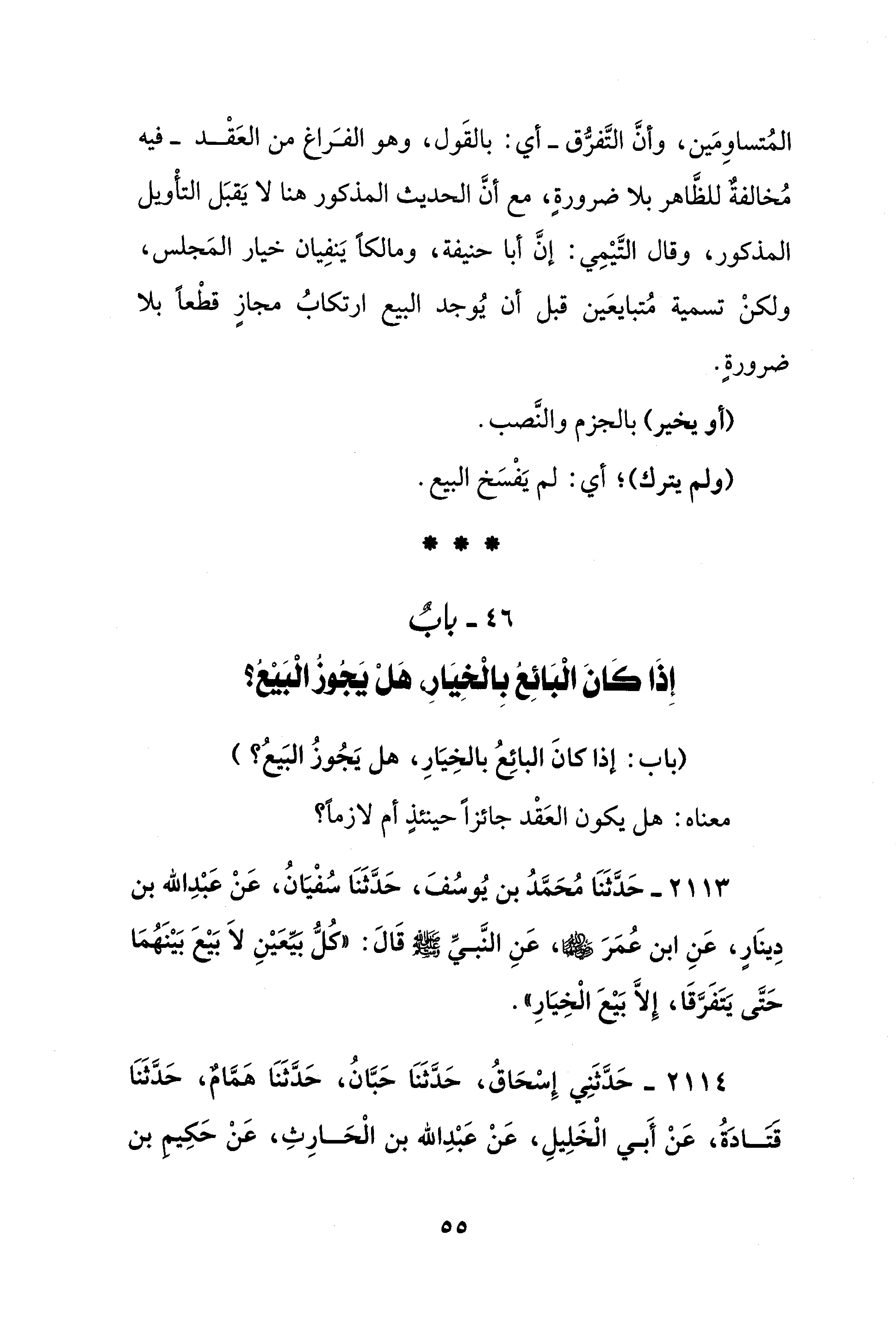 2113 - حَدَّثَنَا مُحَمَّدُ بن يُوسُفَ، حَدَّثَنَا سُفْيَانُ، عَنْ عَبْدِ الله بن دِينَارٍ، عَنِ ابن عُمَرَ، عَنِ النَّبيِّ - رضي الله عنه - قَالَ: "كُلُّ بيِّعَيْنِ لاَ بَيْعَ بَيْنَهُمَا حَتَّى يتفَرَّقَا، إِلَّا بَيْعَ الْخِيَارِ".