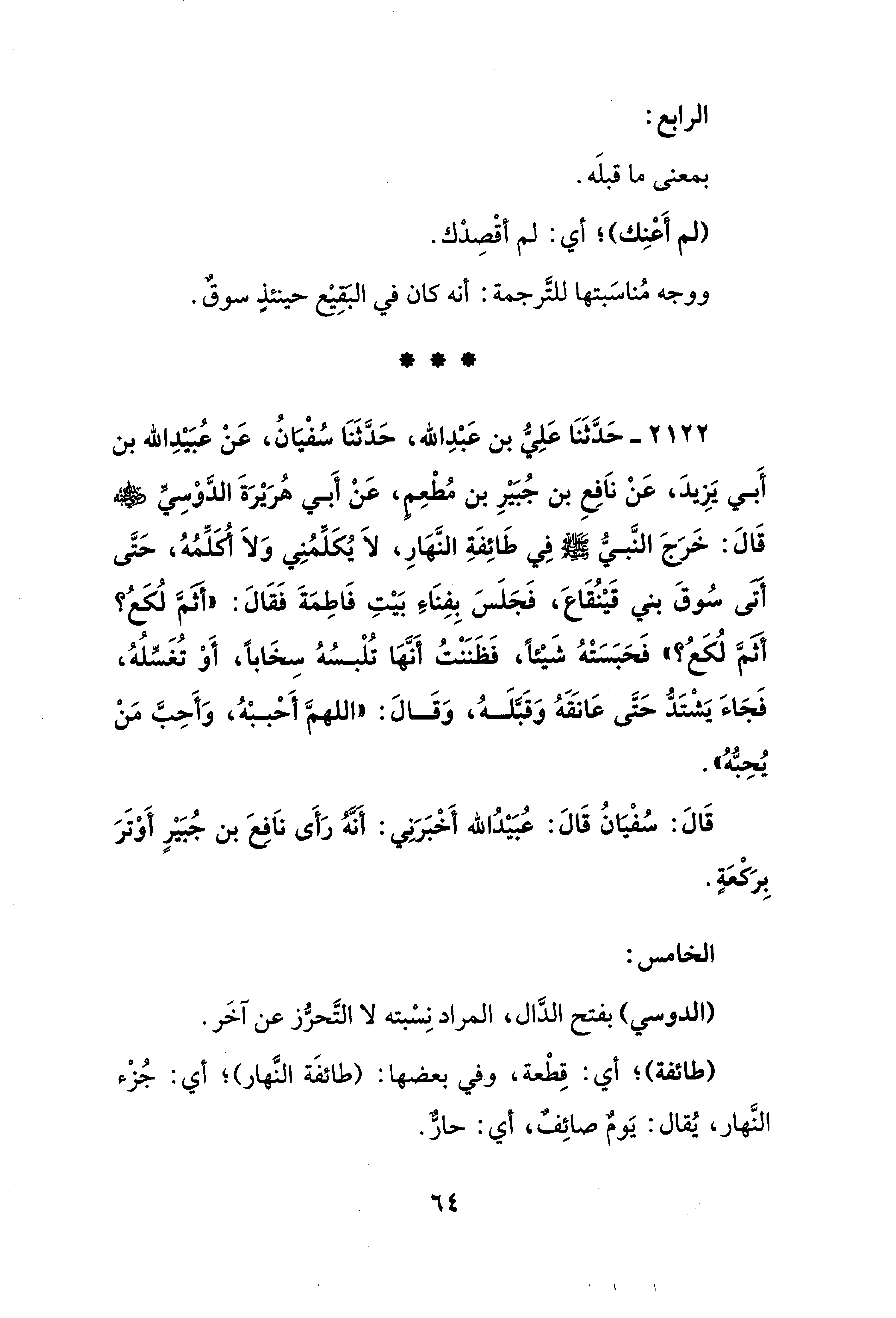 2122 - حَدَّثَنَا عَلِيُّ بن عَبْدِ الله، حَدَّثَنَا سُفْيَانُ، عَنْ عُبَيْدِ الله بن أَبي يَزِيدَ، عَنْ نافِعِ بن جُبَيْرِ بن مُطْعِمٍ، عَنْ أَبي هُرَيْرَةَ الدَّوْسِيِّ - رضي الله عنه - قَالَ: خَرَجَ النَّبيُّ - صلى الله عليه وسلم - في طَائِفَةِ النَّهَارِ، لاَ يُكَلِّمُنِي وَلاَ أُكَلِّمُهُ، حَتَّى أتى سُوقَ بني قَيْنُقَاعَ، فَجَلَسَ بِفِنَاءِ بَيْتِ فَاطِمَةَ فَقَالَ: "أثَمَّ لُكَعُ؟ أثَمَّ لُكَعُ؟ " فَحَبَسَتْهُ شَيْئًا، فَظَنَنْتُ أَنَّهَا تُلْبسُهُ سِخَابًا، أَوْ تُغَسِّلُهُ، فَجَاءَ يَشْتَدُّ حَتَّى عَانَقَهُ وَقَبَّلَهُ، وَقَالَ: "اللهمَّ أَحْببْهُ، وَأَحِبَّ مَنْ يُحِبُّهُ".