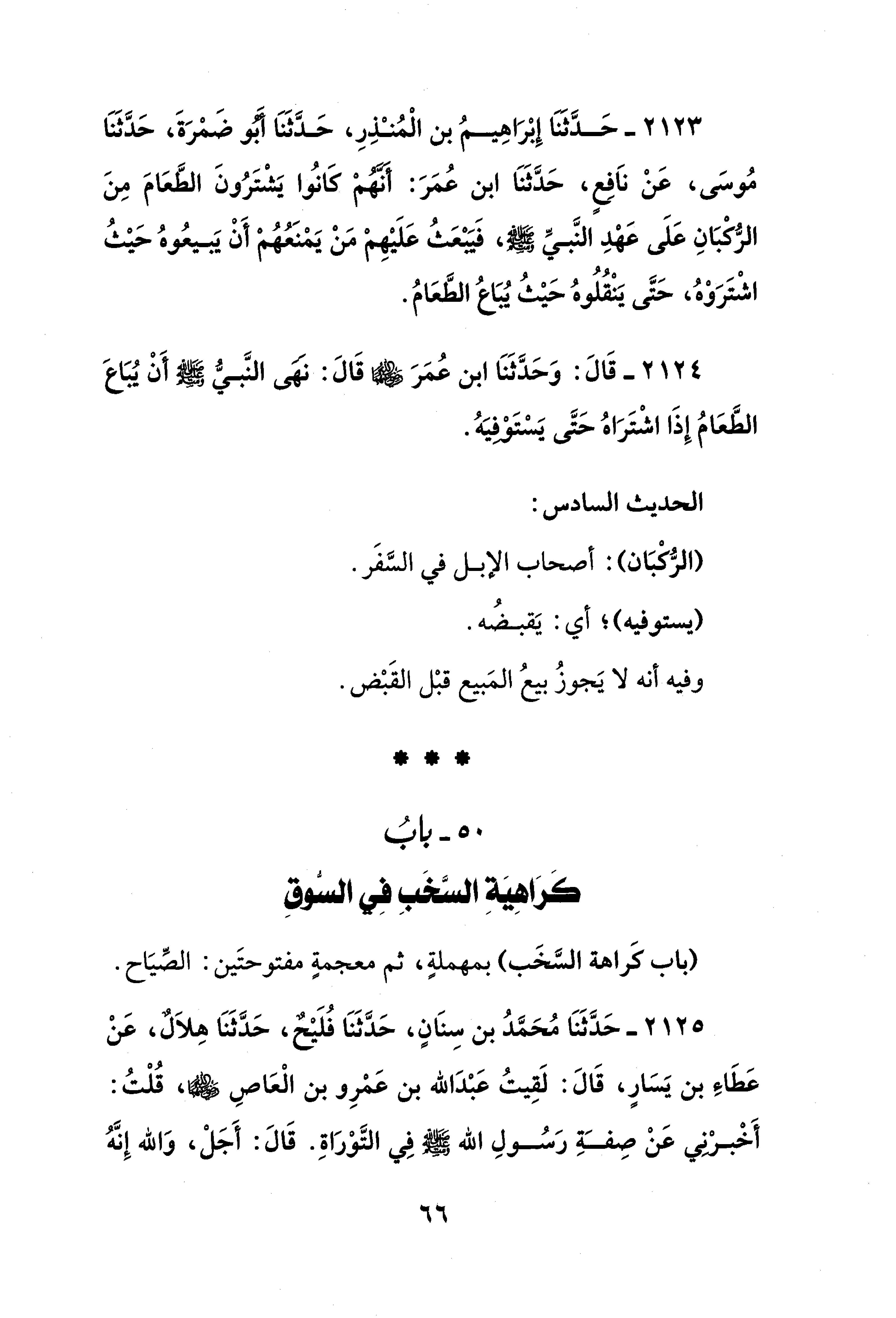 2123 - حَدَّثَنَا إِبْرَاهِيمُ بن الْمُنْذِرِ، حَدَّثنا أَبُو ضَمْرَةَ، حَدَّثَنَا مُوسَى، عَنْ ناَفِعٍ، حَدَّثَنَا ابن عُمَرَ: أنَّهُمْ كَانُوا يَشْتَرُونَ الطَّعَامَ مِنَ الرُّكْبَانِ عَلَى عَهْدِ النَّبيِّ - صلى الله عليه وسلم -، فَيَبْعَثُ عَلَيْهِمْ مَنْ يَمْنَعُهُمْ أَنْ يَبيعُوهُ حَيْثُ اشْتَرَوْهُ، حَتَّى يَنْقُلُوهُ حَيْثُ يُبَاعُ الطَّعَامُ.