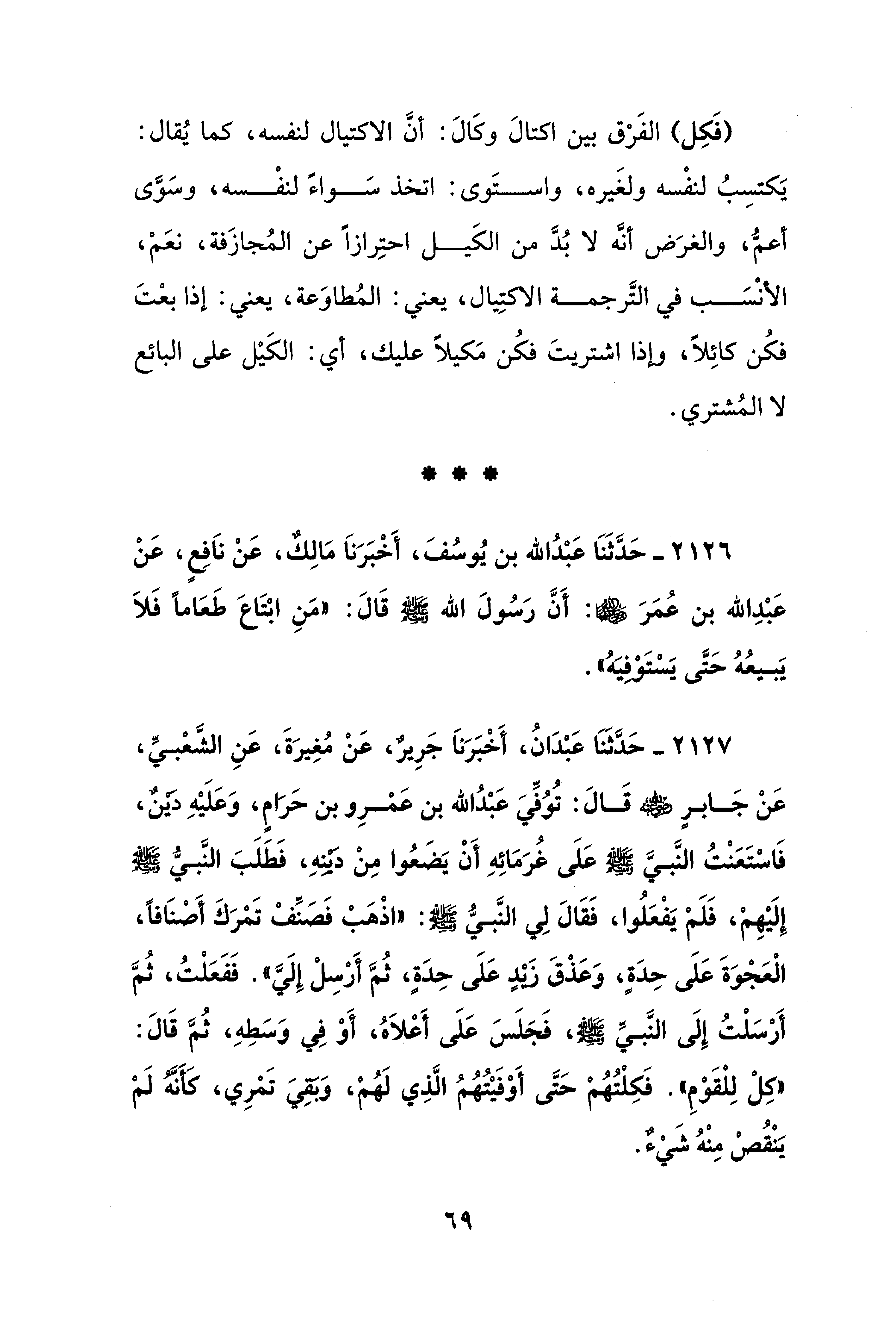 2126 - حَدَّثَنَا عَبْدُ الله بن يُوسُفَ، أَخْبَرَناَ مَالِكٌ، عَنْ ناَفِعٍ، عَنْ عَبْدِ الله بن عُمَرَ - رضي الله عنهما -: أَنَّ رَسُولَ الله - صلى الله عليه وسلم - قَالَ: "مَنِ ابْتَاعَ طَعَامًا فَلاَ يَبيعُهُ حَتَّى يَسْتَوْفِيَهُ".