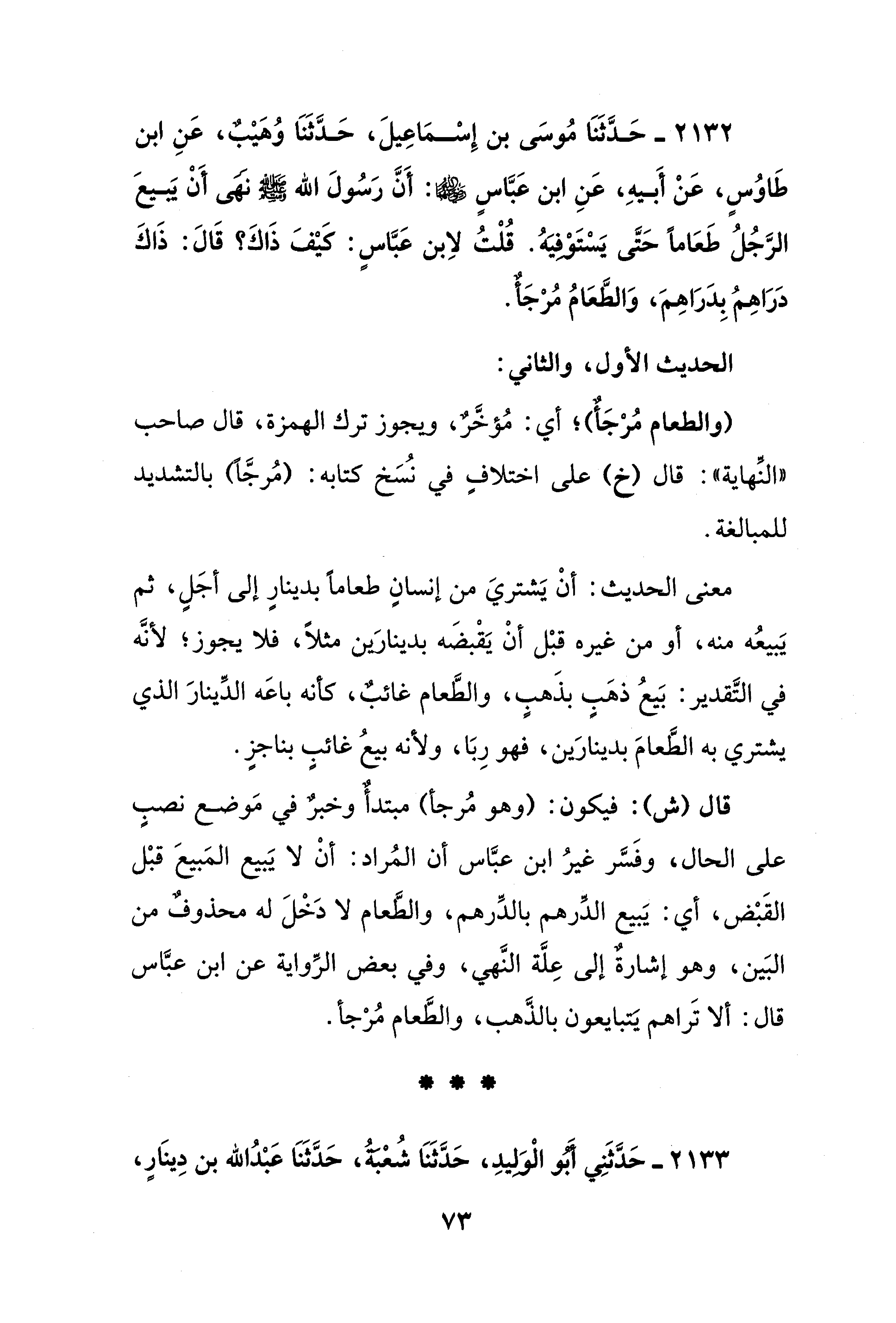 2132 - حَدَّثَنَا مُوسَى بن إِسْمَاعِيلَ، حَدَّثَنَا وُهَيْبٌ، عَنِ ابن طَاوُسٍ، عَنْ أَبيهِ، عَنِ ابن عَبَّاسٍ - رضي الله عنهما -: أَنَّ رَسُولَ الله - صلى الله عليه وسلم - نَهَى أَنْ يَبَيعَ الرَّجُلُ طَعَامًا حَتَّى يَسْتَوْفِيَهُ. قُلْتُ لاِبن عَبَّاسٍ: كَيْفَ ذَاكَ؟ قَالَ: ذَاكَ دَرَاهِمُ بِدَرَاهِمَ، وَالطَّعَامُ مُرْجَأٌ.