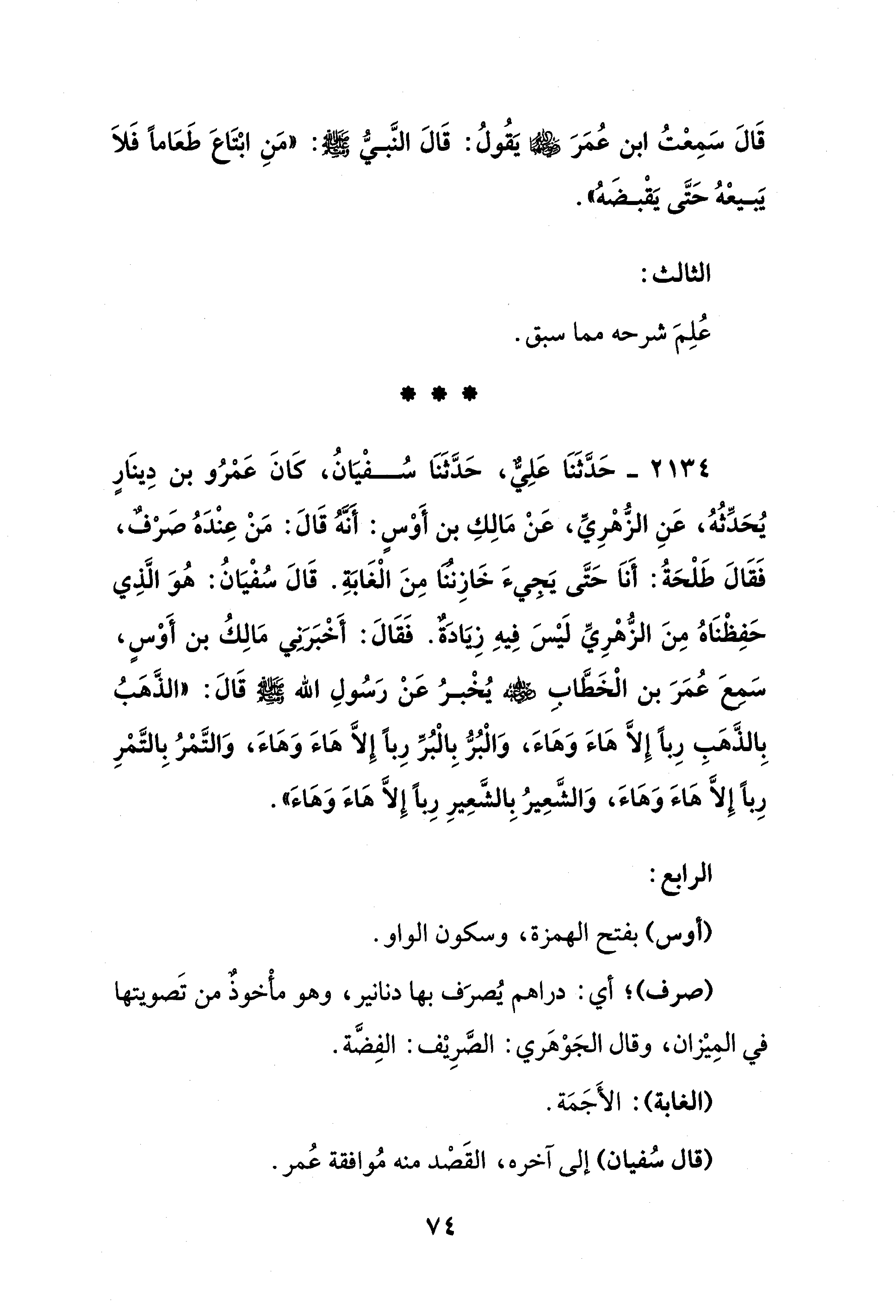 2134 - حَدَّثَنَا عَلِيٌّ، حَدَّثَنَا سُفْيَانُ، كَانَ عَمْرُو بن دِينَارٍ يُحَدِّثُهُ، عَنِ الزُّهْرِيِّ، عَنْ مَالِكِ بن أَوْسٍ: أنَّهُ قَالَ: مَنْ عِنْدَهُ صَرْفٌ، فَقَالَ طَلْحَةُ: أَناَ حَتَّى يَجيءَ خَازِنُنَا مِنَ الْغَابَةِ. قَالَ سُفْيَانُ: هُوَ الَّذِي حَفِظْنَاهُ مِنَ الزُّهْرِيِّ لَيْسَ فِيهِ زِيَادَةٌ. فَقَالَ: أَخْبَرَنِي مَالِكُ بن أَوْسٍ، سَمِعَ عُمَرَ بن الْخَطَّابِ - رضي الله عنه - يُخْبرُ عَنْ رَسُولِ الله - صلى الله عليه وسلم - قَالَ: "الذَّهَبُ بِالذَّهَبِ رِبًا إِلَّا هَاءَ وَهَاءَ، وَالْبُرُّ بِالْبُرِّ رِبًا إلَّا هَاءَ وَهَاءَ، وَالتَّمْرُ بِالتَّمْرِ رِبًا إِلَّا هَاءَ وَهَاءَ، وَالشَّعِيرُ بِالشَّعِيرِ رِبًا إِلَّا هَاءَ وَهَاءَ".