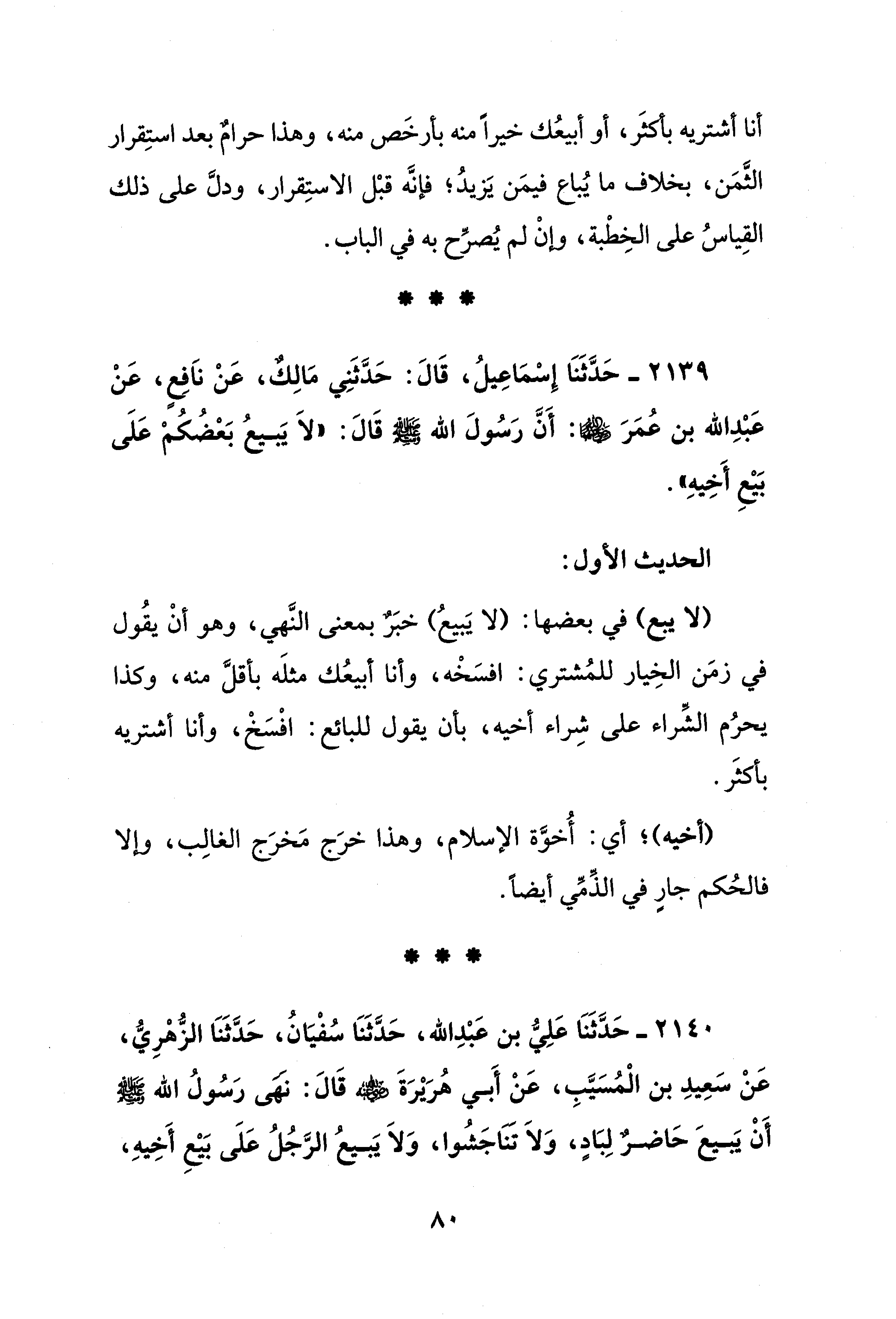 2139 - حَدَّثَنَا إِسْمَاعِيلُ، قَالَ: حَدَّثَنِي مَالِكٌ، عَنْ ناَفِعٍ، عَنْ عَبْدِ الله بن عُمَرَ - رضي الله عنه -: أَنَّ رَسُولَ الله - صلى الله عليه وسلم - قَالَ: "لاَ يَبيعُ بَعْضُكُمْ عَلَى بَيْعِ أَخِيهِ".